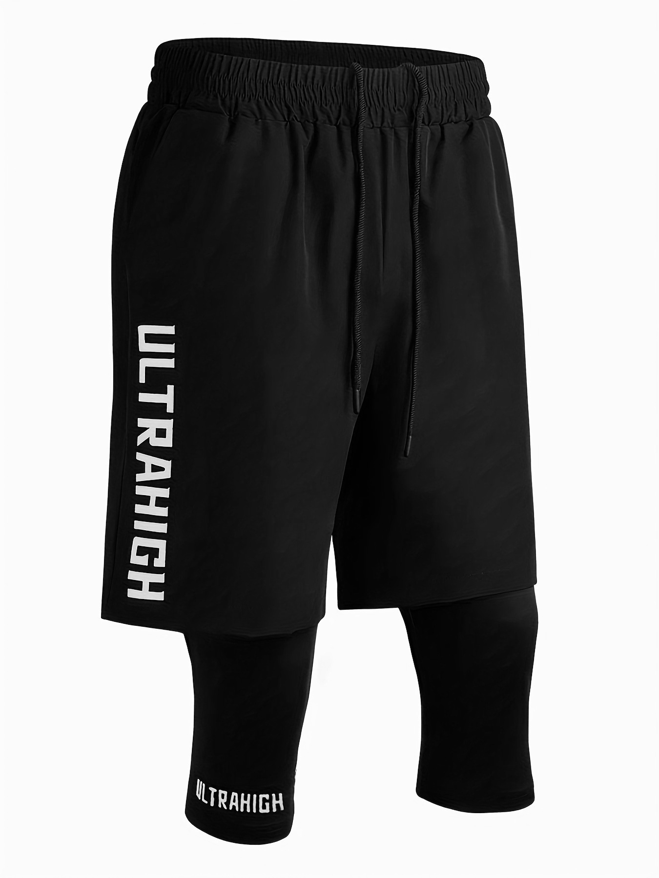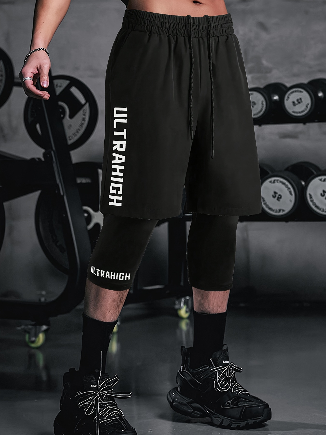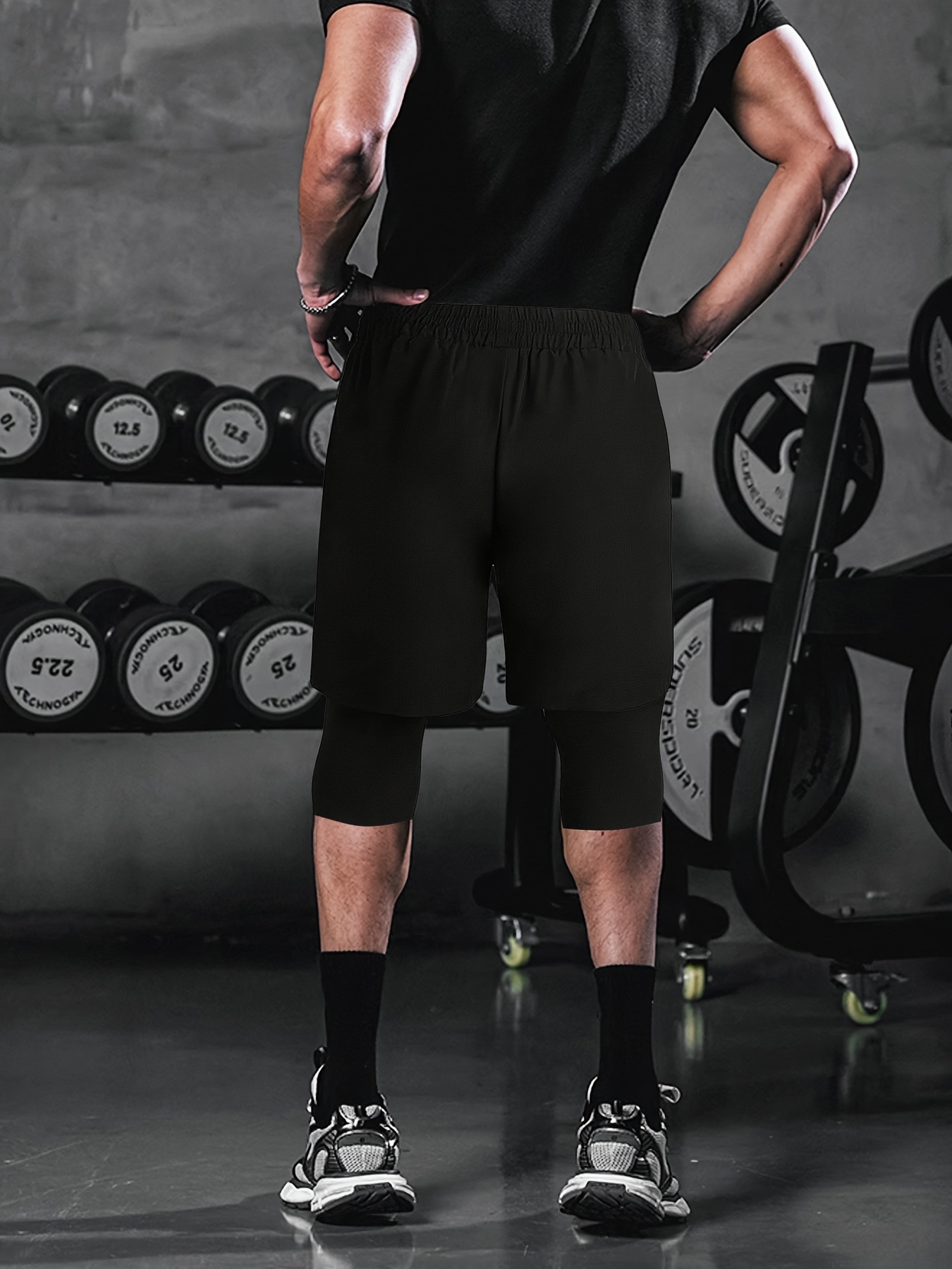 국경 간 남성 여름 탄성 피트니스 더블 레이어 스포츠 반바지 농구 가짜 투피스 타이트 러닝 바지 캐주얼 속건성