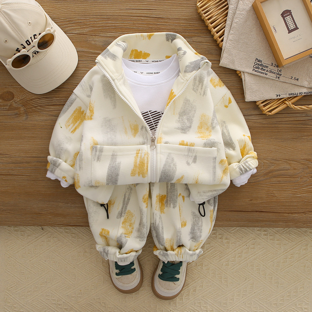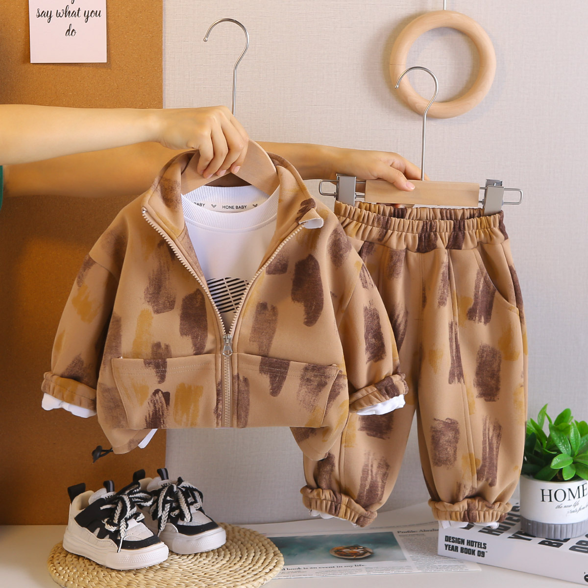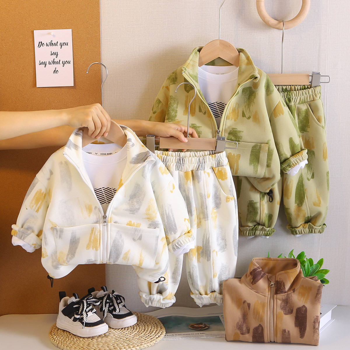 어린이 봄, 가을 정장 2025 새로운 소년 대비 색상 하이 넥 긴팔 3 피스 캐주얼 스포츠 의류 아동 의류스토어 가기