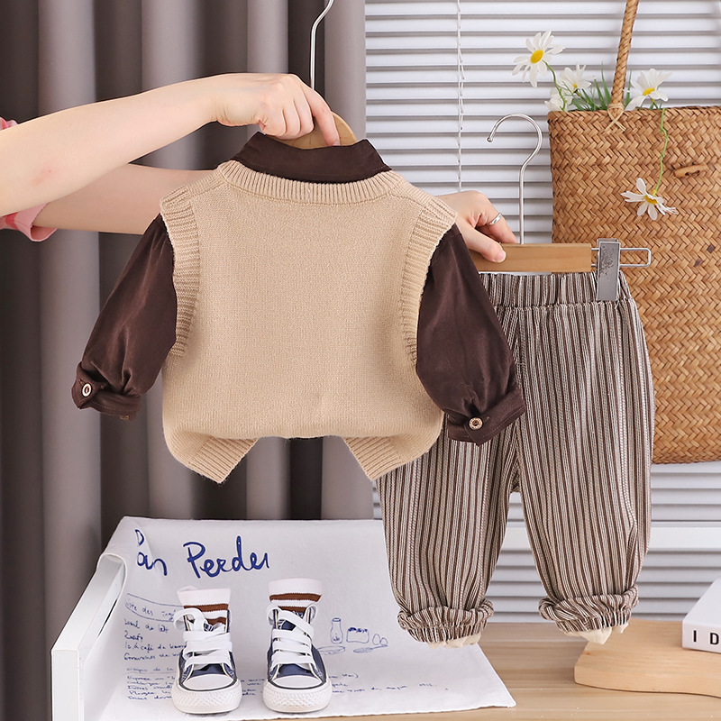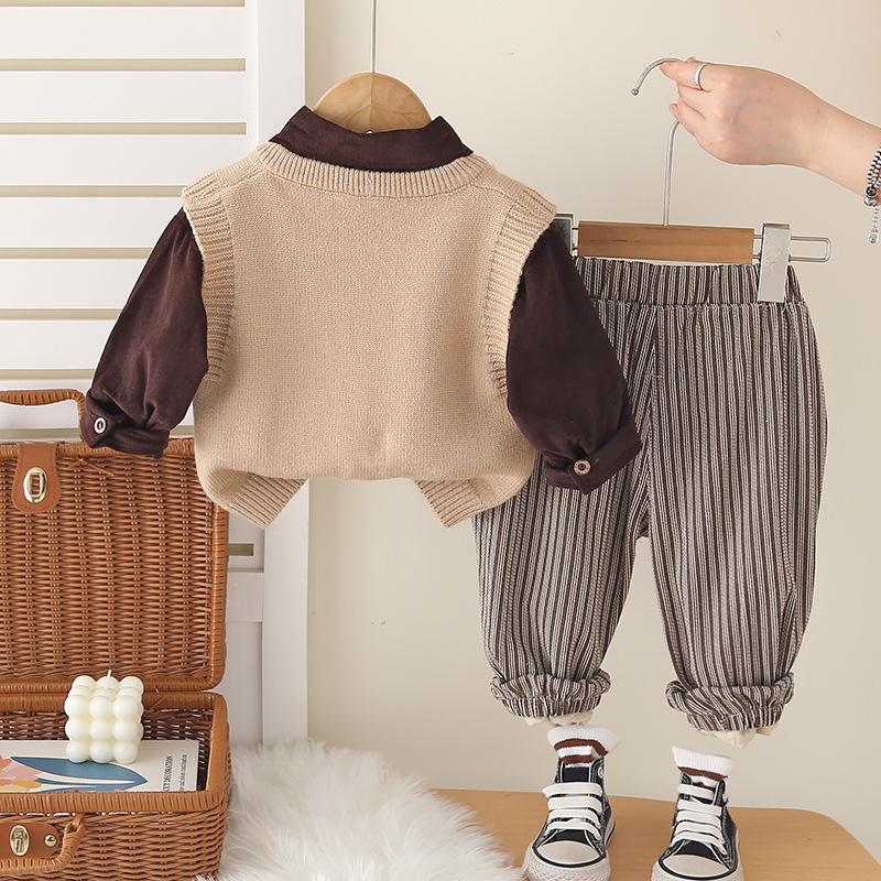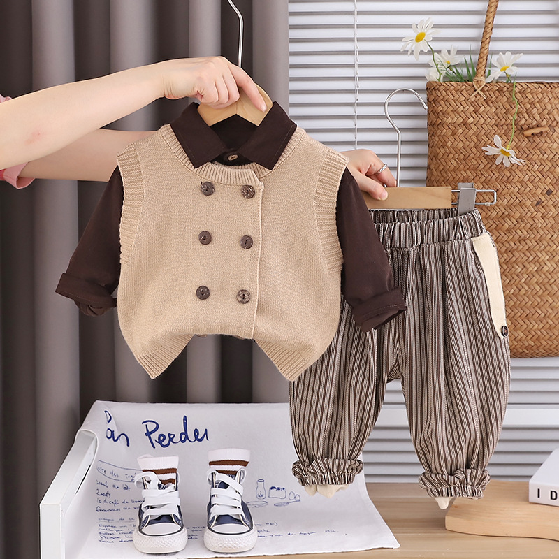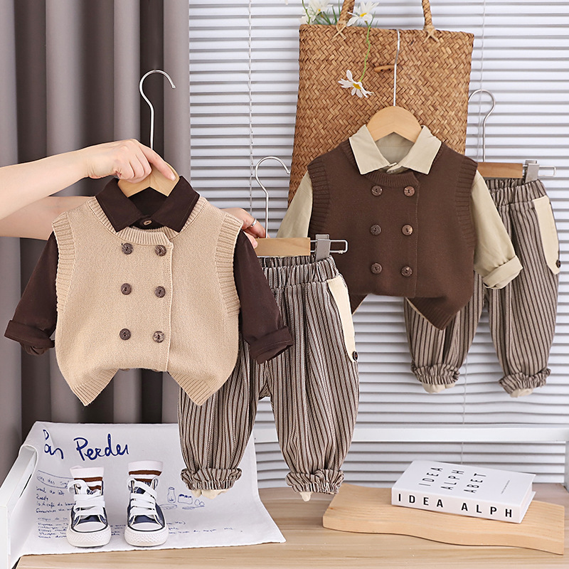 트렌디 소년 가을 옷 2025 새로운 어린이 소년 더블 브레스트 니트 조끼 캐주얼 셔츠 3 피스 세트스토어 가기