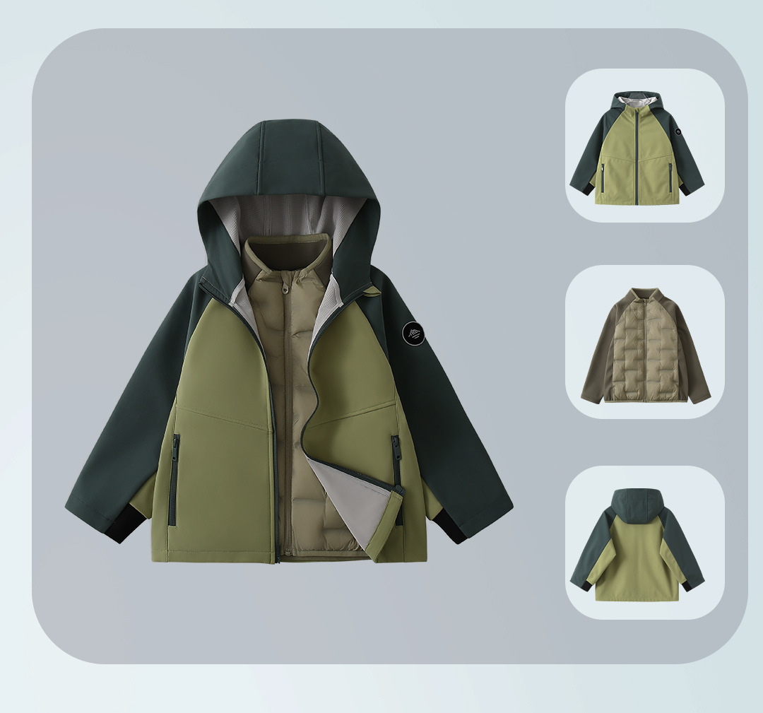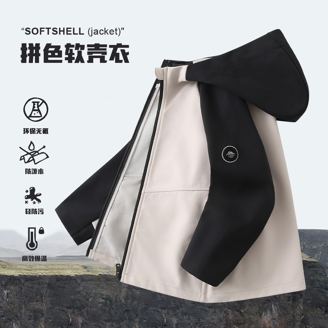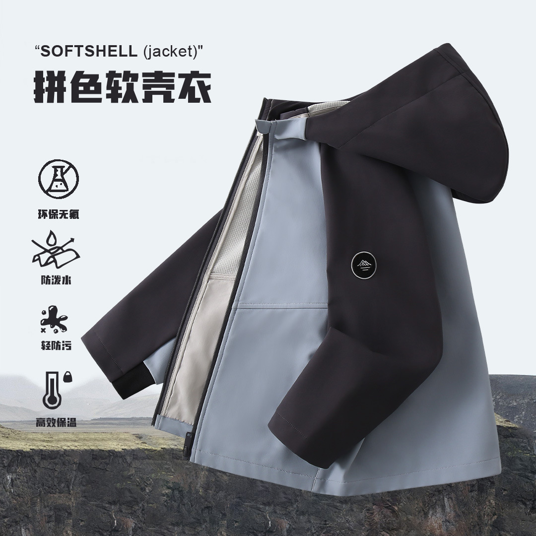 큰 브랜드 야외 소프트 쉘 재킷 어린이 가을, 겨울 새로운 유행 방풍 및 방수 컬러 매칭 작업 재킷 도매스토어 가기