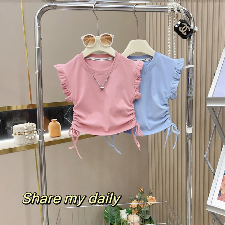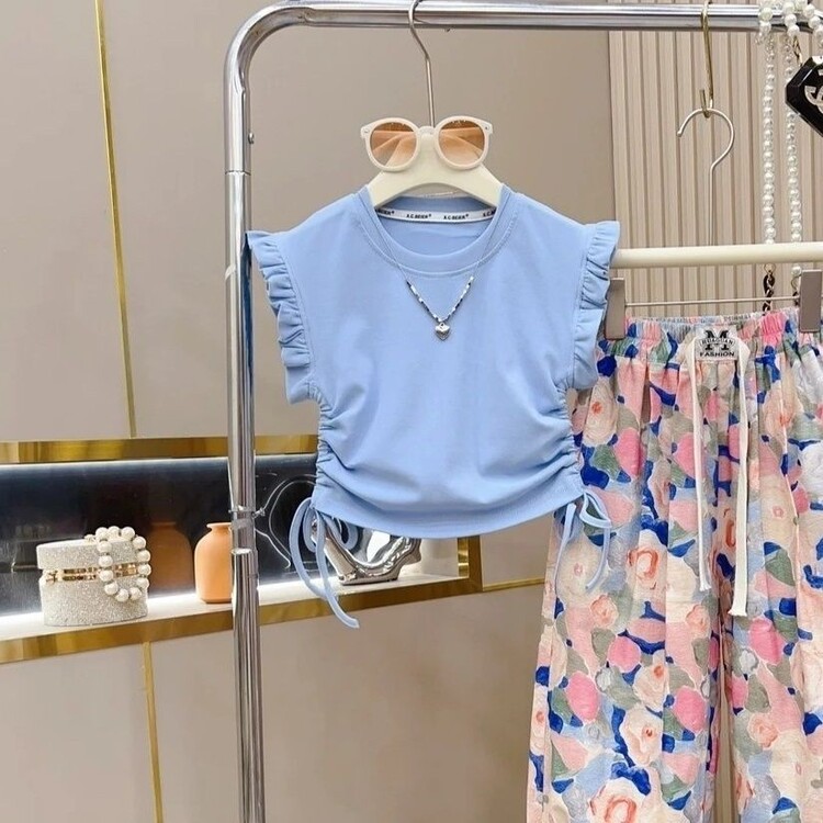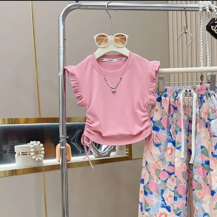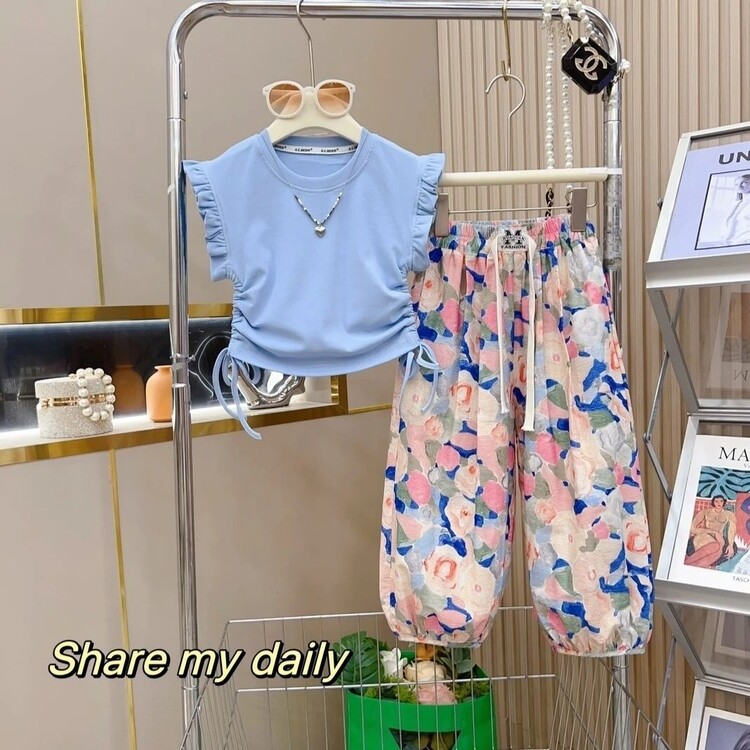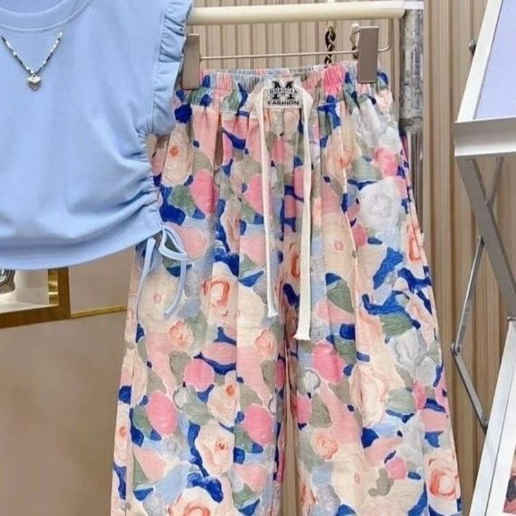 여아 여름 중대형 아동복 한국식 서양식 귀 티셔츠 유화 꽃무늬 바지 루즈한 투피스 세트스토어 가기