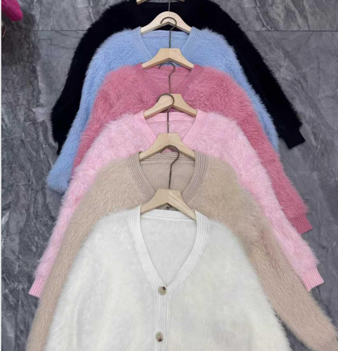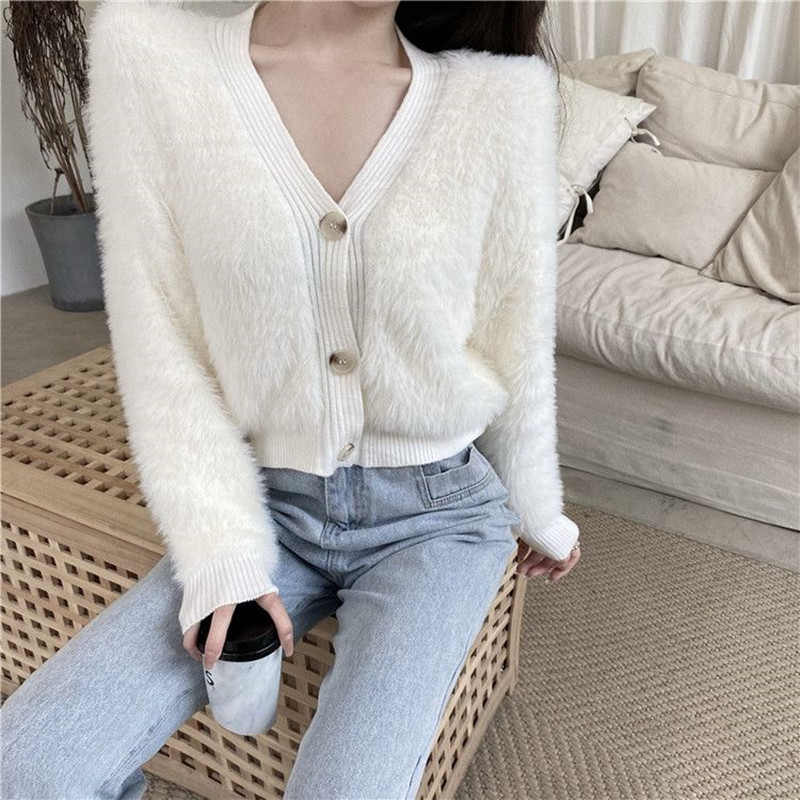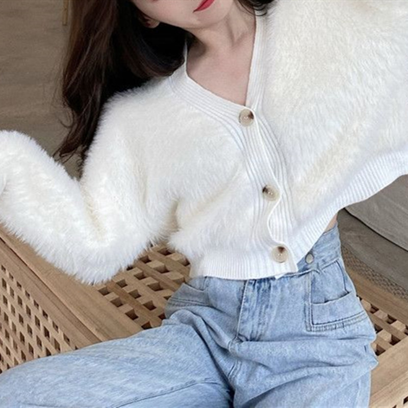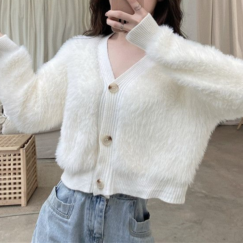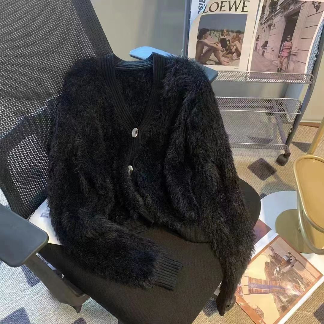 여성을위한 한국 스타일 v 넥 스플 라이스 스웨터 2025 봄, 가을, 겨울 새로운 플러시 느슨한 짧은 싱글 브레스트 긴팔 탑스토어 가기
