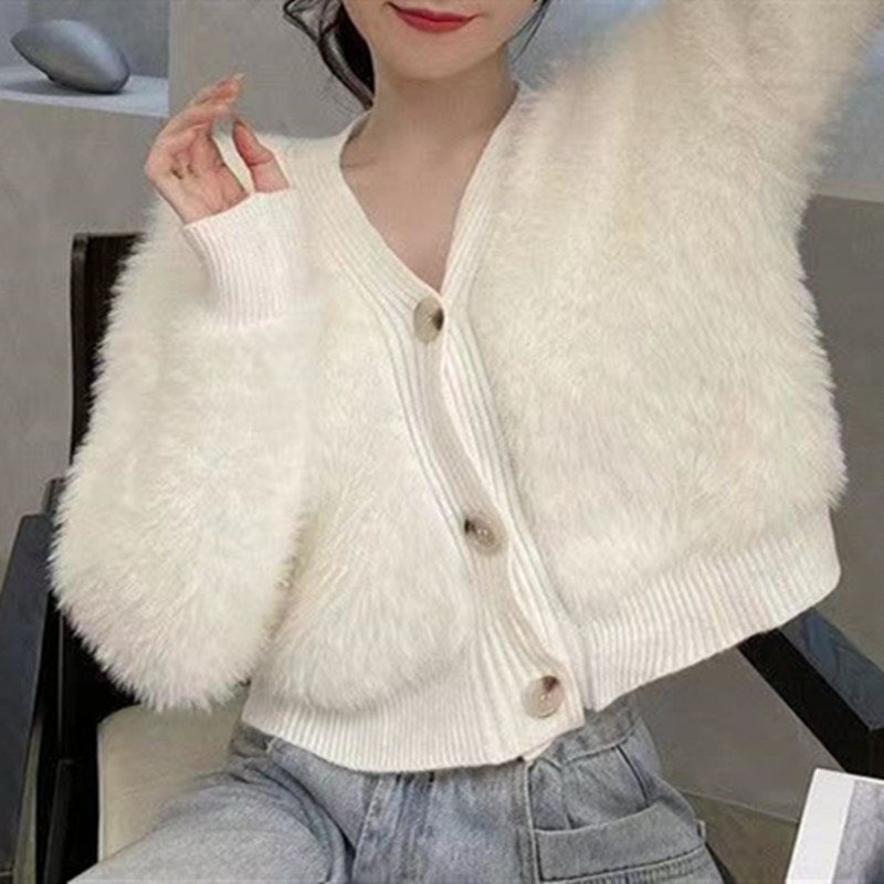 여성을위한 한국 스타일 v 넥 스플 라이스 스웨터 2025 봄, 가을, 겨울 새로운 플러시 느슨한 짧은 싱글 브레스트 긴팔 탑