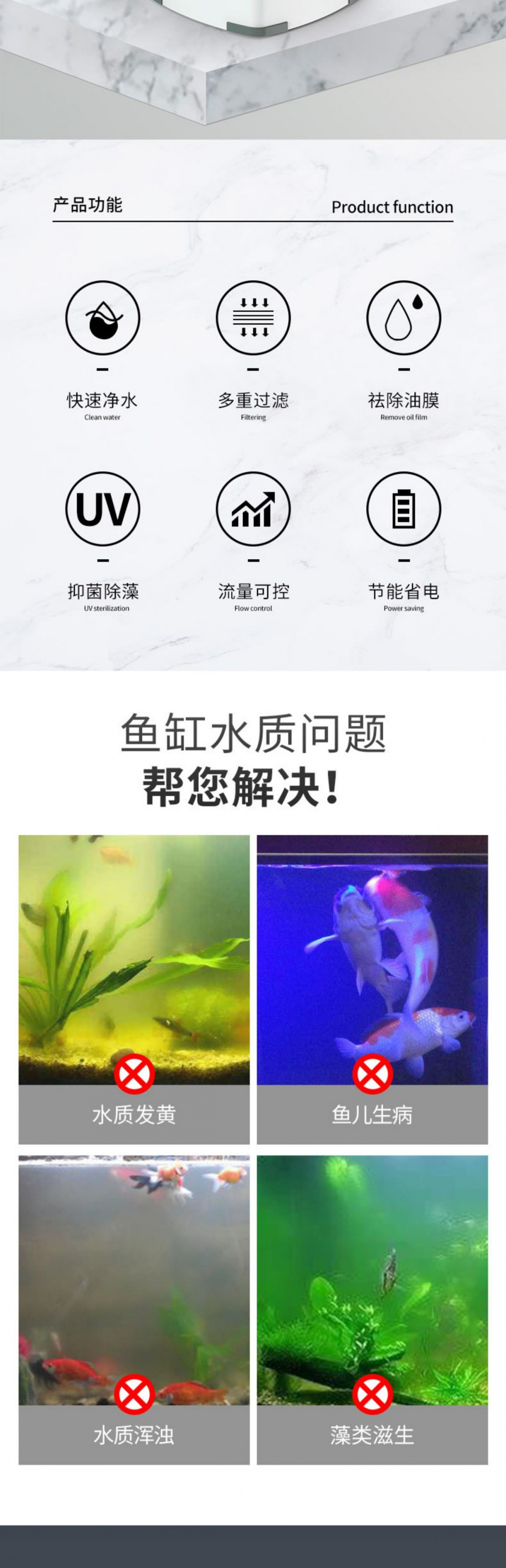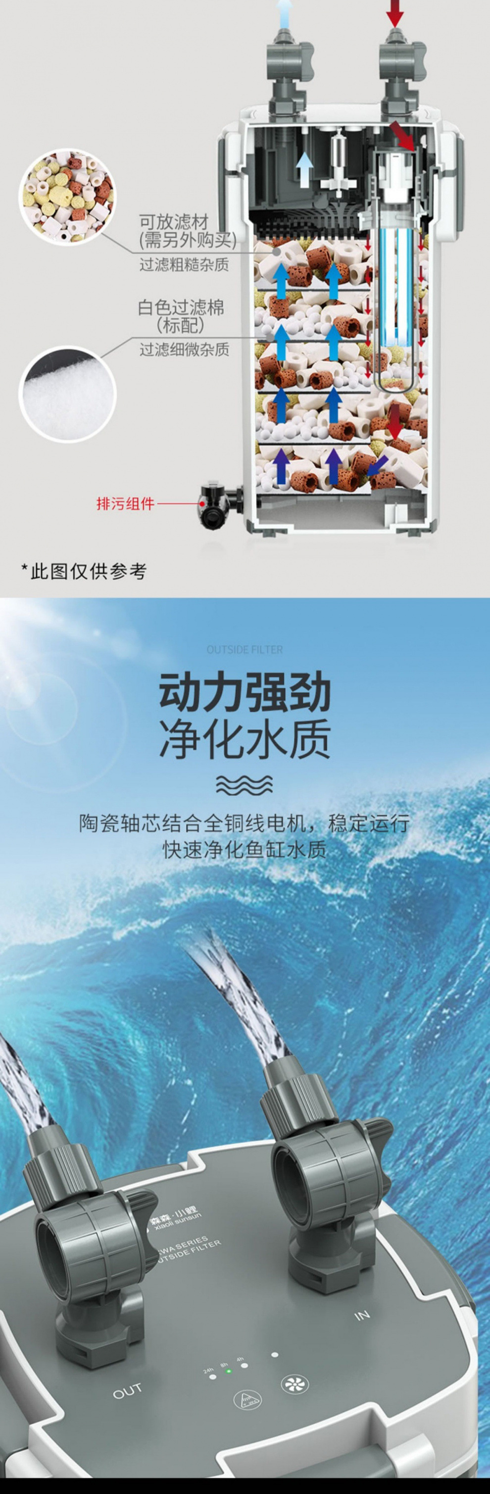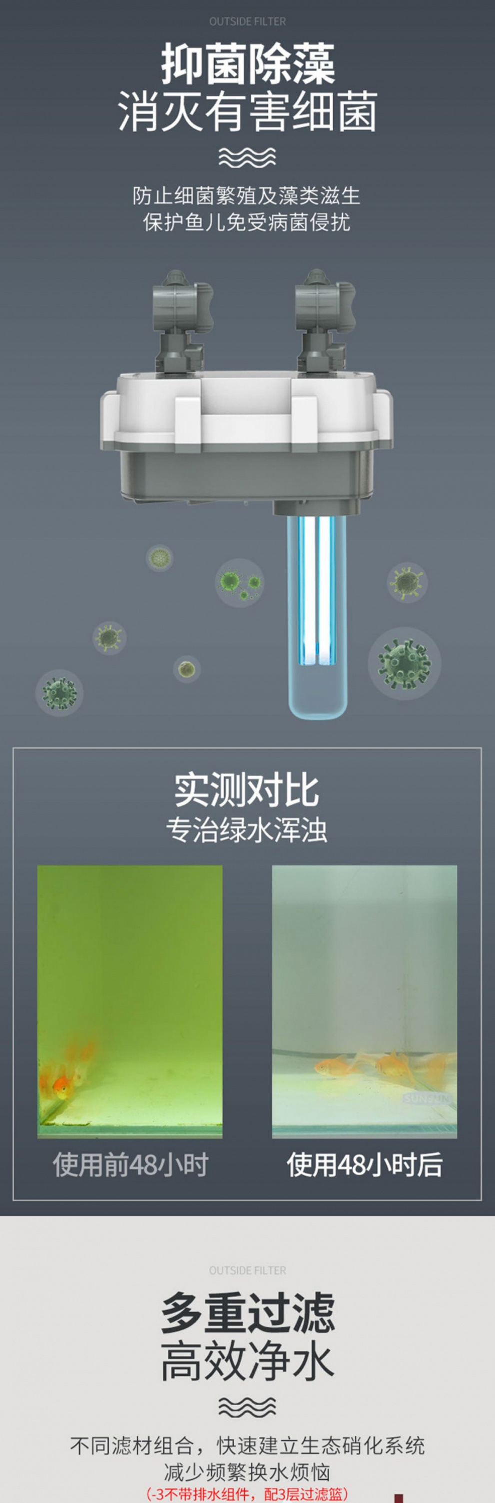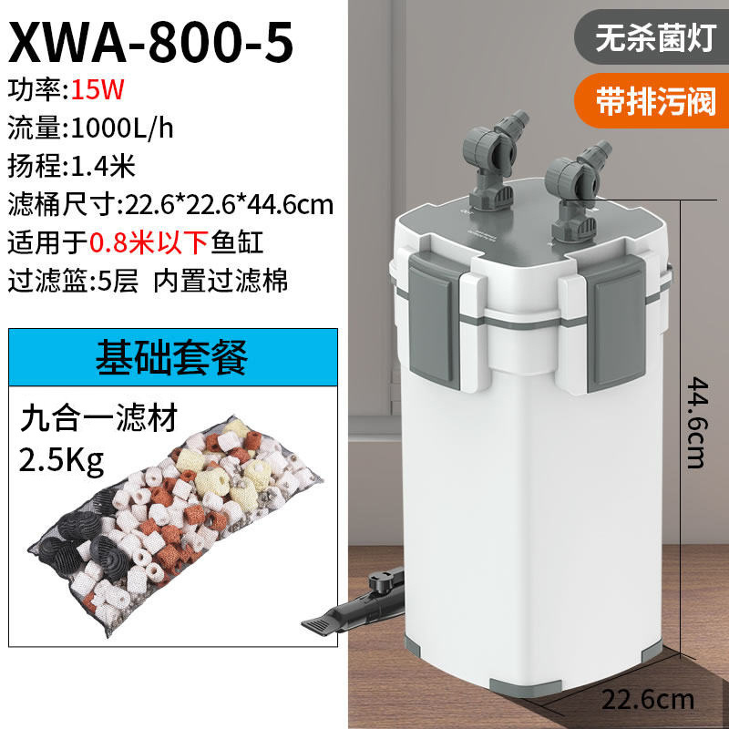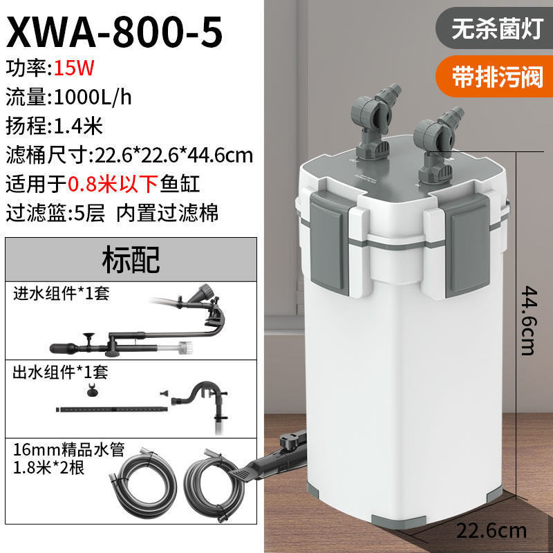 • 15W 살균 모델, 5중 여과, 배수구 포함(0.8 이하 수조에 적용 가능)