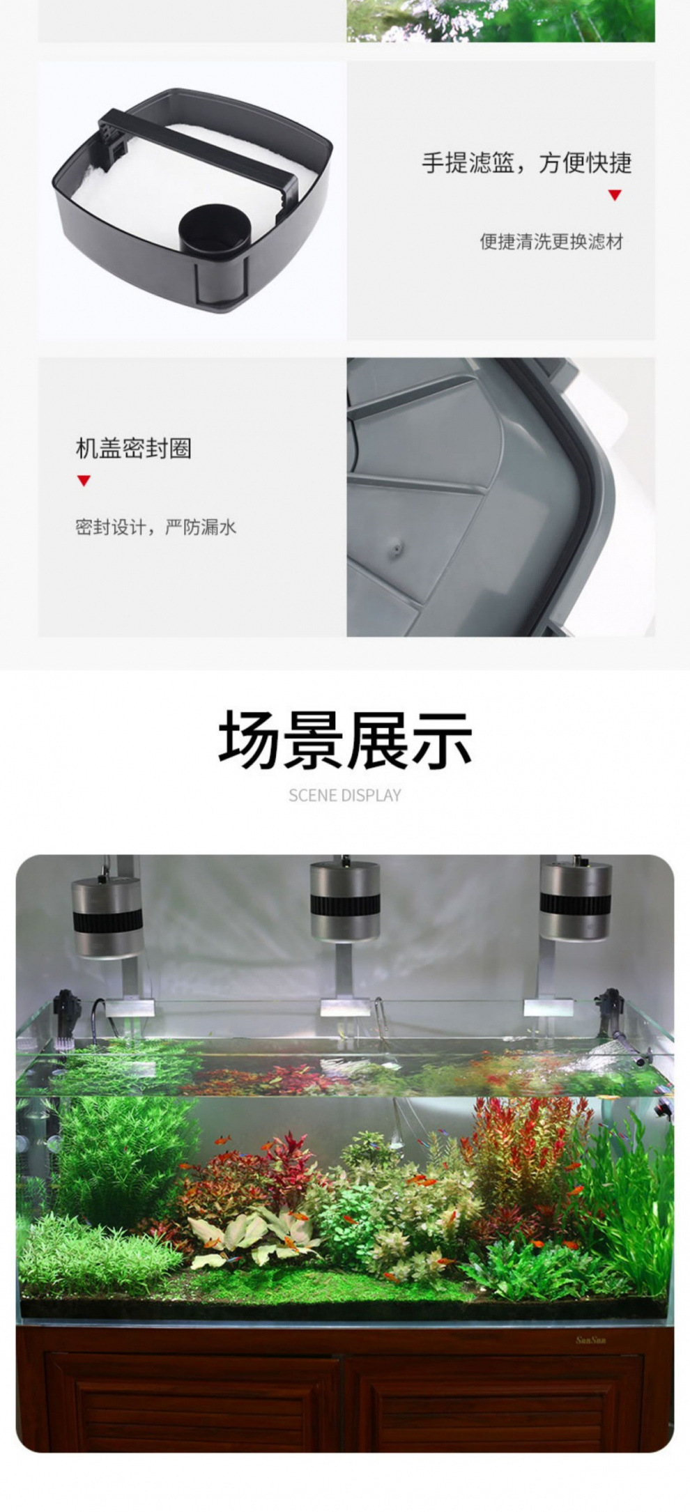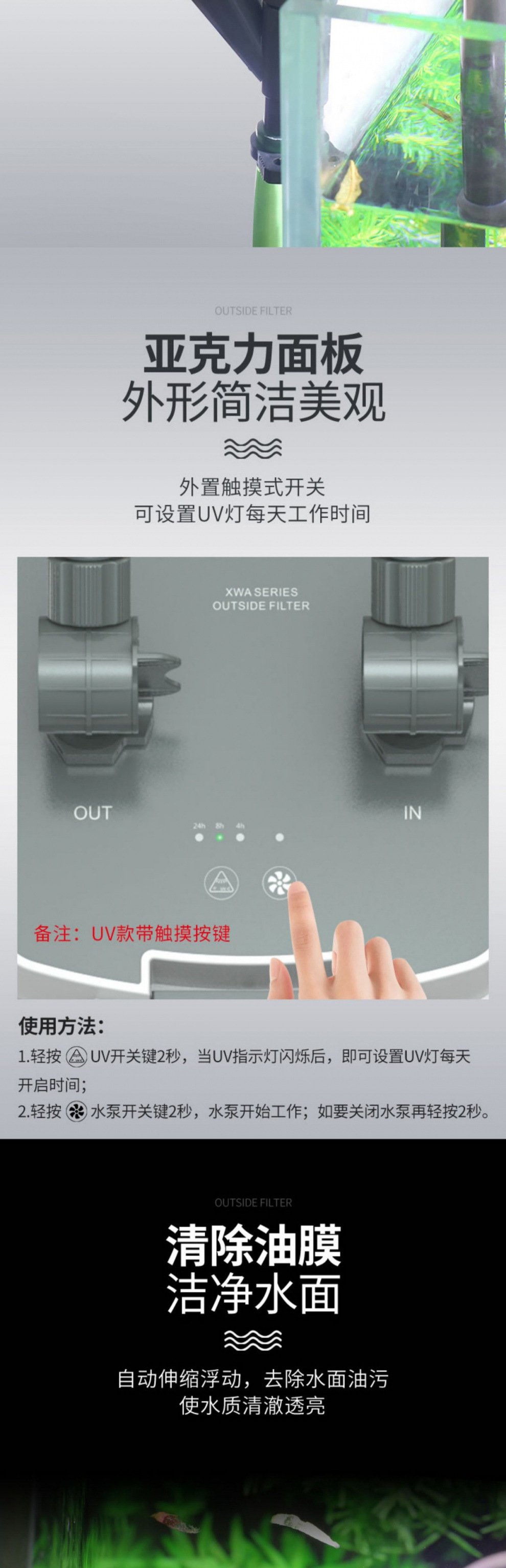 • 3중 여과 기능을 갖춘 15W 살균 모델(0.8 이하 수조에 적용 가능)