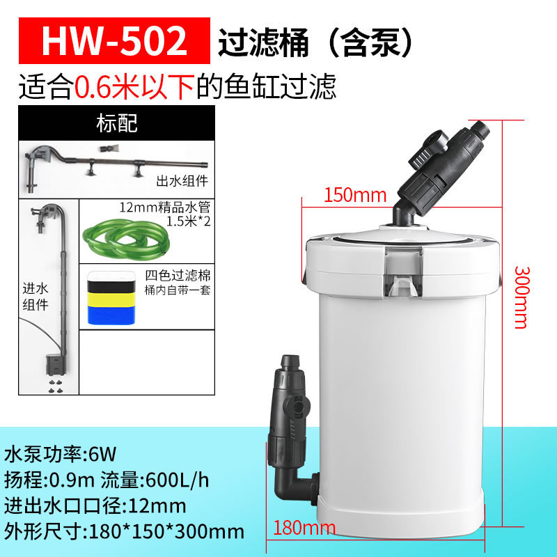 • HW-502(워터펌프 6W)는 0.6m 이하 수조의 여과에 적합합니다.