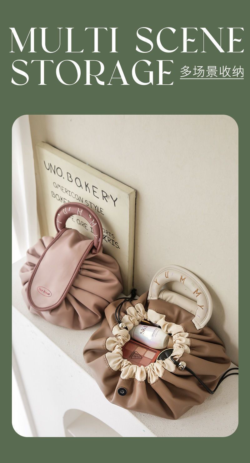 게으른 Drawstring 화장품 가방 대용량 휴대용 여행 세면 용품 보관 가방 두꺼운 PU 방수 메이크업 보관