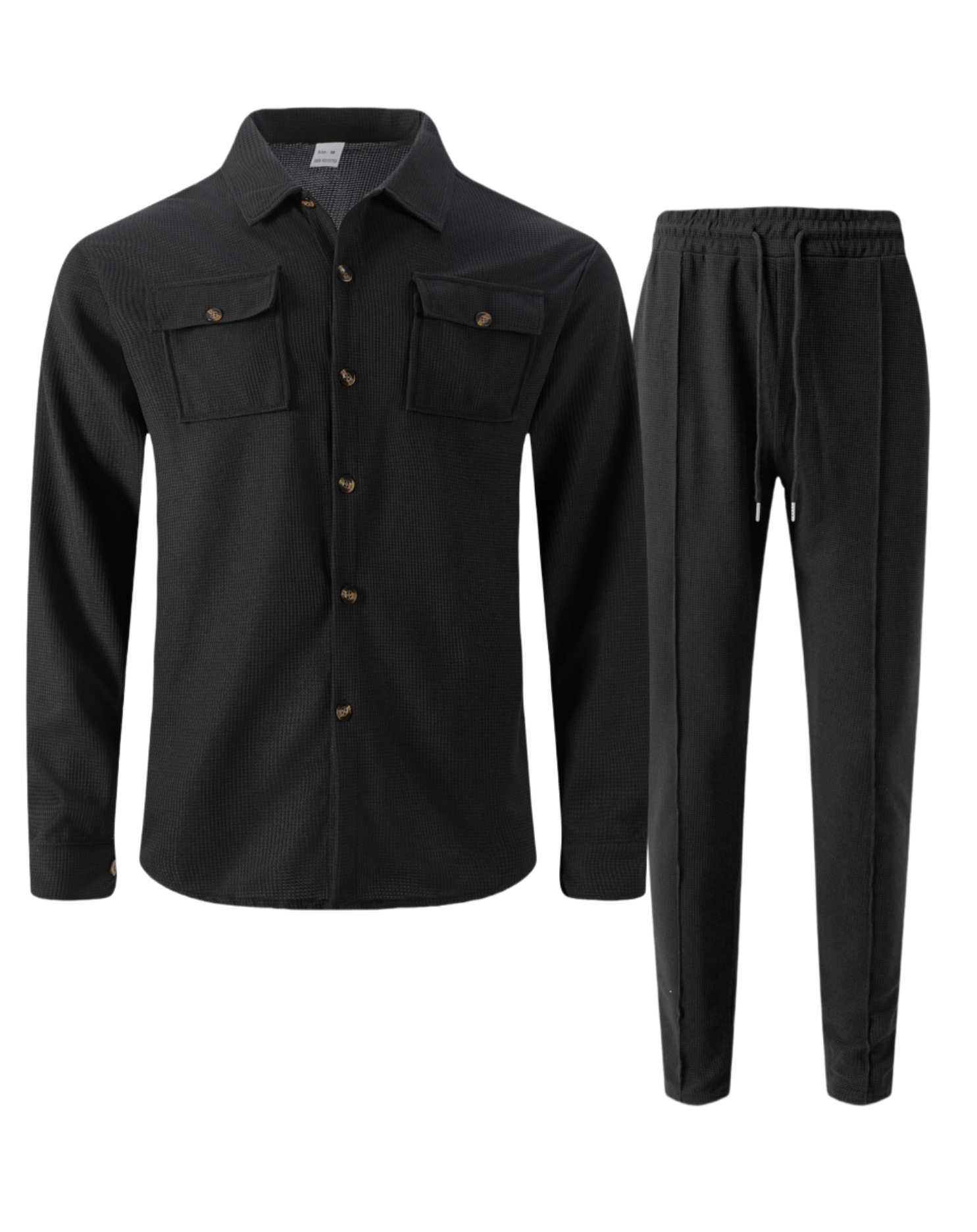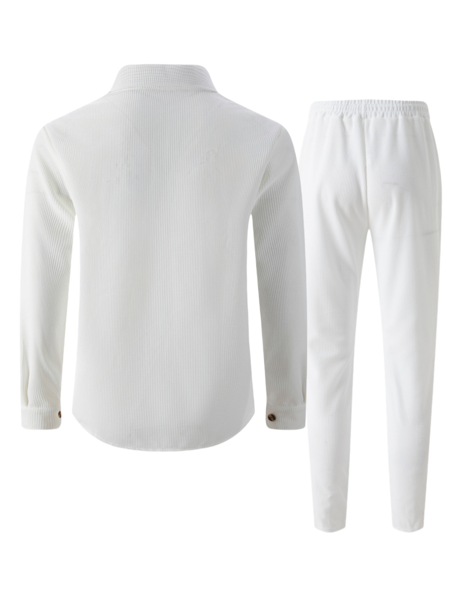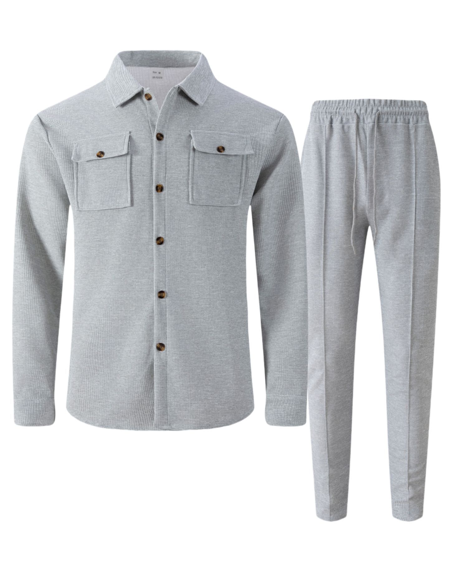 유럽 및 미국 가을 신상 남성 와플 긴팔 바지 캐주얼 더블 포켓 재킷 작업복 셔츠 세트