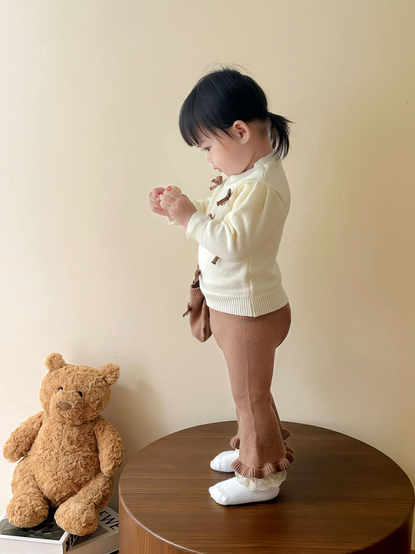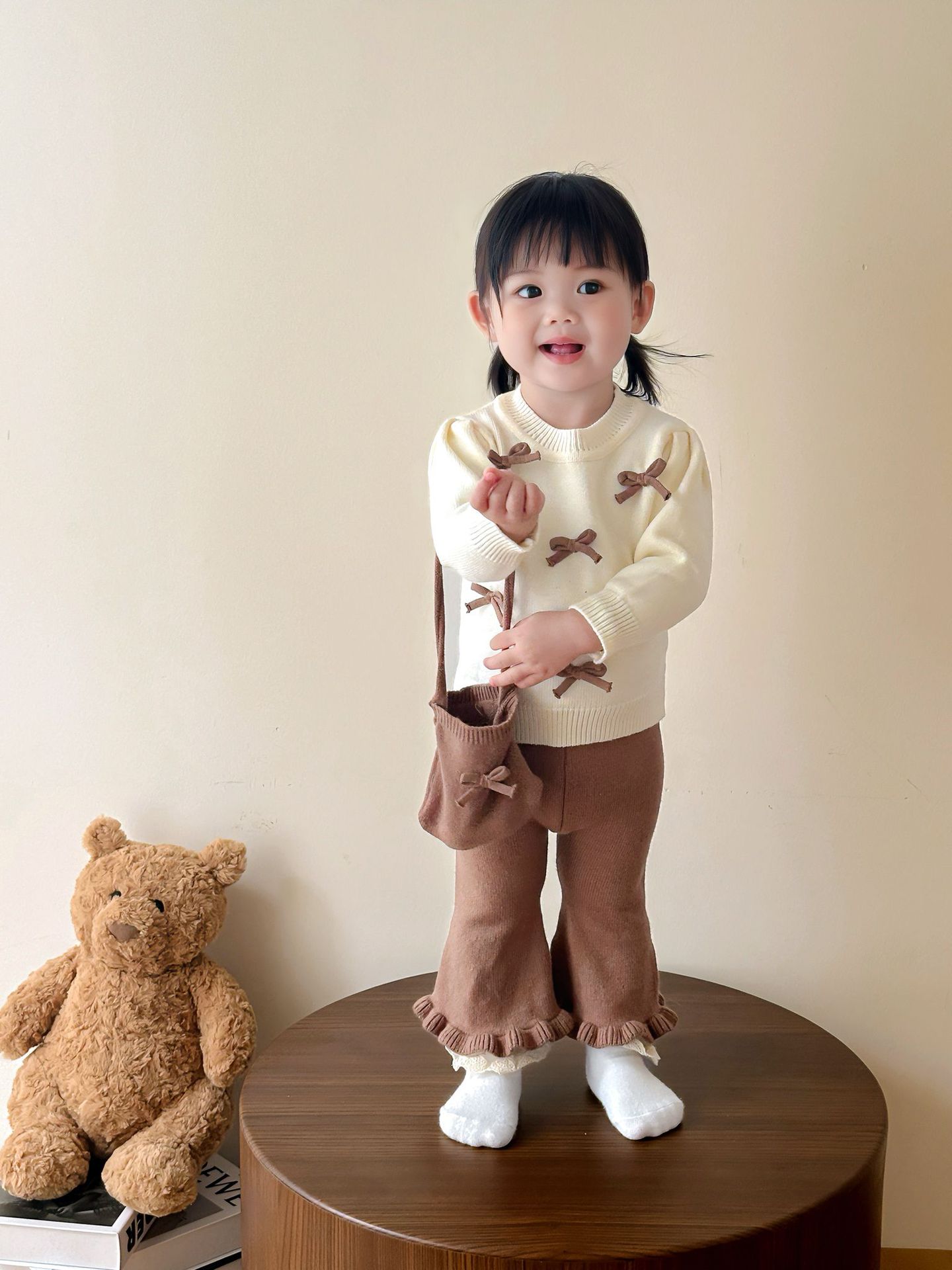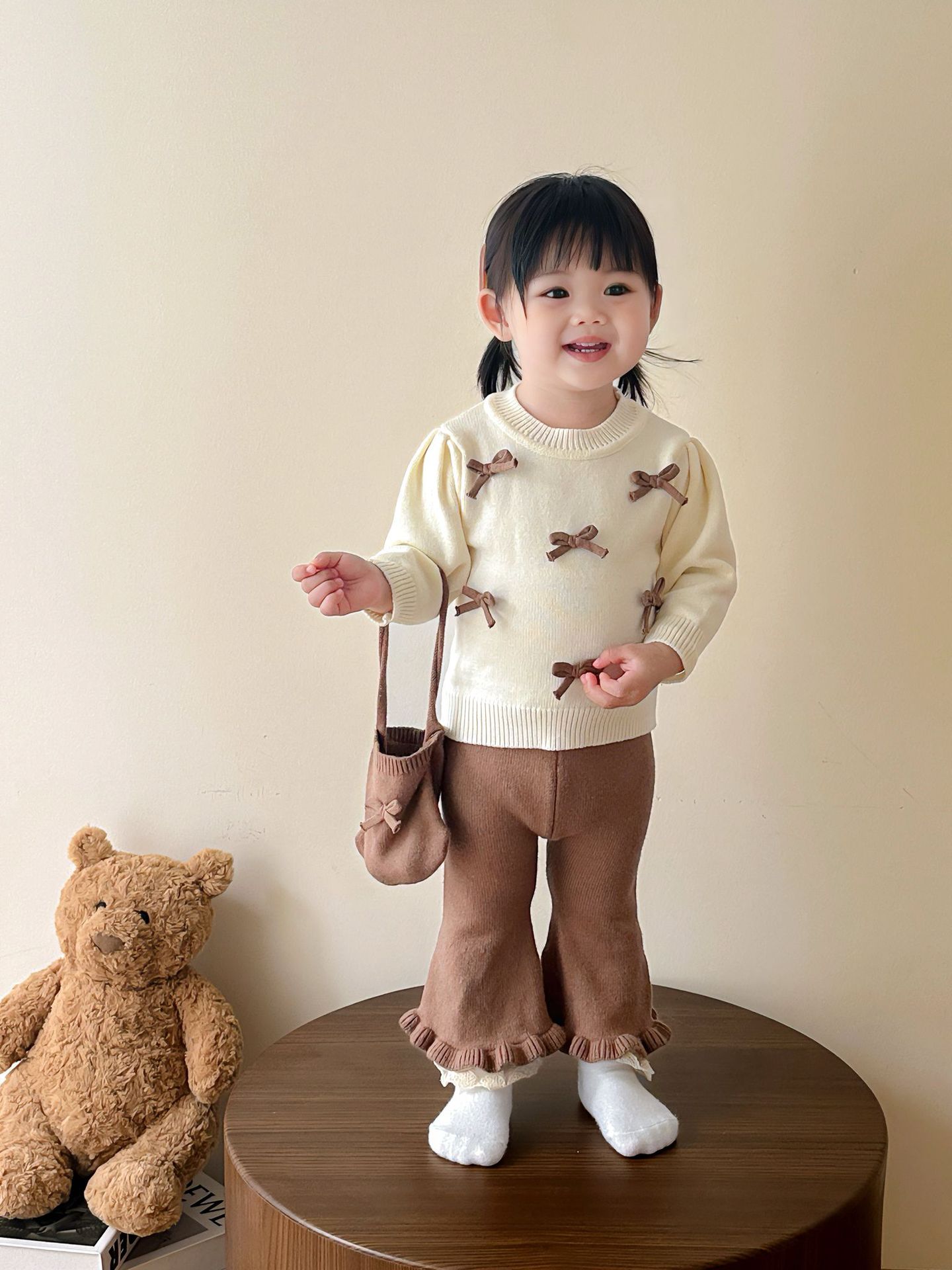 아기 소녀 스웨터 가을, 겨울 2025 스타일 보우 라운드 넥 탑 플레어 바지 귀여운 가방 3 피스 세트스토어 가기
