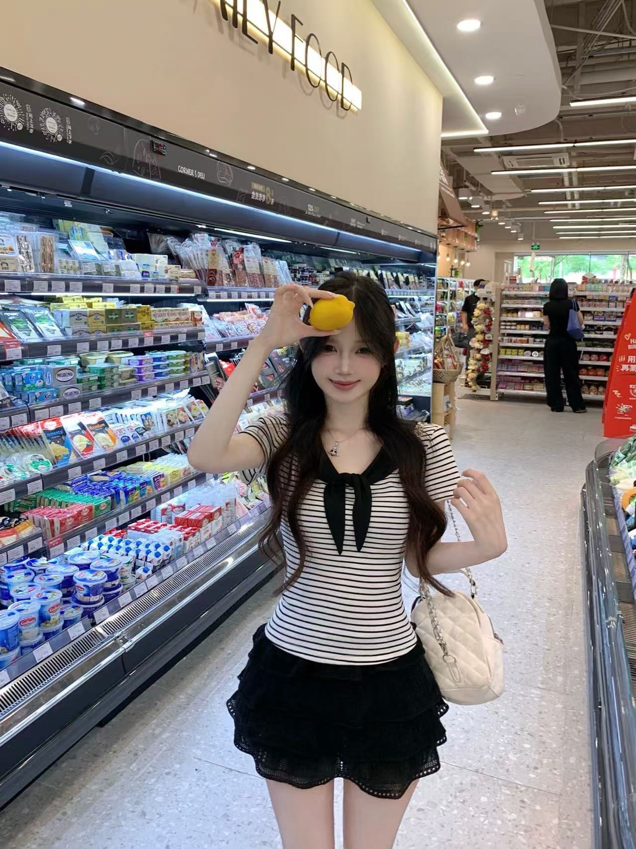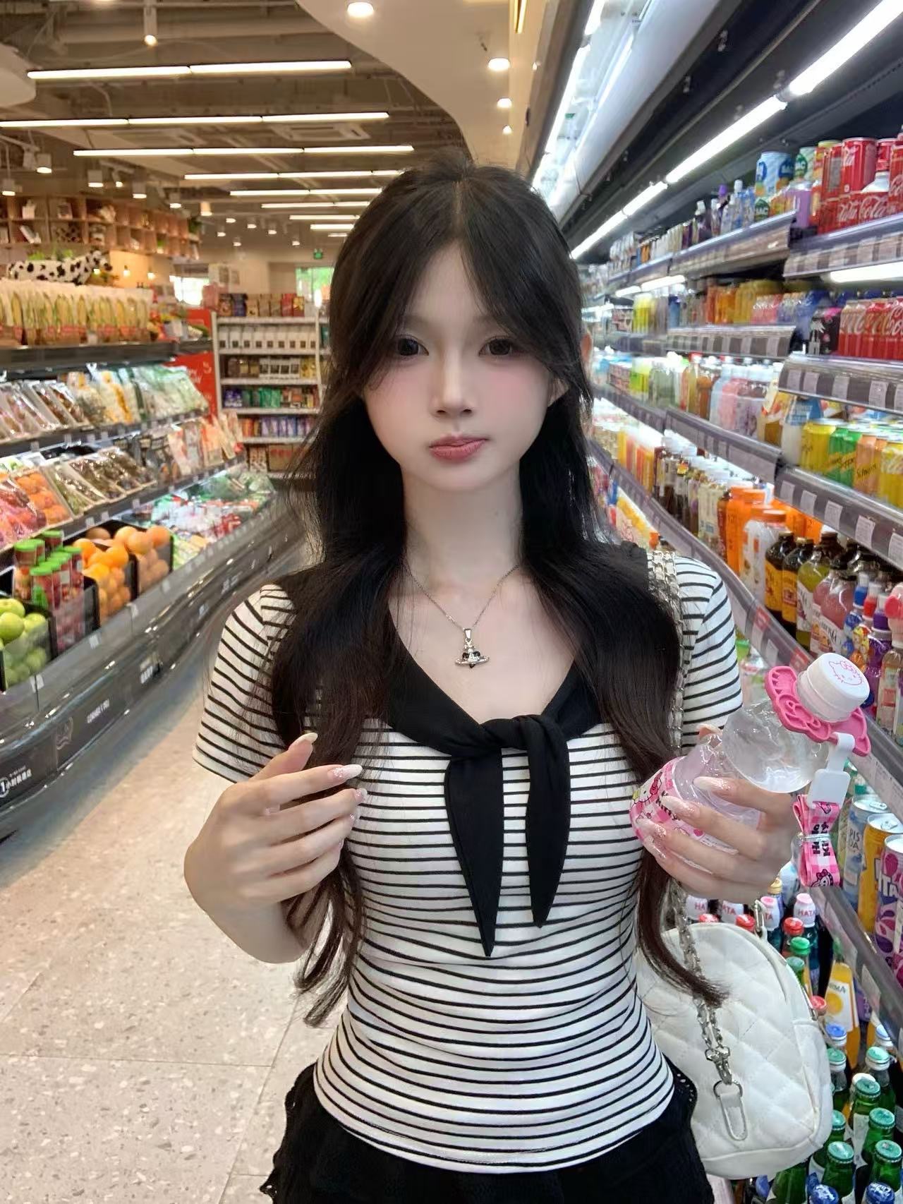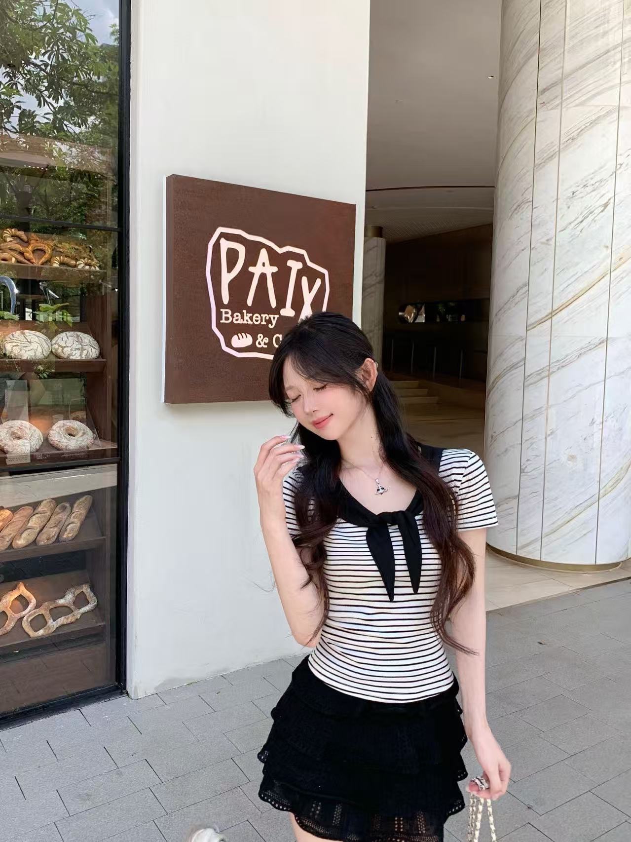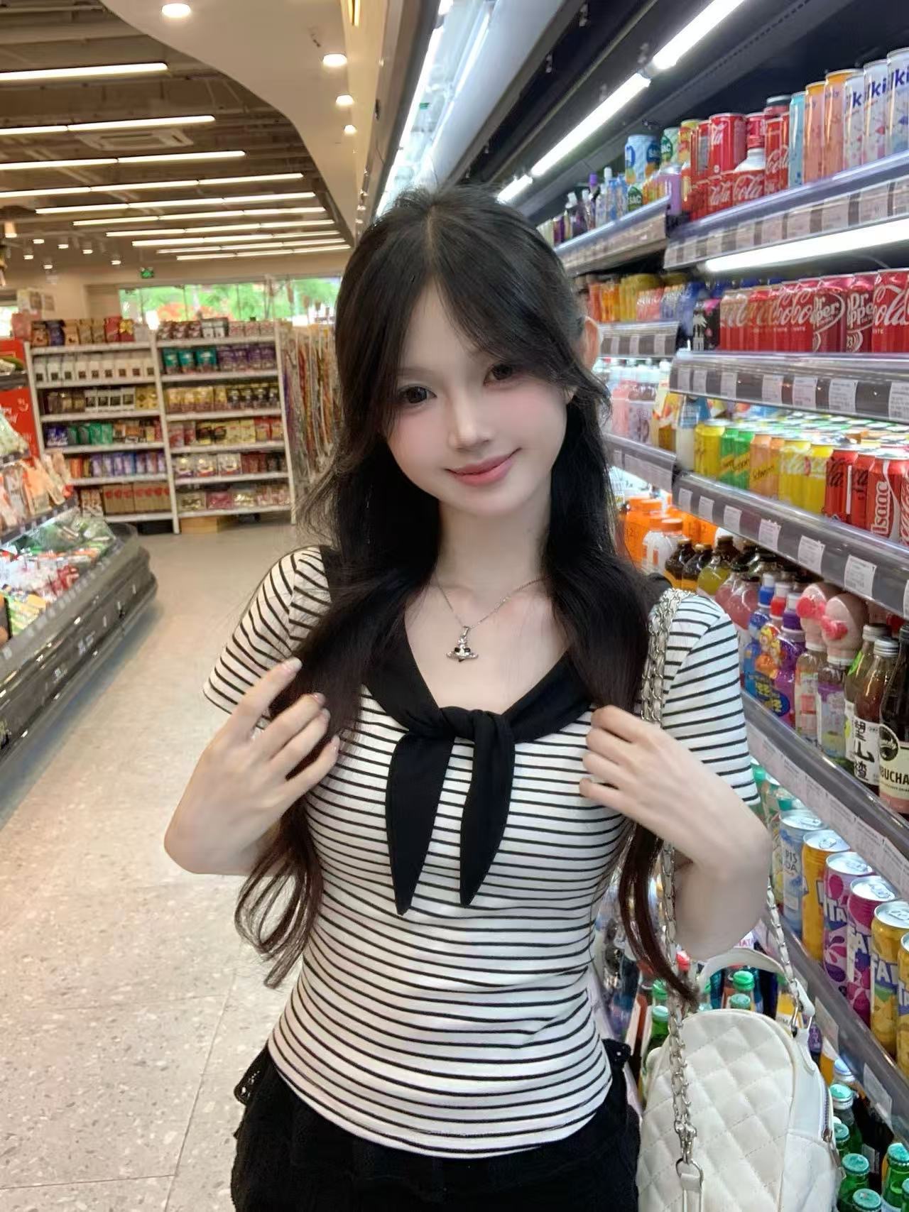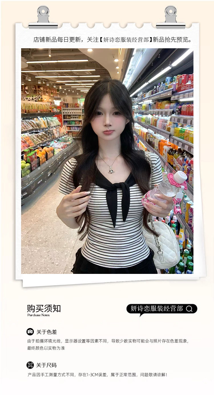 달콤한 스타일 대비 스트라이프 네이비 칼라 반팔 티셔츠 여성 여름 한국 스타일 틈새 시크 슬리밍 탑스토어 가기