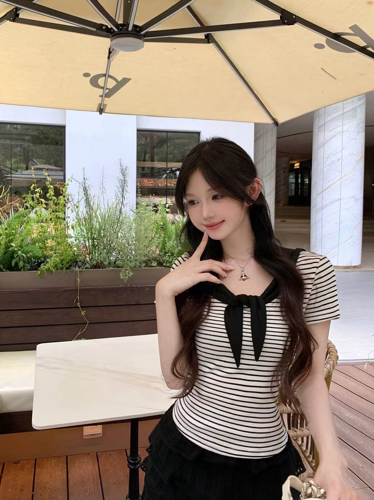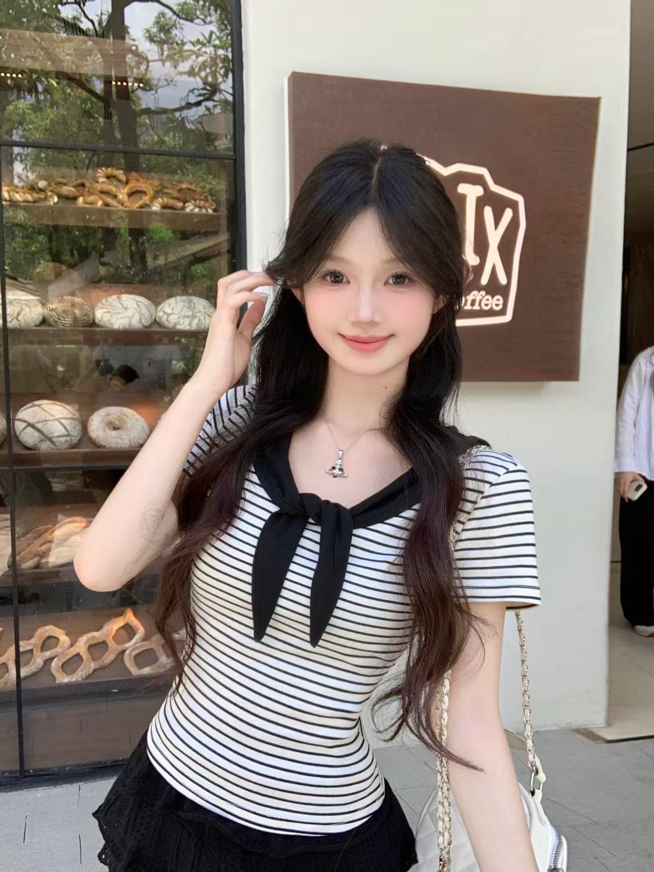 달콤한 스타일 대비 스트라이프 네이비 칼라 반팔 티셔츠 여성 여름 한국 스타일 틈새 시크 슬리밍 탑