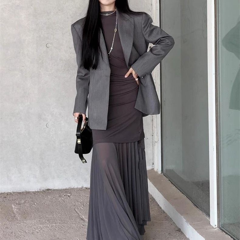 2025 봄 새로운 프랑스 스타일 작은 향기 스타일 라이트 럭셔리 그레이 정장 재킷 드레스 정장 여성스토어 가기