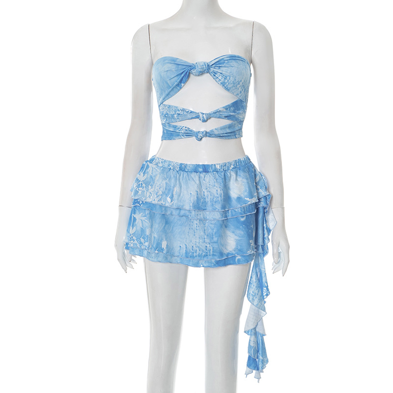 Q25ST028 유럽과 미국의 여름 새로운 여성의 튜브 탑 짧은 치마 섹시 슬림 꽃 프린트 정장 여성 의류 도매