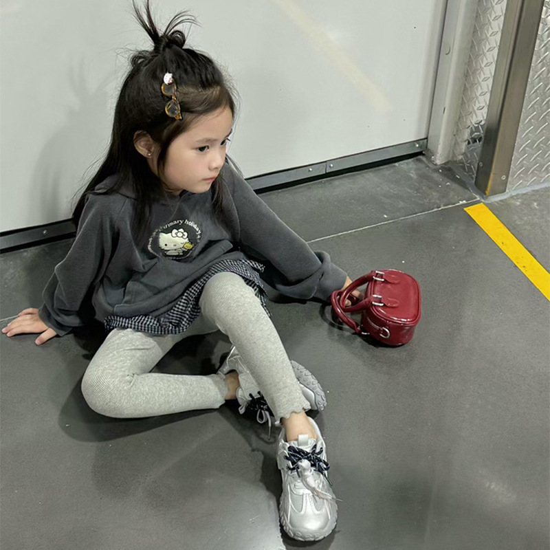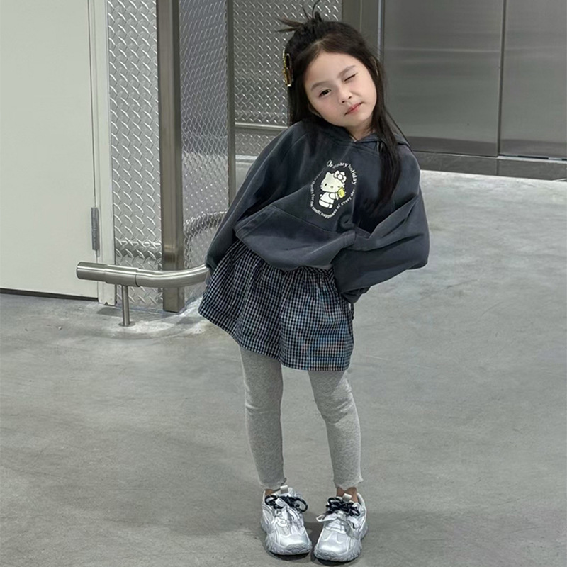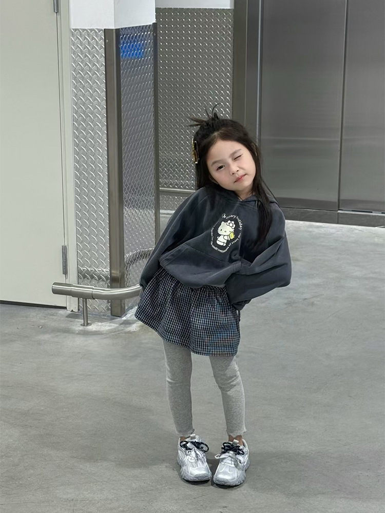 여자 가을 2025 새로운 만화 프린트 후드 티셔츠 다목적 격자 무늬 엉덩이 커튼 레깅스 트렌디 3 피스 세트