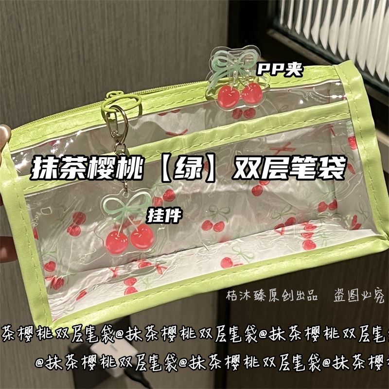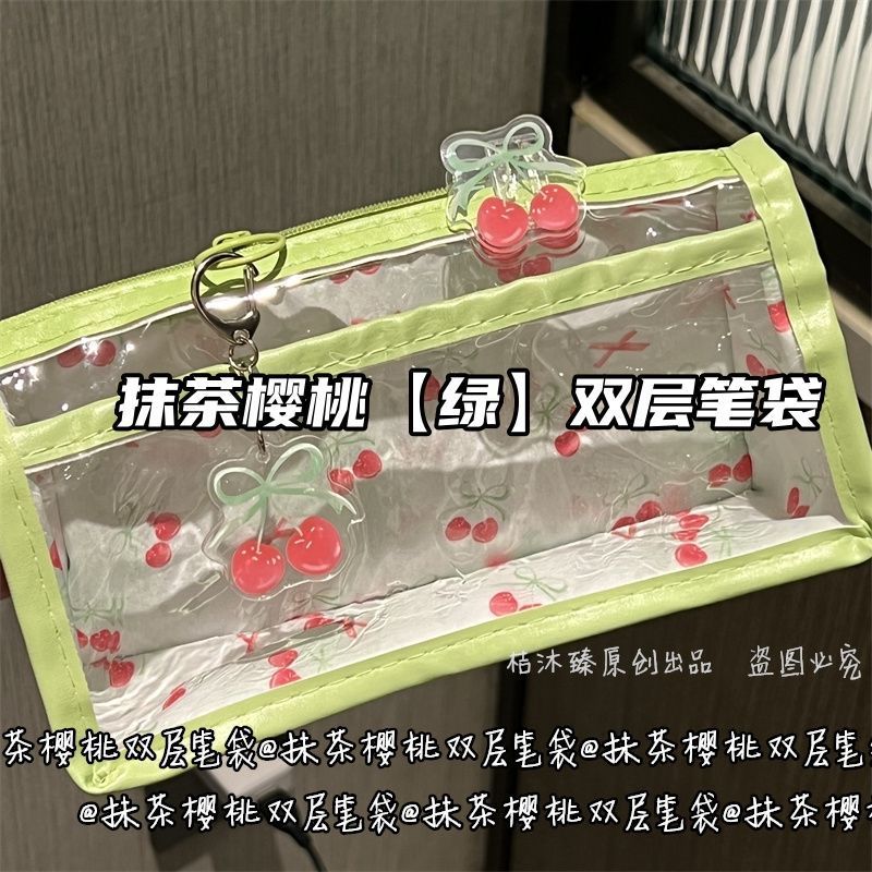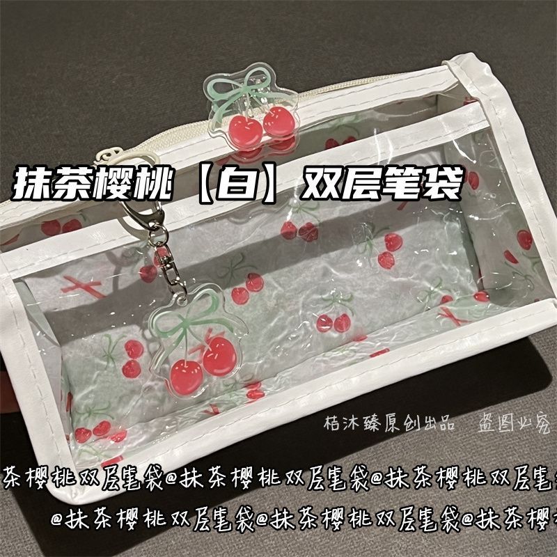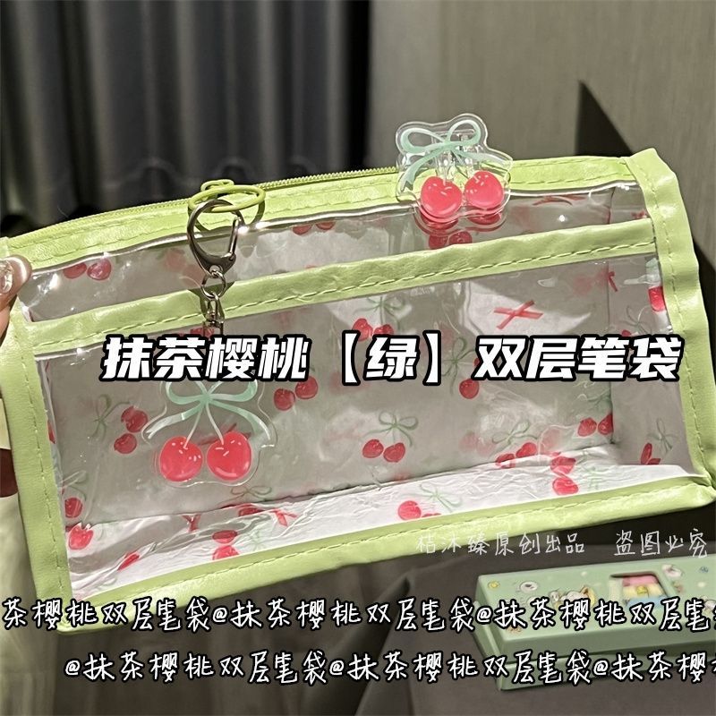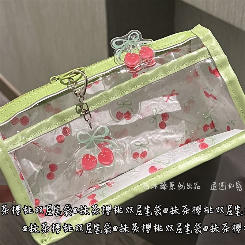 말차 체리 더블 레이어 투명 연필 가방 스타일 고가치 대용량 귀여운 학생 소녀 하트 문구 연필 가방스토어 가기