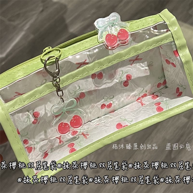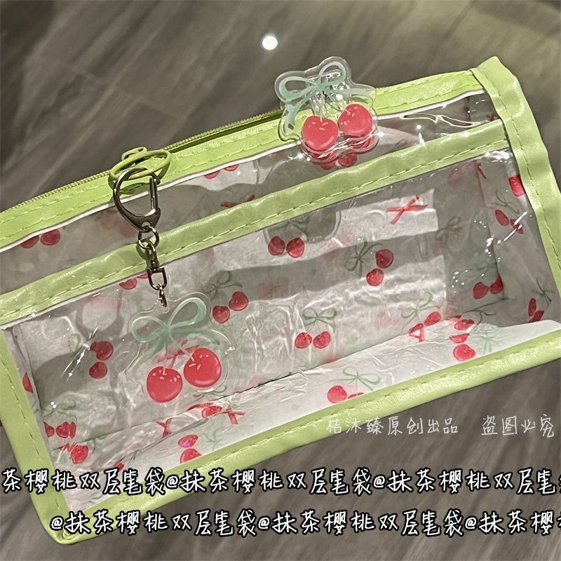 말차 체리 더블 레이어 투명 연필 가방 스타일 고가치 대용량 귀여운 학생 소녀 하트 문구 연필 가방