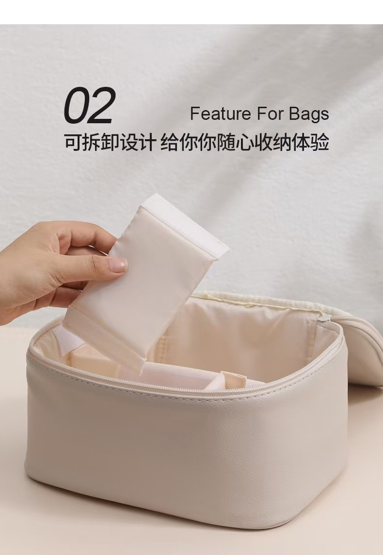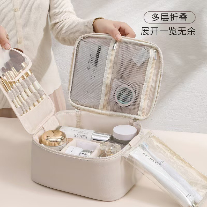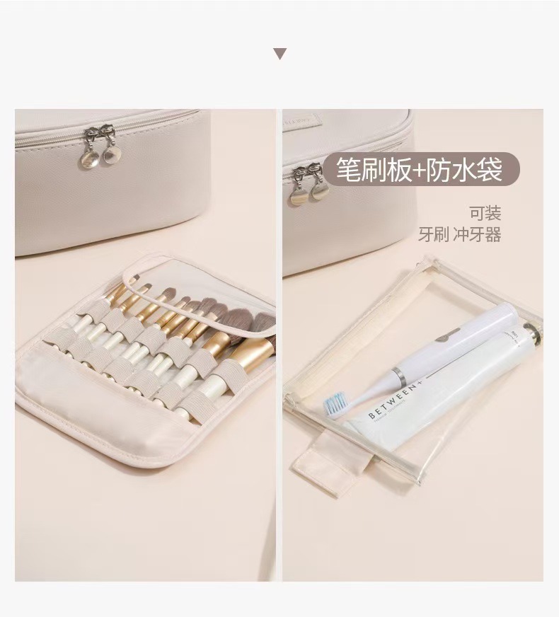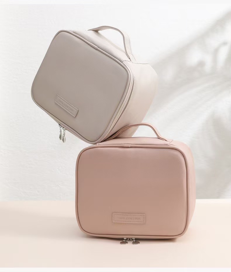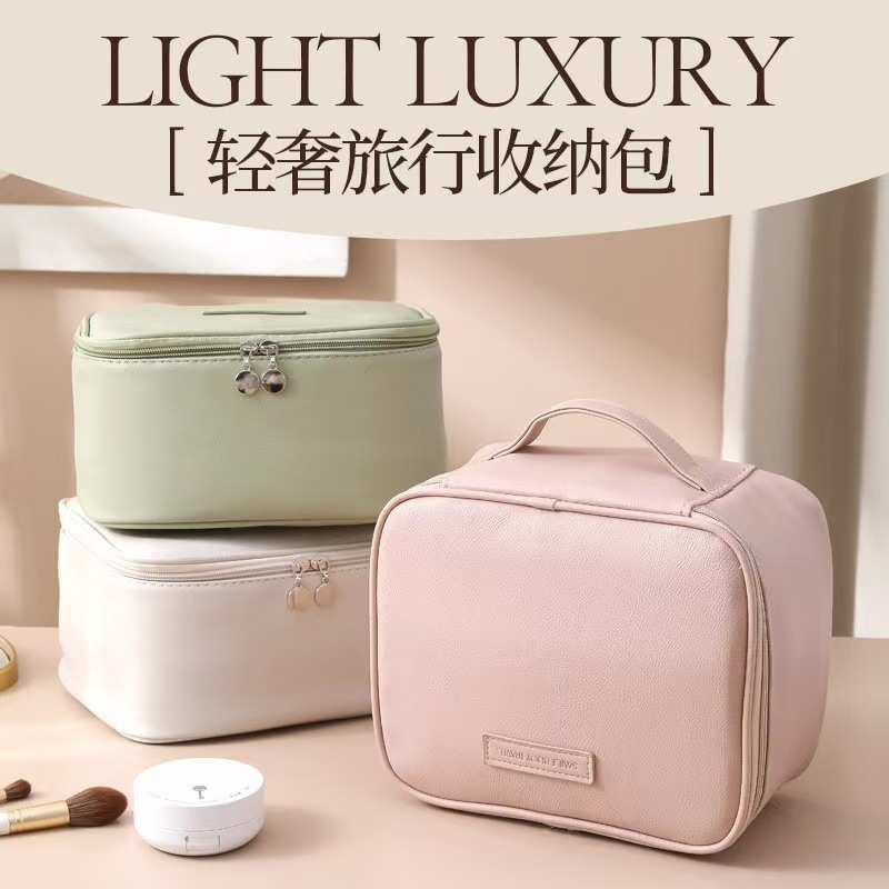 새로운 가벼운 고급 가죽 대형 가방, 매우 부드러운 다중 구획 휴대용 화장품 케이스, 고급스럽고 간단한 대용량 가방