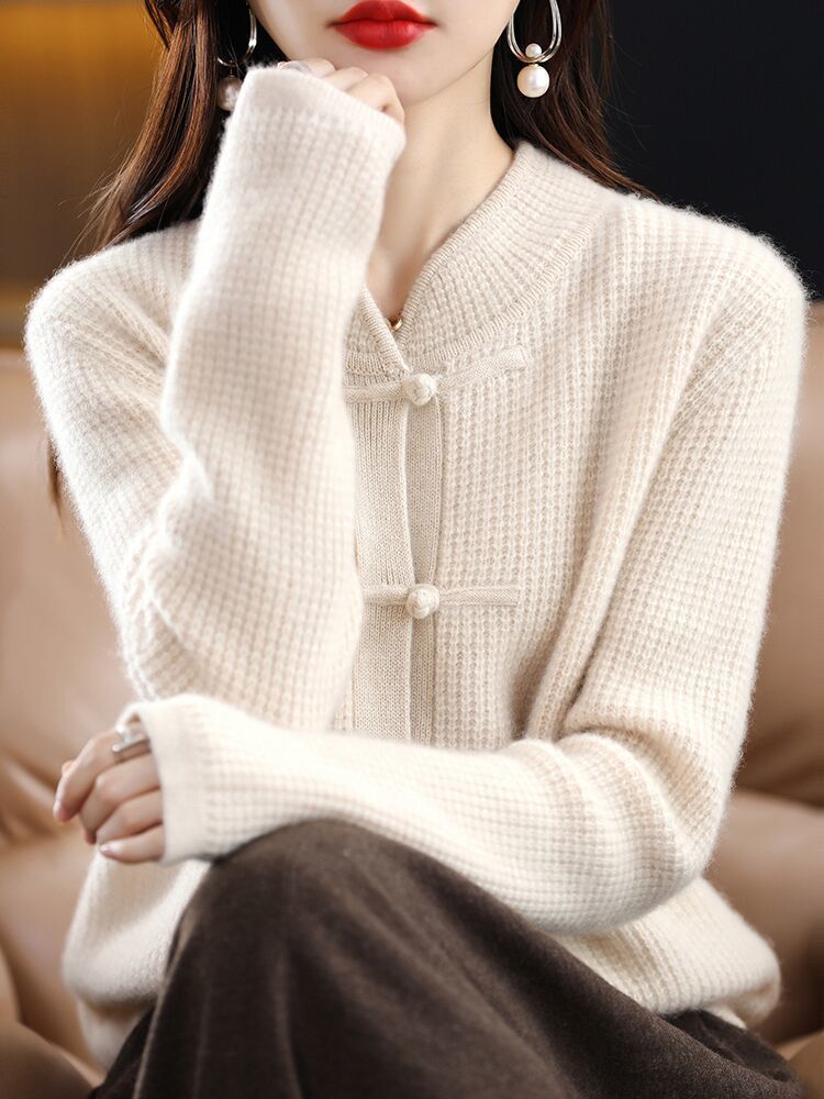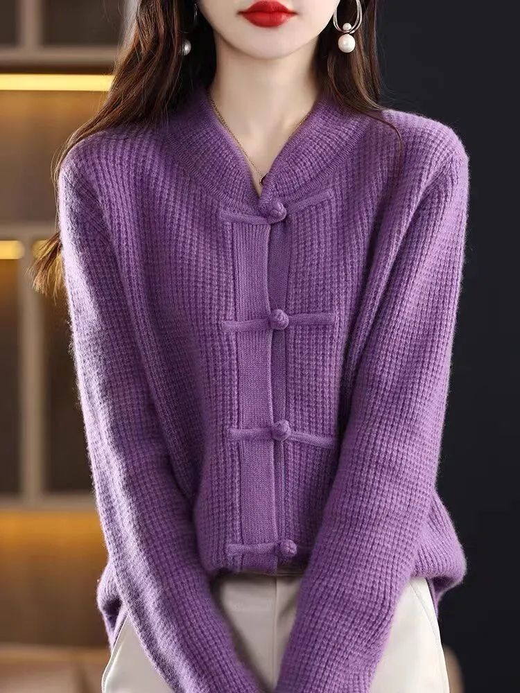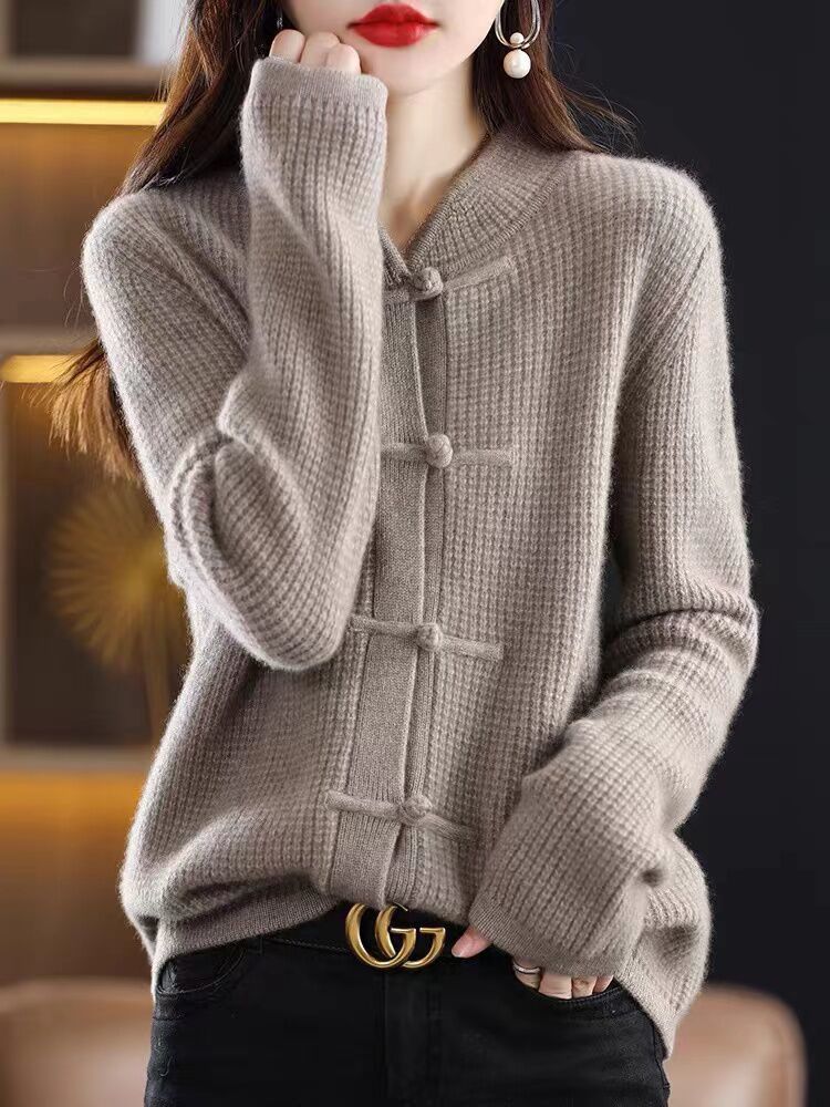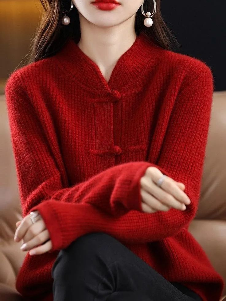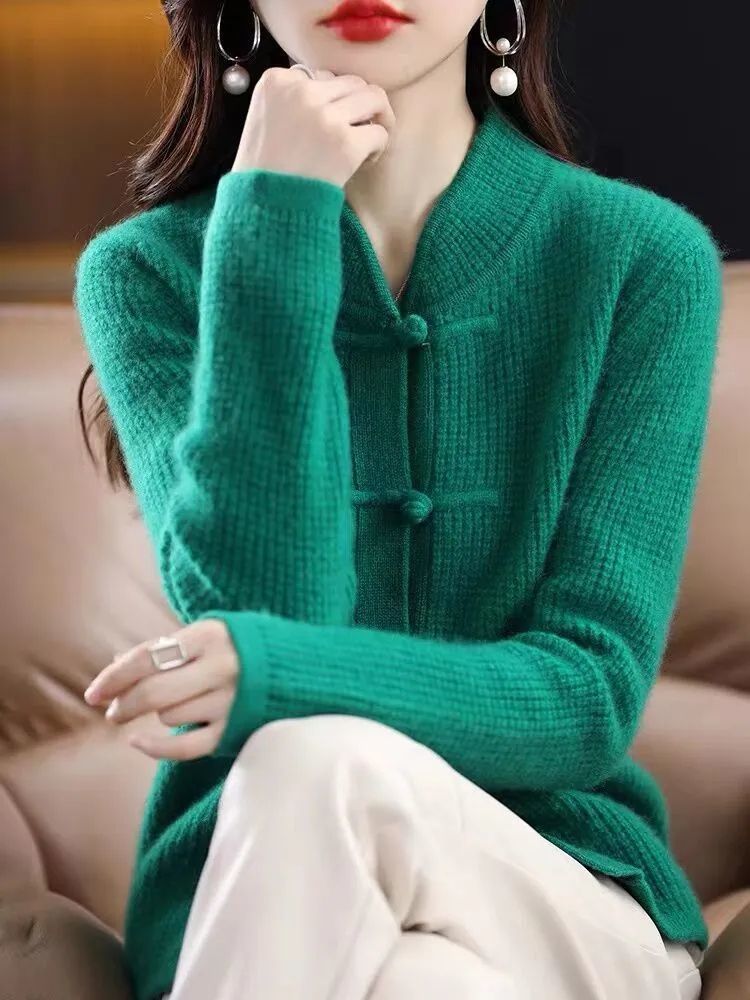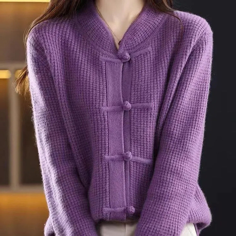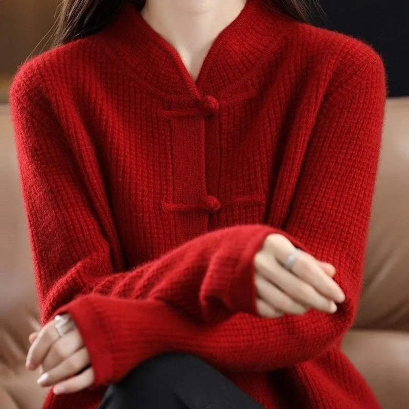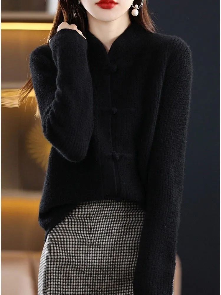 여성을 위한 새로운 가을 겨울 복고풍 니트 가디건, 세련된 하프 터틀넥 버튼, 루즈한 슬리밍 스웨터 재킷, 중국 스타일 탑스토어 가기