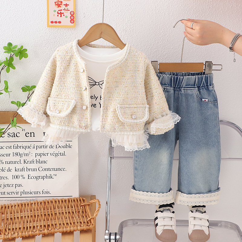 여자 봄, 가을 의류 세트 2025 새로운 스타일 아기와 어린이 유행 작은 향기로운 카디건 3 피스 세트 드롭 배송