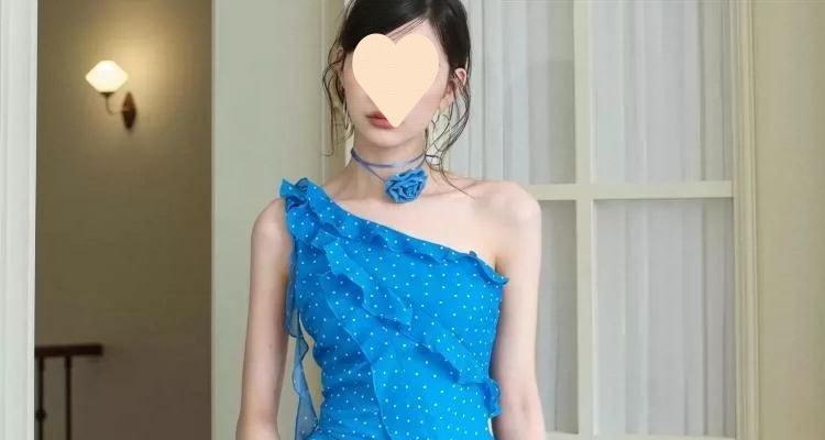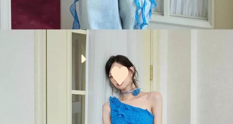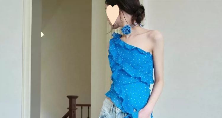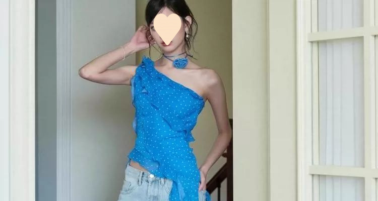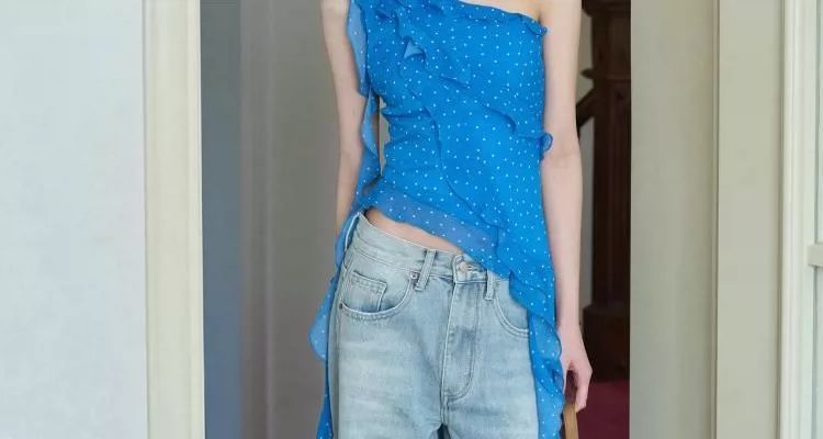 프렌치 글레이셔 블루 오프 숄더 폴카 도트 캐미솔 여성 여름 쉬폰 셔츠 불규칙한 리본 프릴 슬리밍 탑스토어 가기