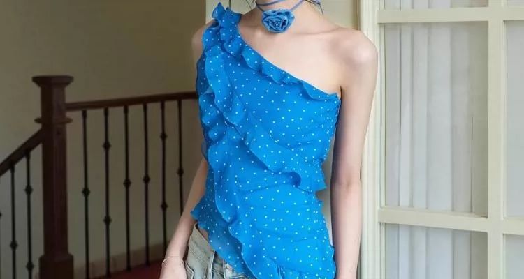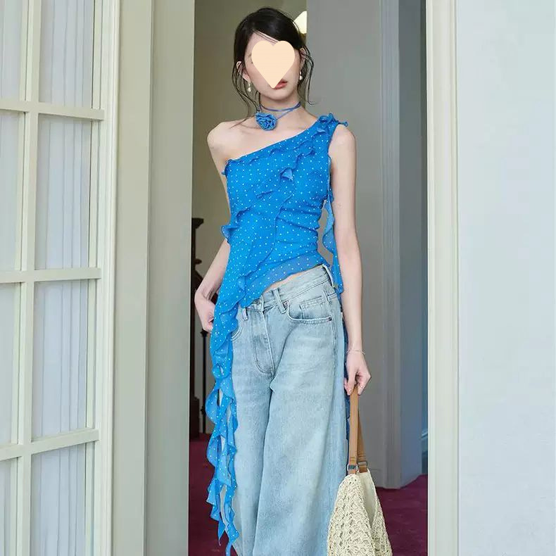 프렌치 글레이셔 블루 오프 숄더 폴카 도트 캐미솔 여성 여름 쉬폰 셔츠 불규칙한 리본 프릴 슬리밍 탑