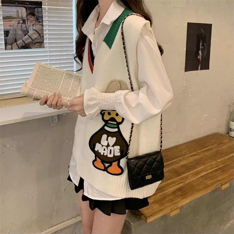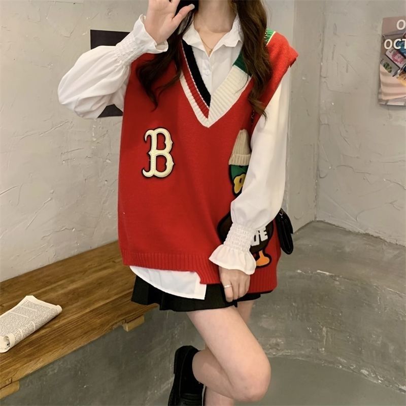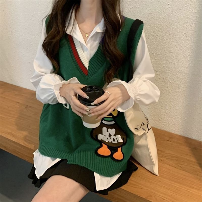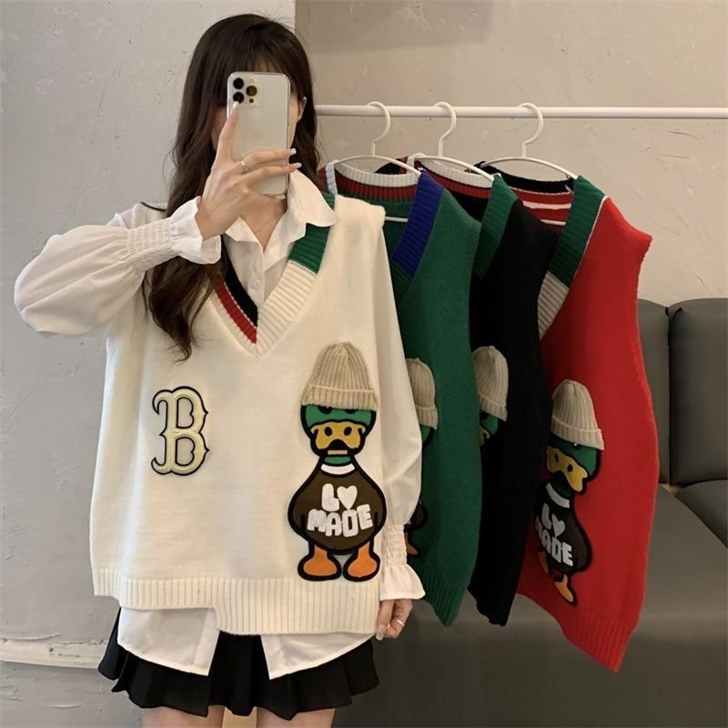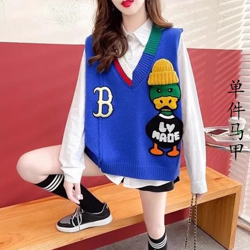 만화 니트 싱글 조끼 코트 봄과 가을 새로운 스타일 게으른 스타일 v 넥 풀오버 민소매 조끼 스웨터 여성 유행스토어 가기