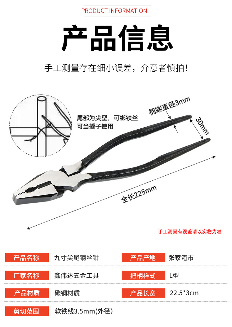 • 건설 뾰족한 꼬리 철 손잡이 와이어 펜치 노동 절약 바이스 9inch 긴 225mm 다기능 펜치