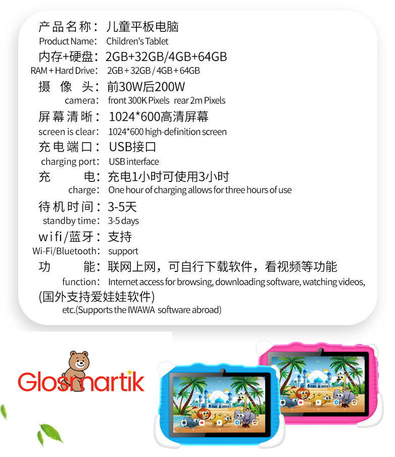 7inch 어린이용 태블릿 PC 새로운 모델은 Bluetooth WIFI를 지원합니다. 국경 간 무역 Android 12 Aida