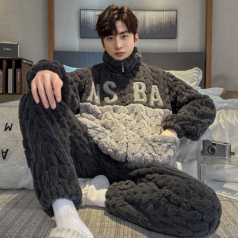 가을 겨울 남성용 산호 벨벳 잠옷 플러스 벨벳 두꺼운 투피스 슈트 남성용 지퍼 플란넬 홈웨어 겨울