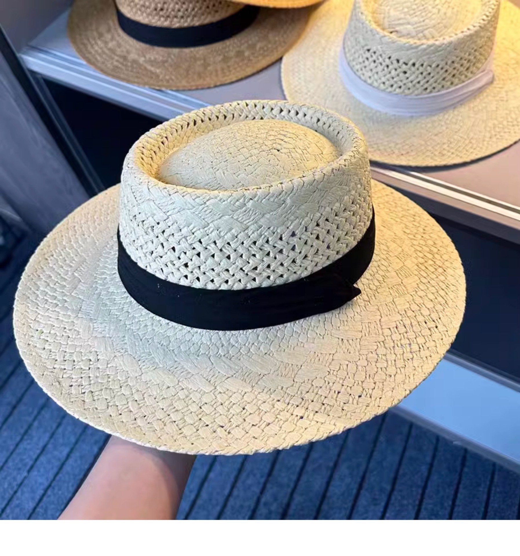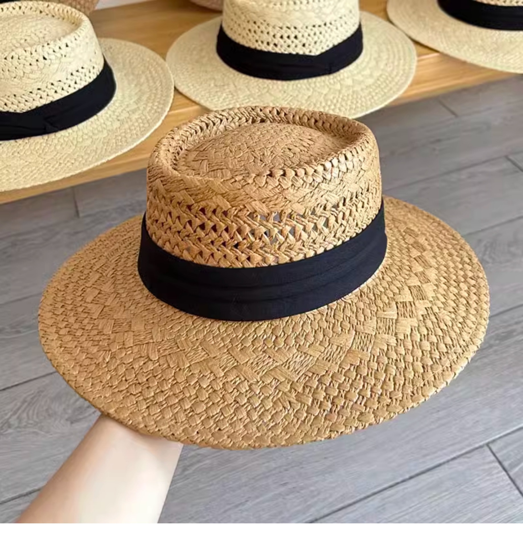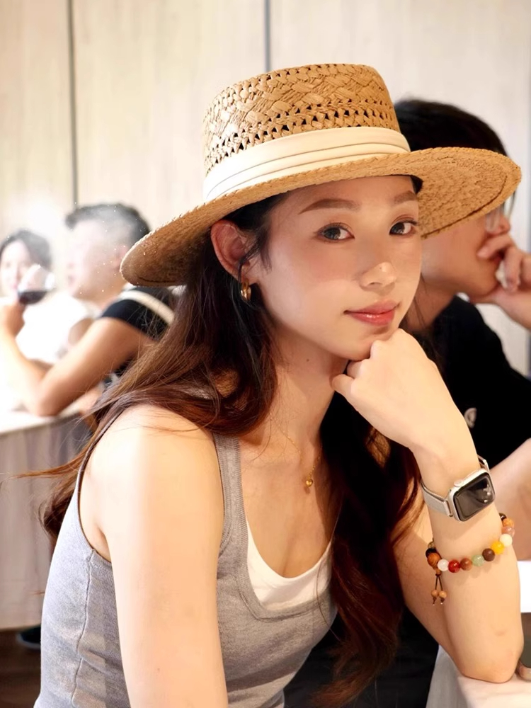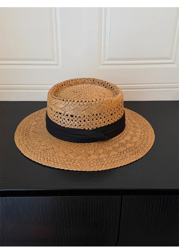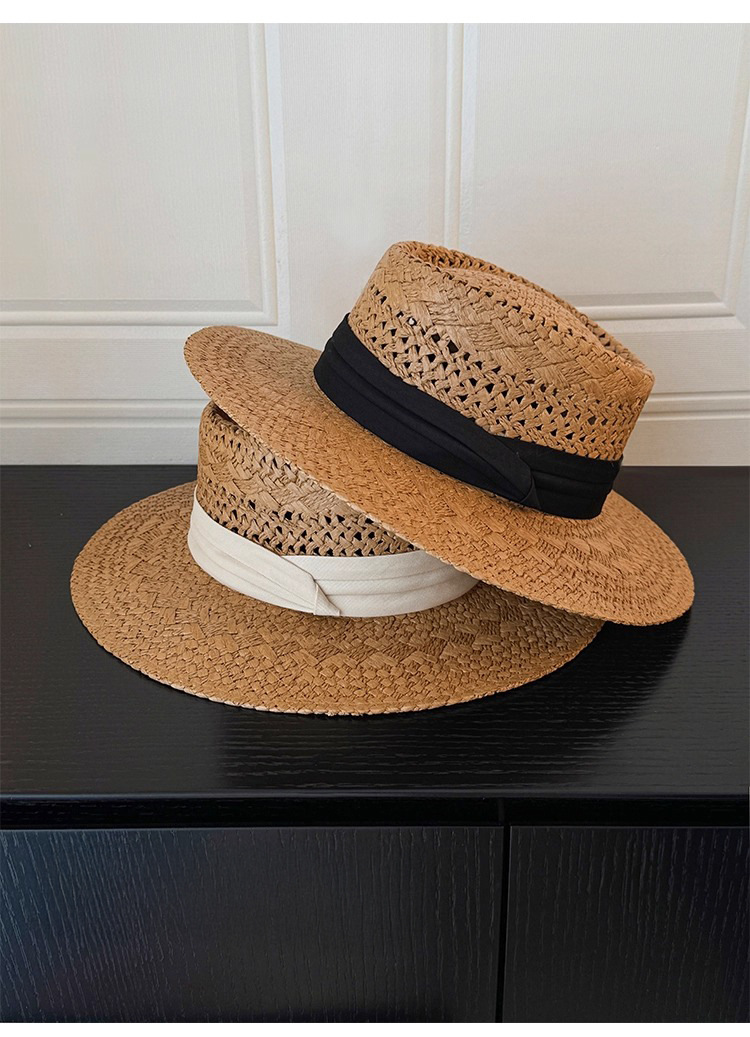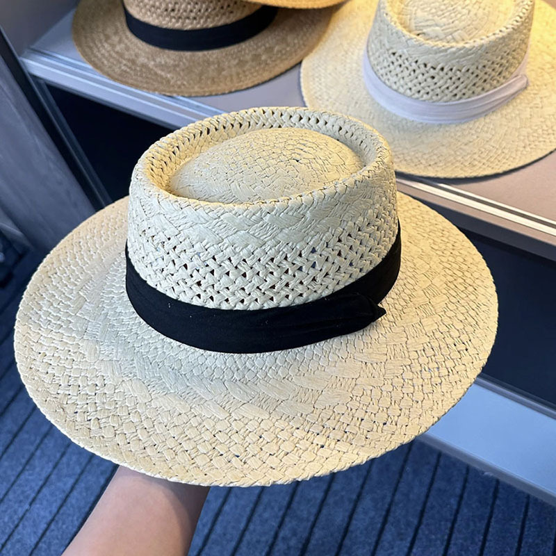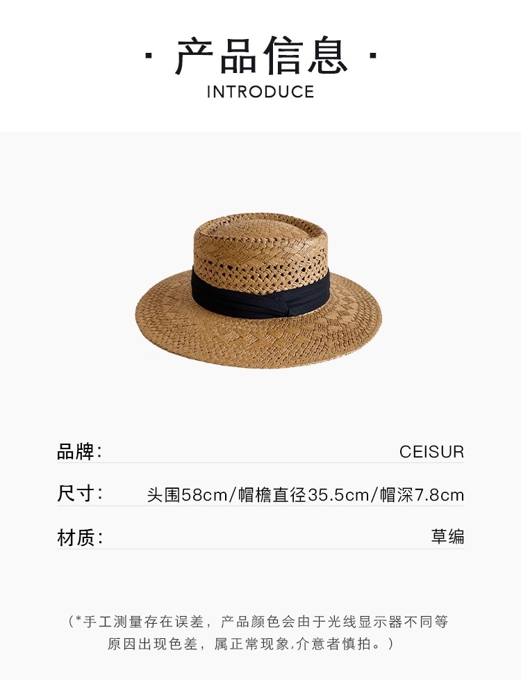赫本风新款法式平顶草帽女款夏季海边度假大檐编织防晒帽子沙滩帽
