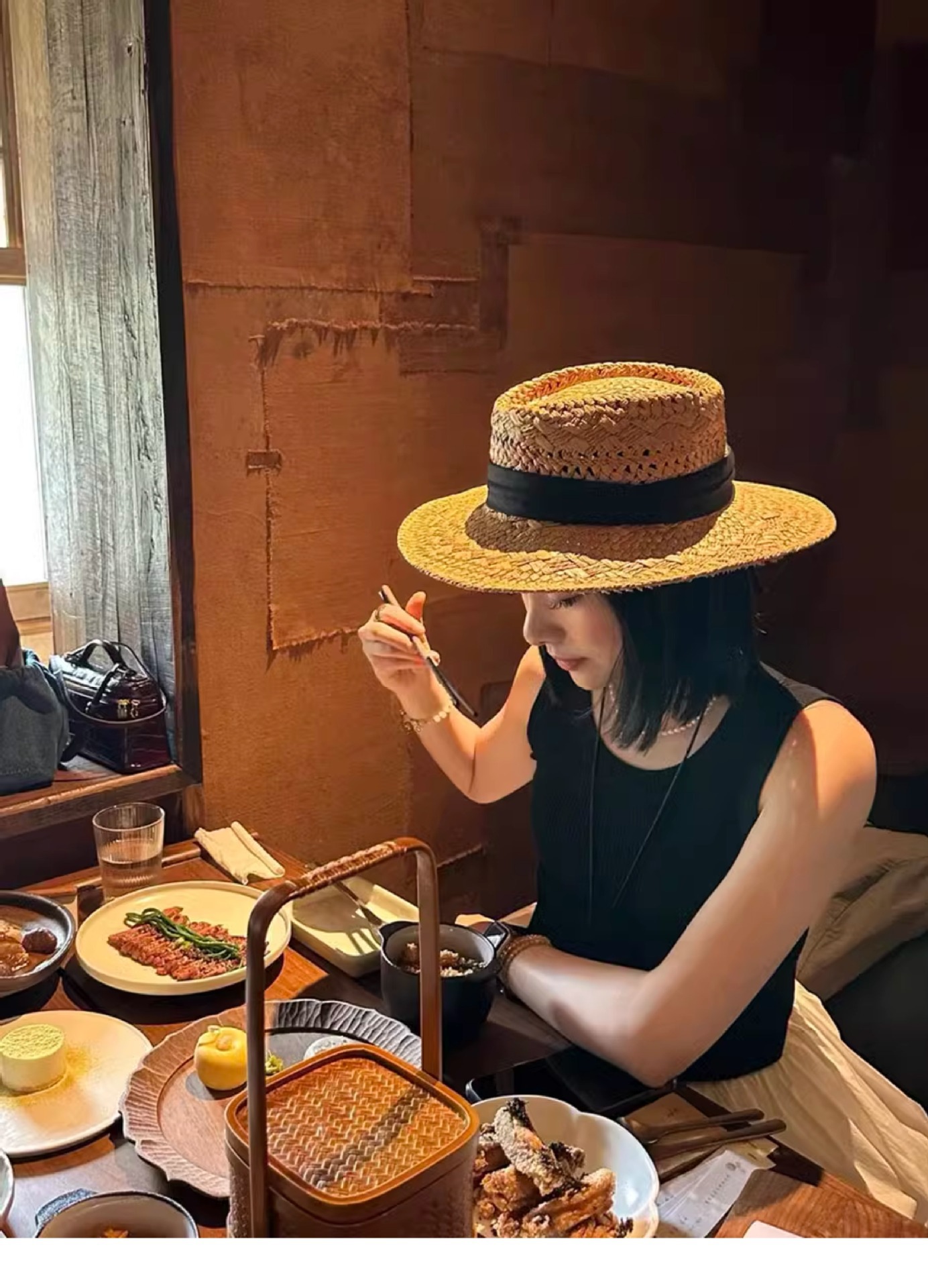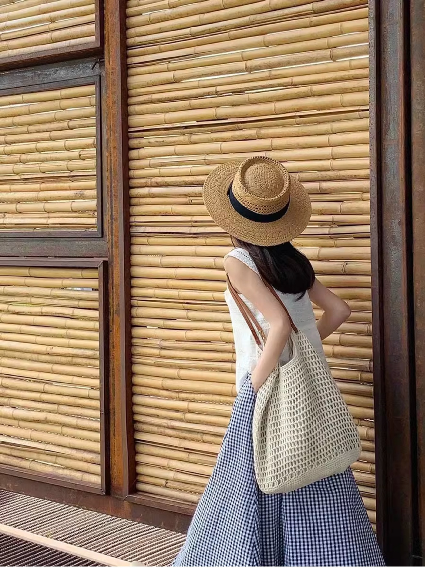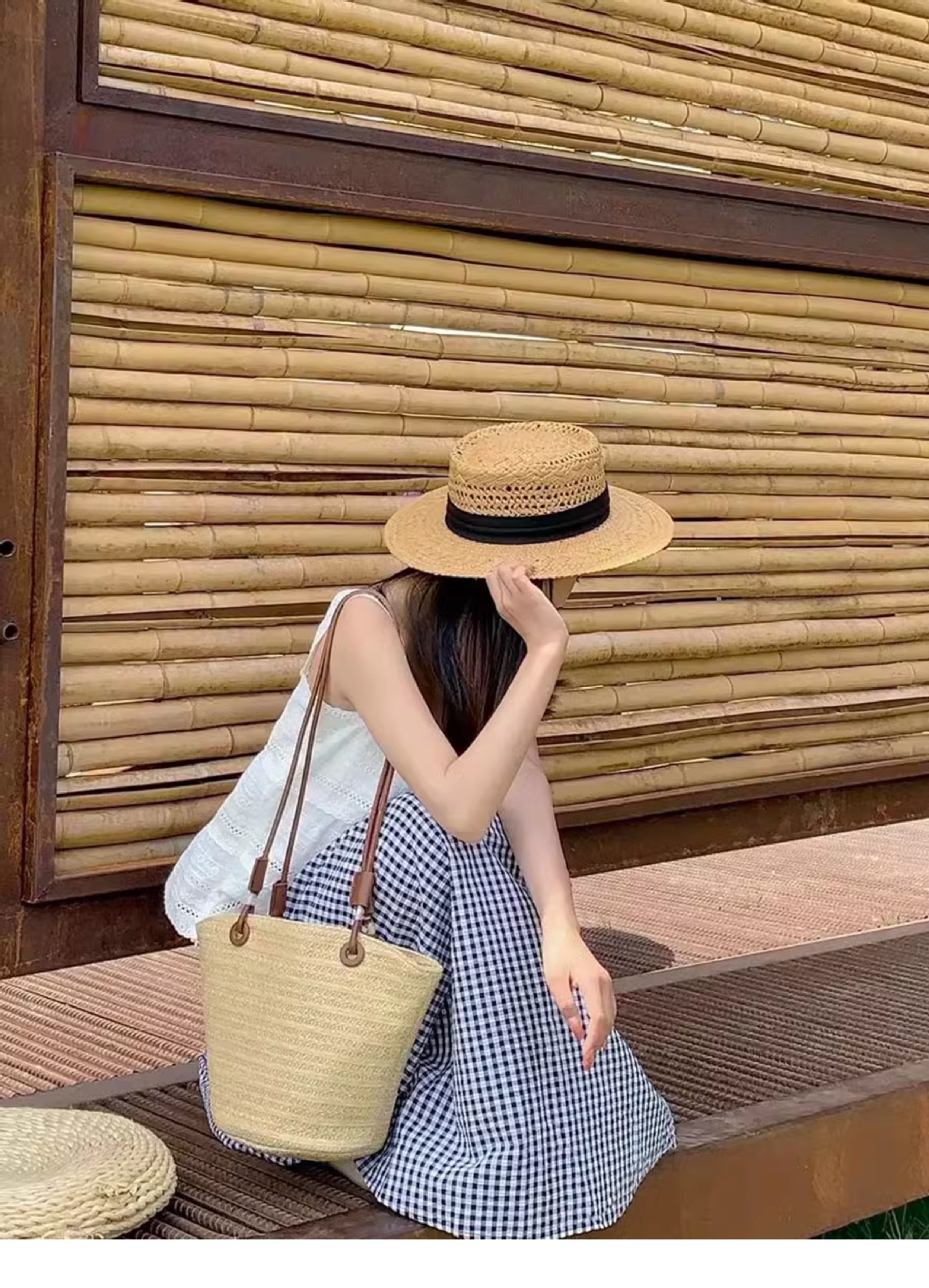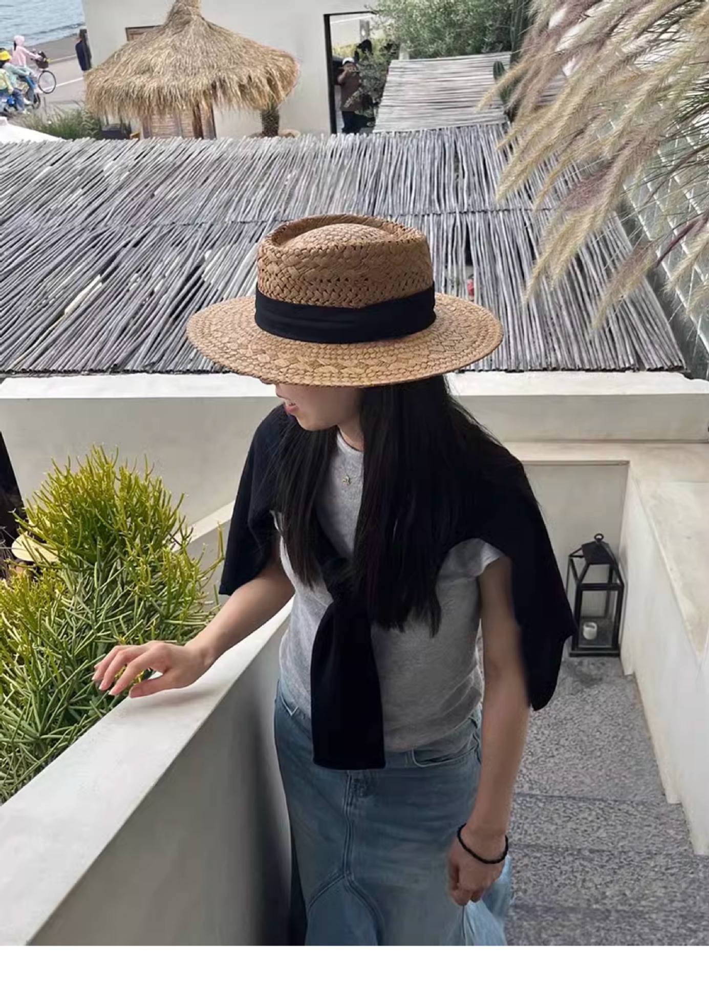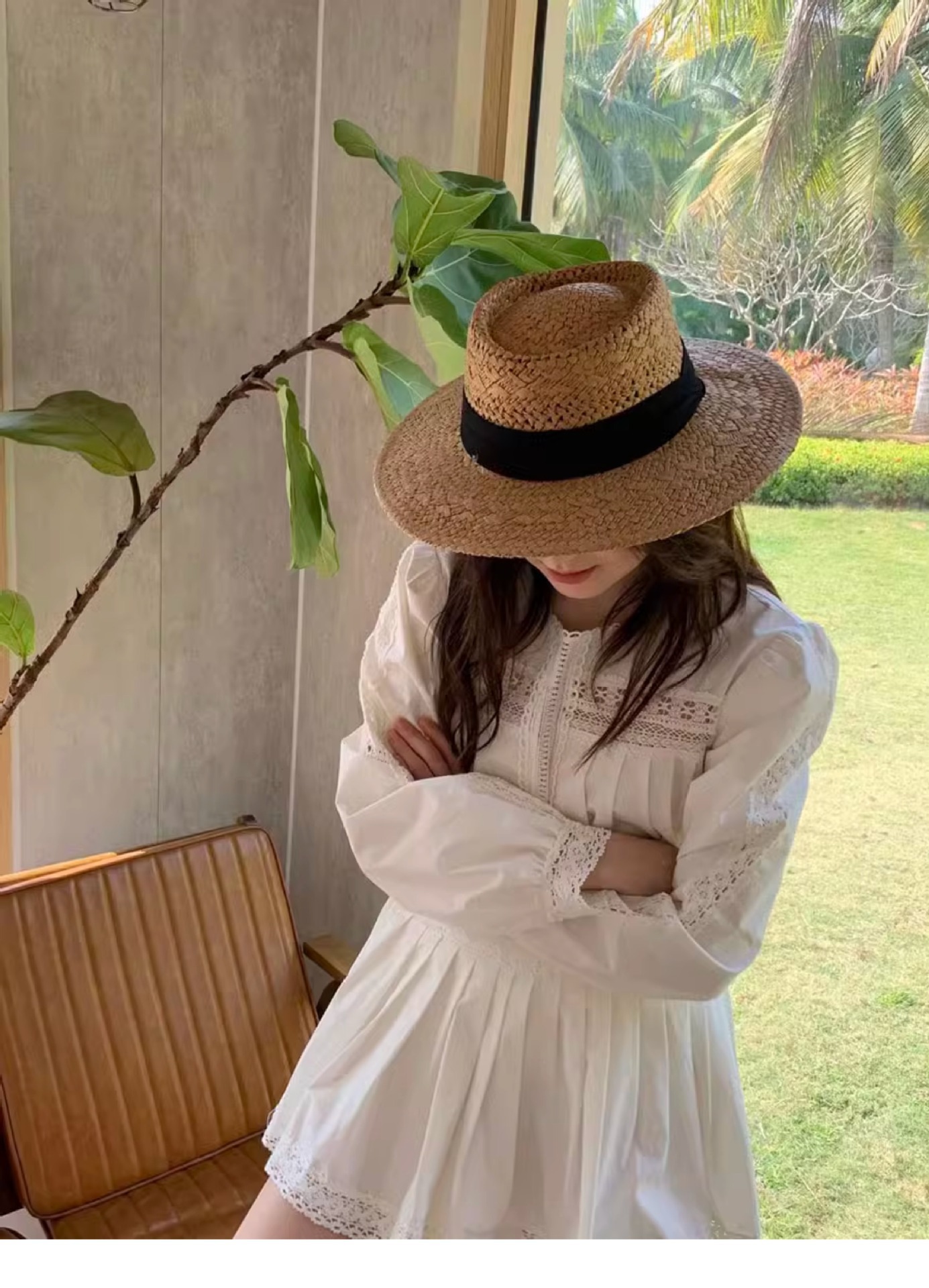 赫本风新款法式平顶草帽女款夏季海边度假大檐编织防晒帽子沙滩帽
