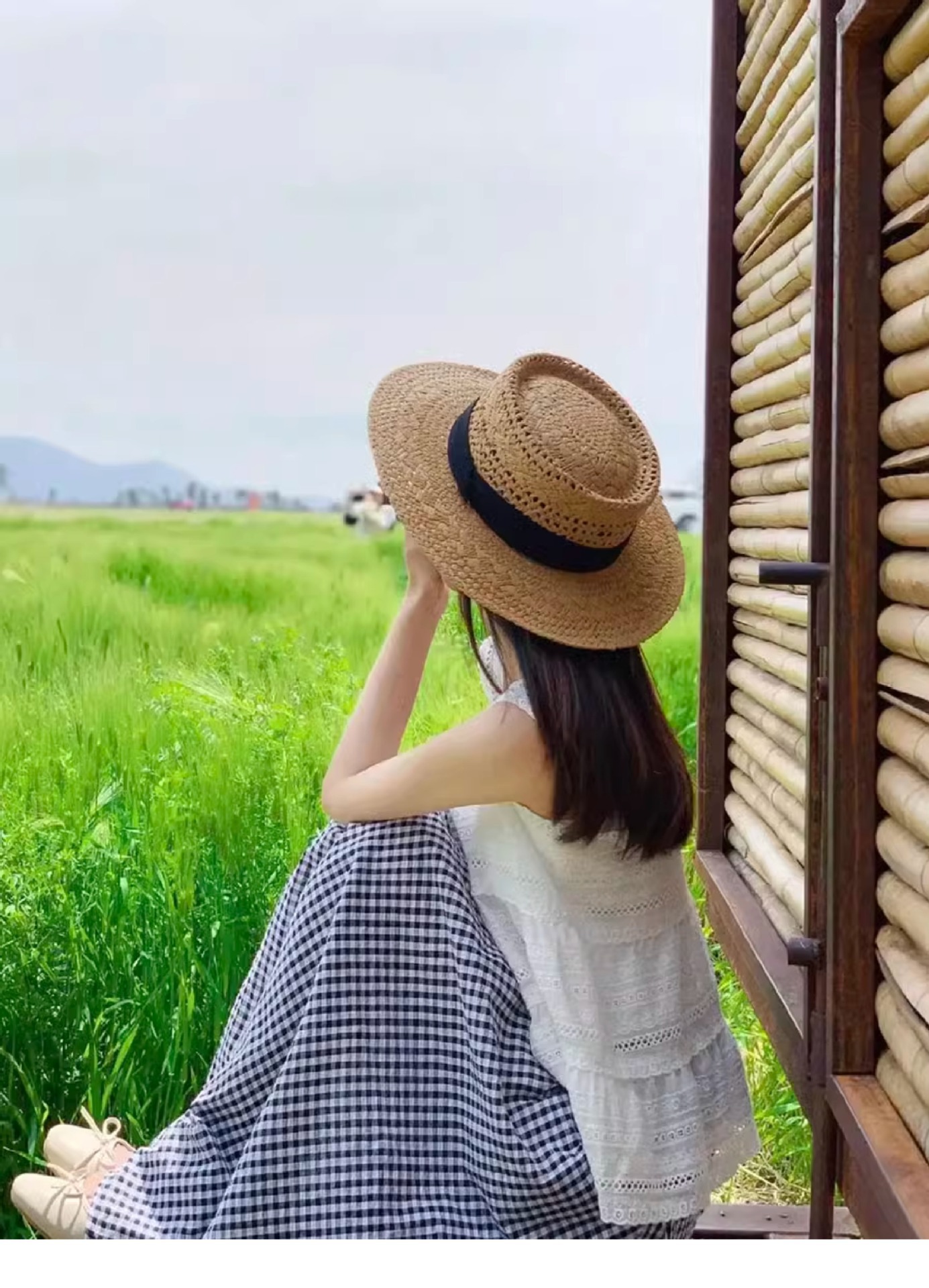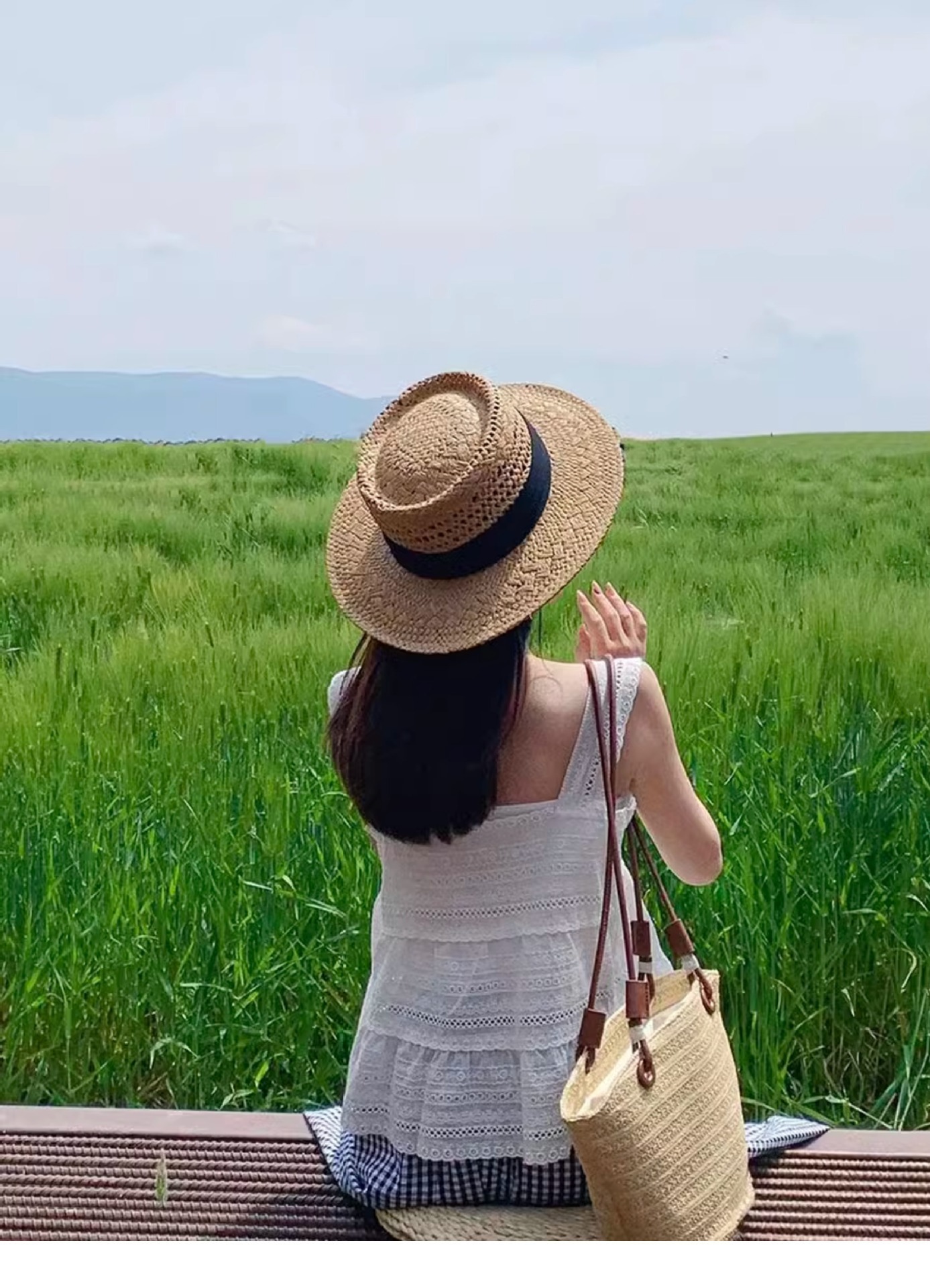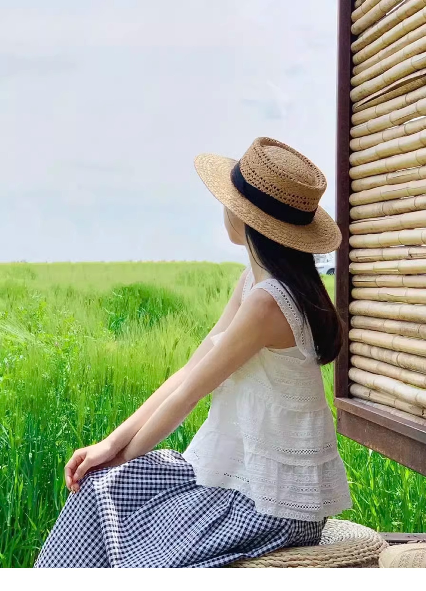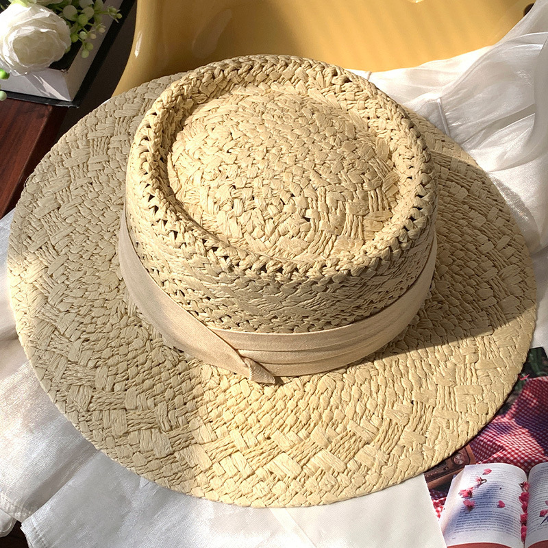 草帽女春夏平沿法式绑带帽子网红时尚咸草编织海边沙滩度假礼帽潮