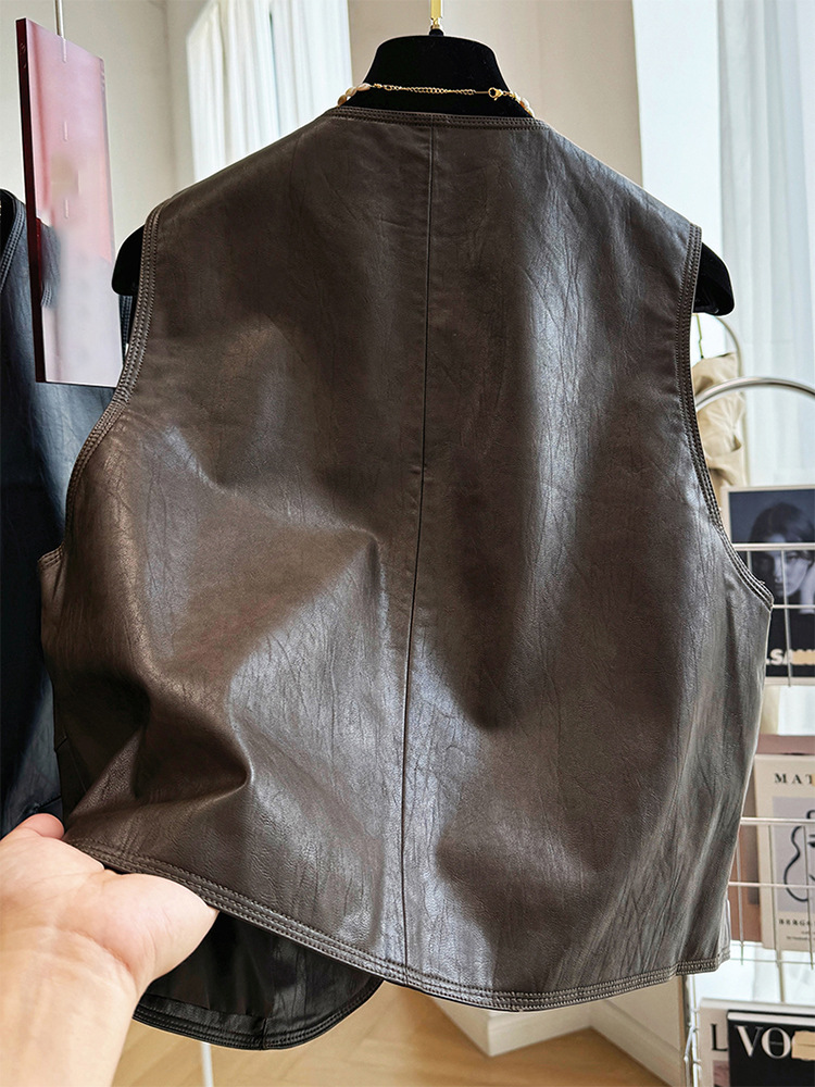 유럽풍 고급 PU 가죽 조끼 여성용 2024 가을 프렌치 레트로 루즈핏 레이어드 조끼 아우터 상의