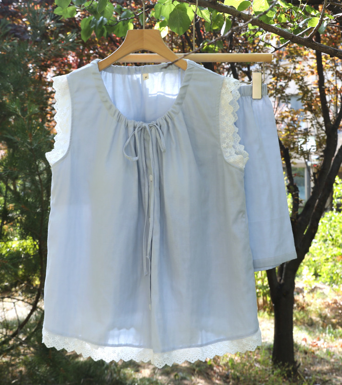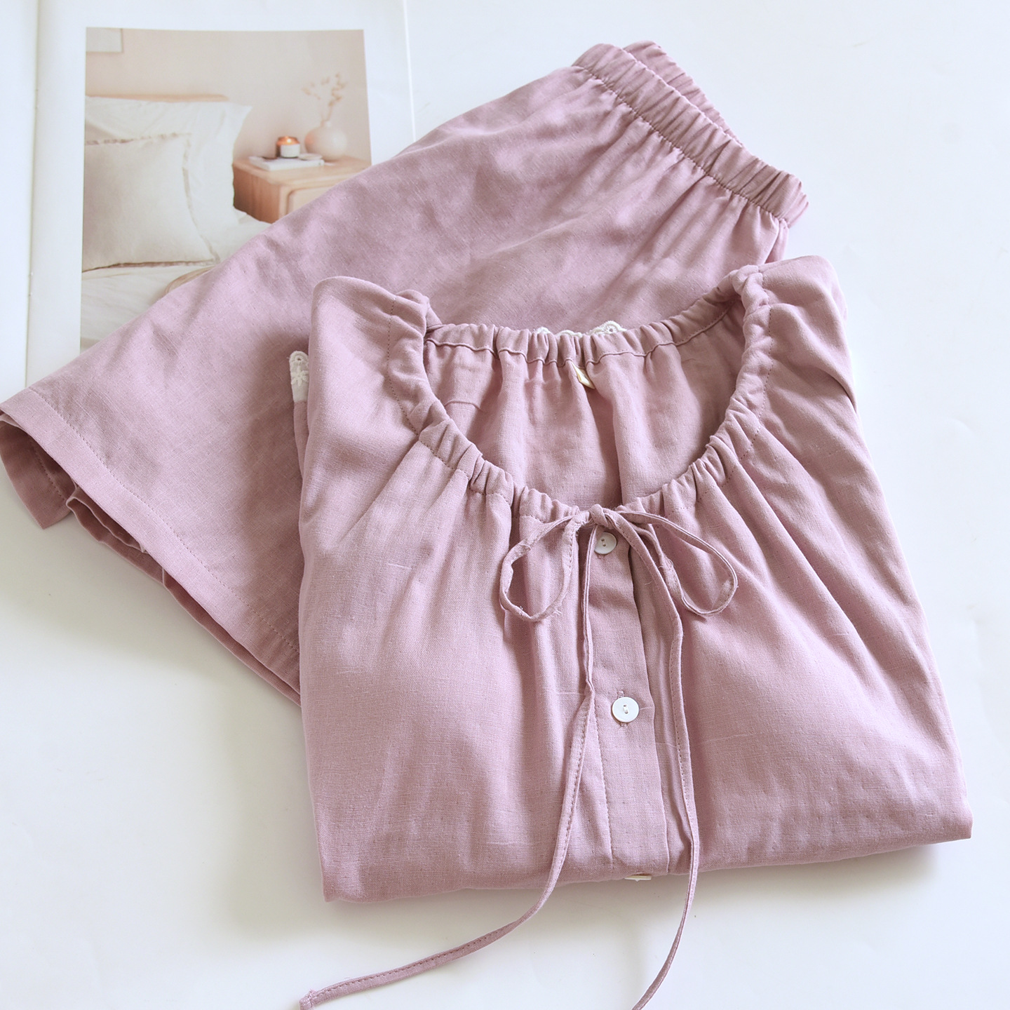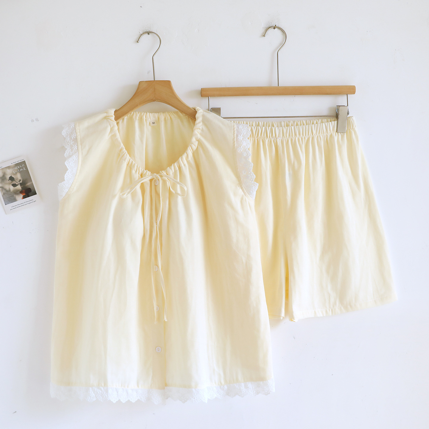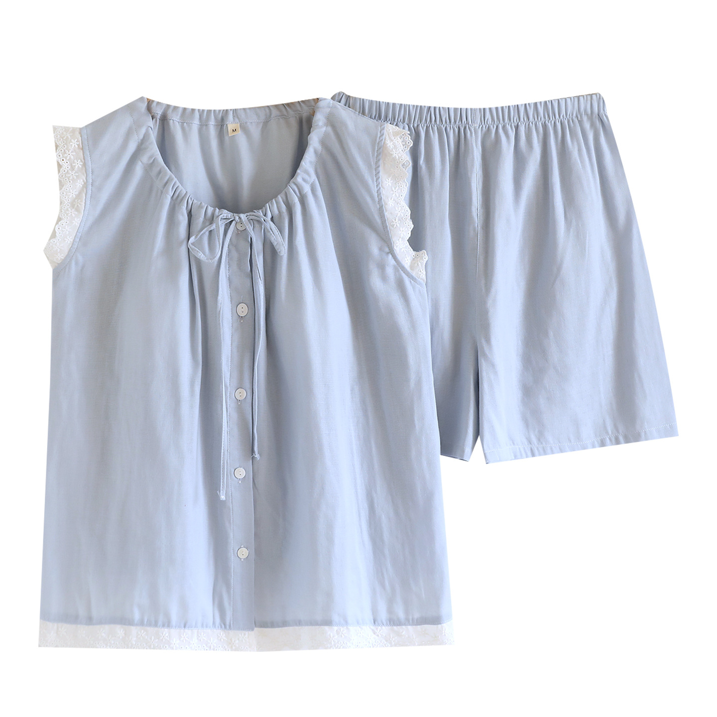 심플한 솔리드 컬러 라운드 넥 조절 가능한 레이스 반팔 반바지 루즈 캐주얼 슈트 여성 봄 여름 홈웨어 외부 착용 가능스토어 가기