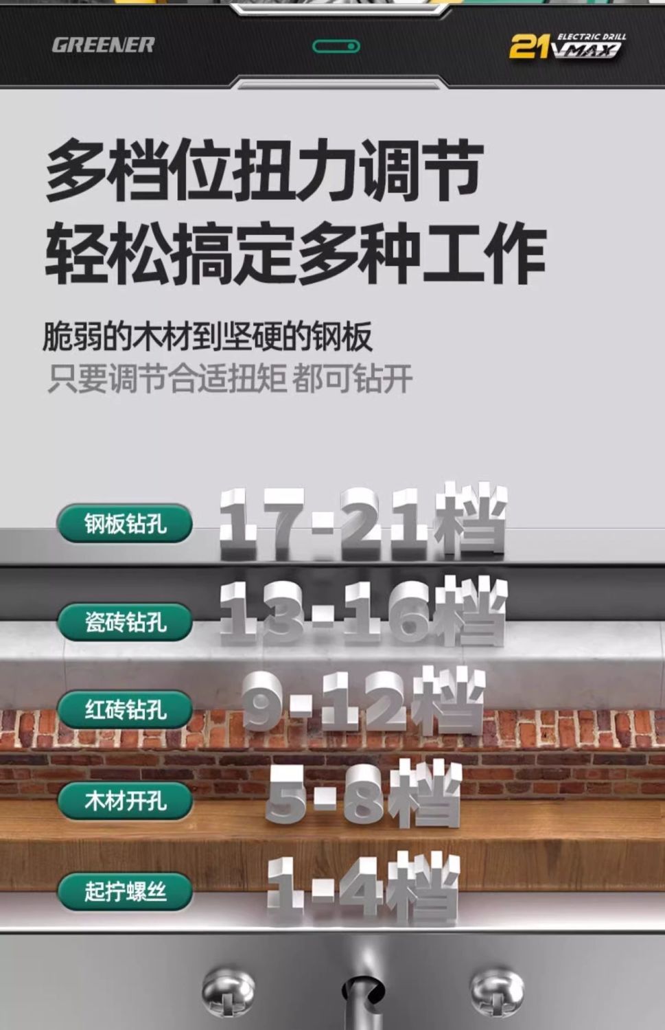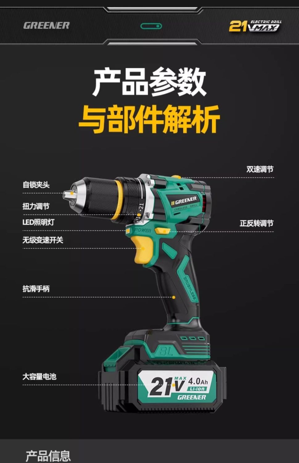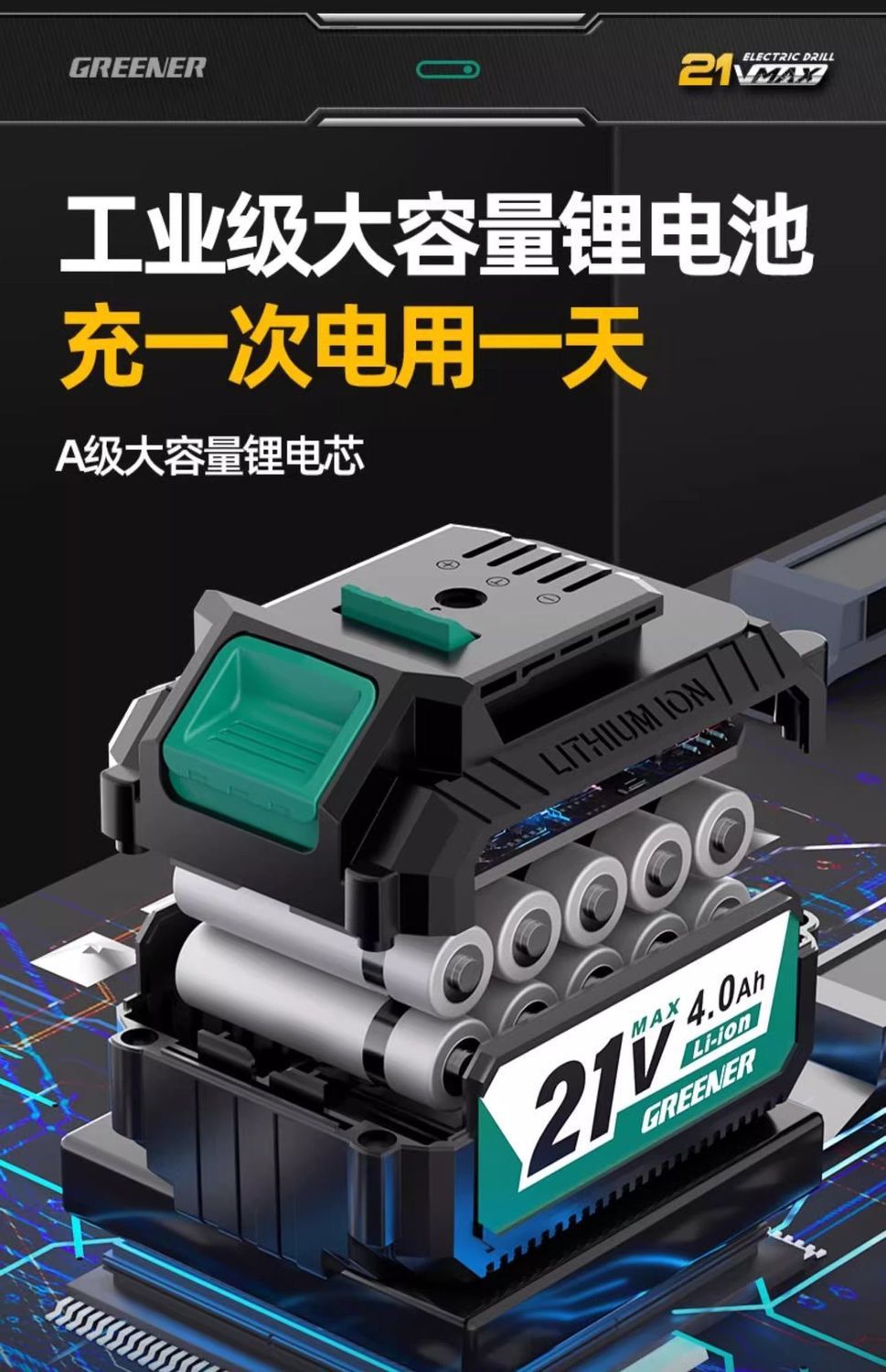 • 21V 브러시리스 배속 4.0AH 배터리 1개 + 드릴 13개 세트