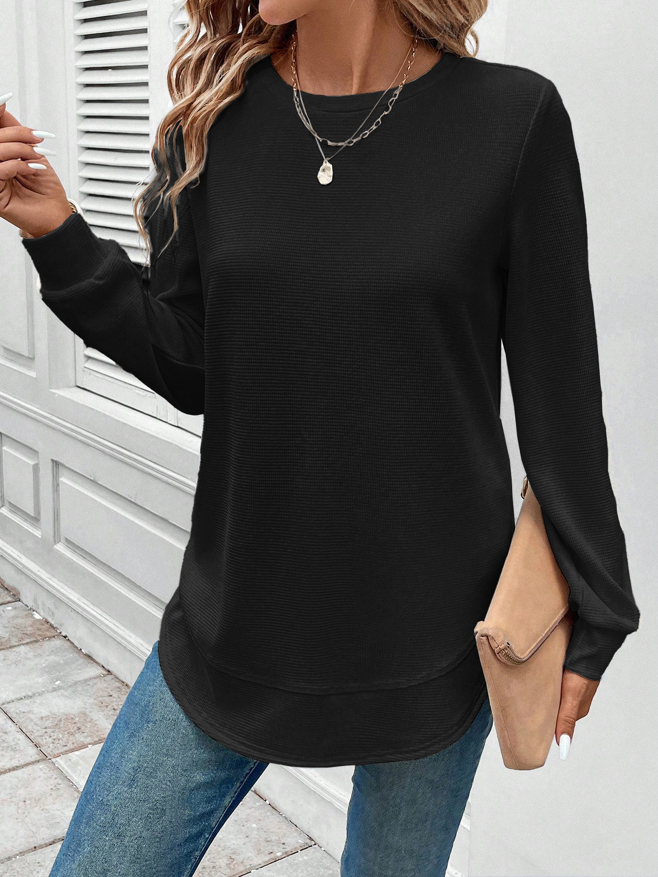 2025 유럽과 미국의 아마존 대외 무역 가을, 겨울 새로운 느슨한 여성 의류 세련된 단색 라운드 넥 긴팔 스웨트 셔츠스토어 가기