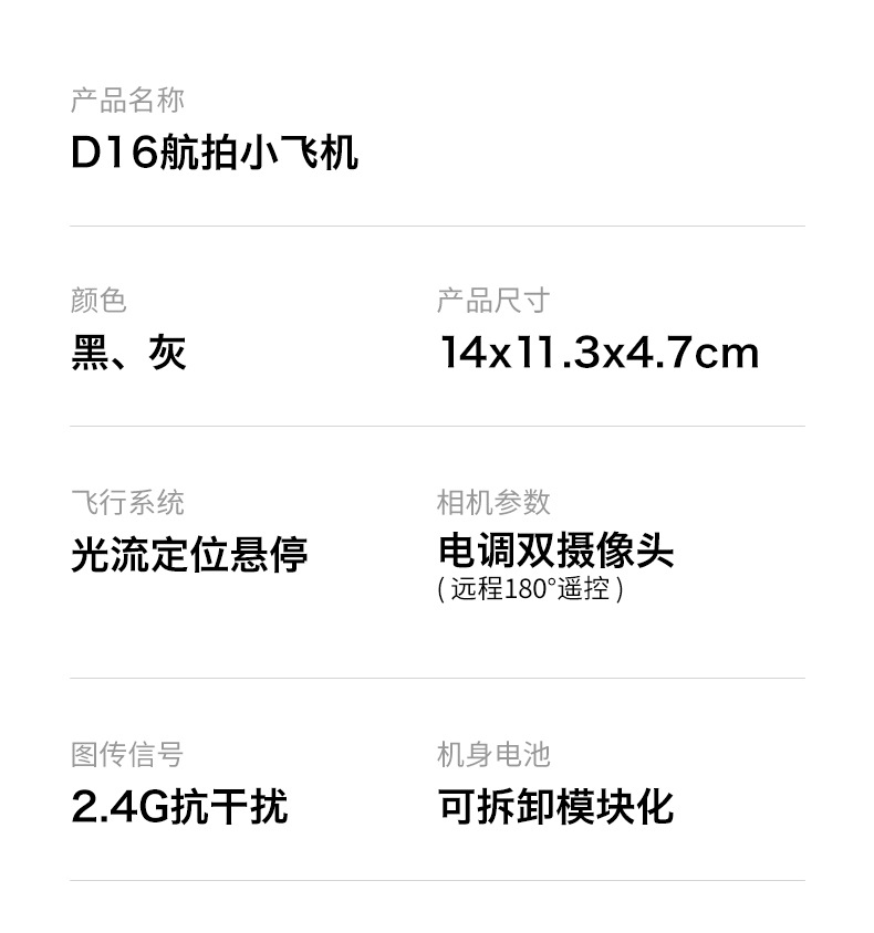 • D16 그레이 듀얼 카메라 + 광학 흐름 포지셔닝 + 장애물 회피