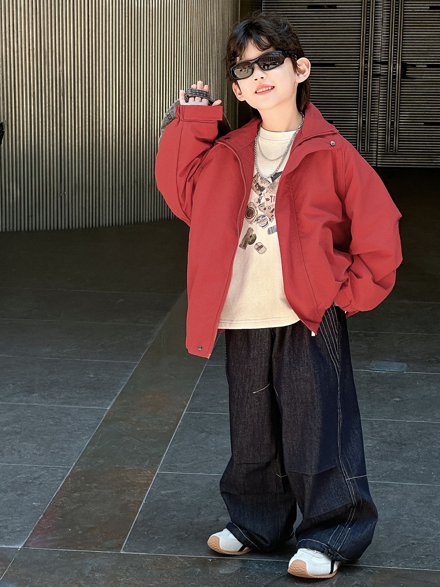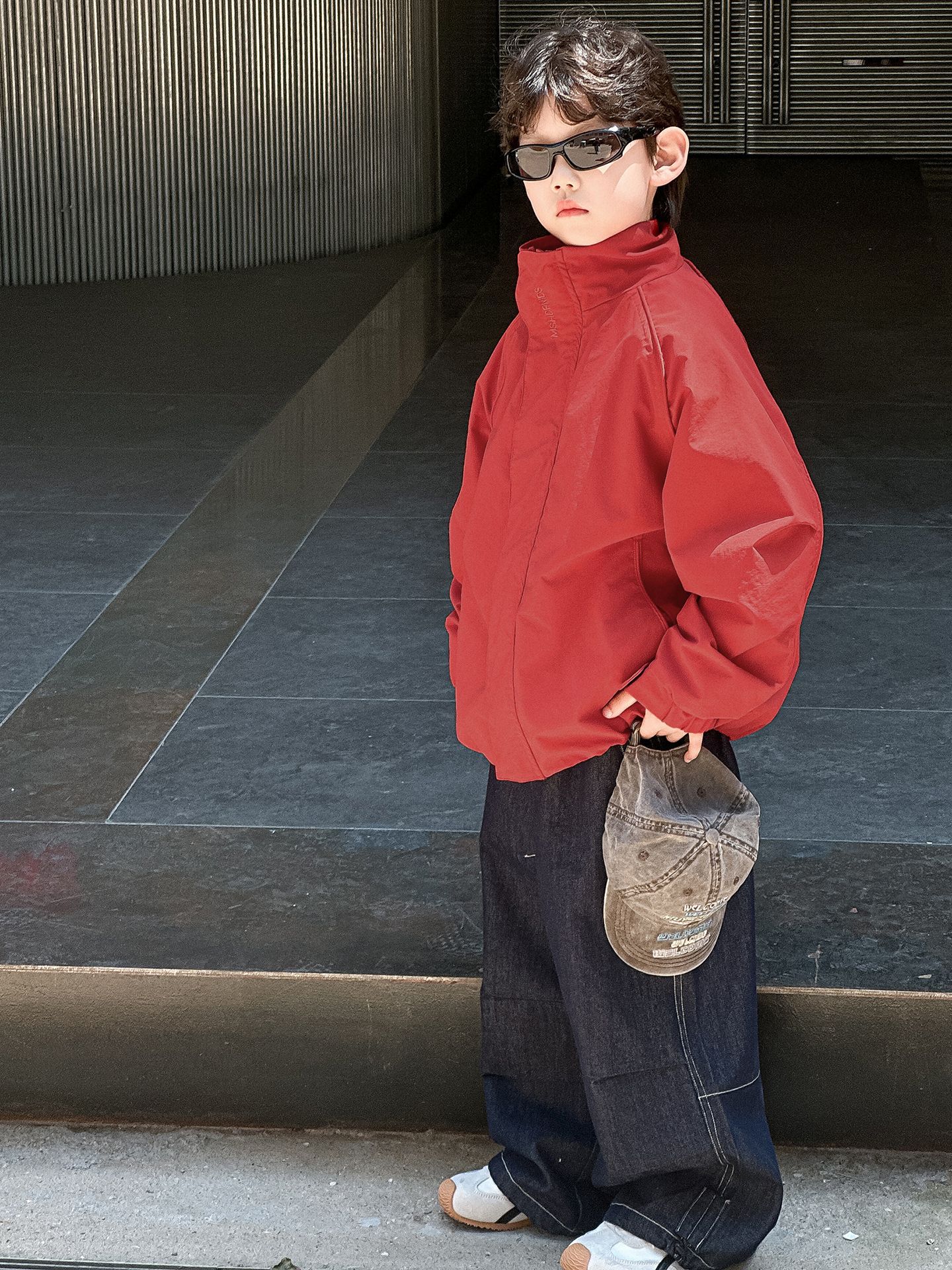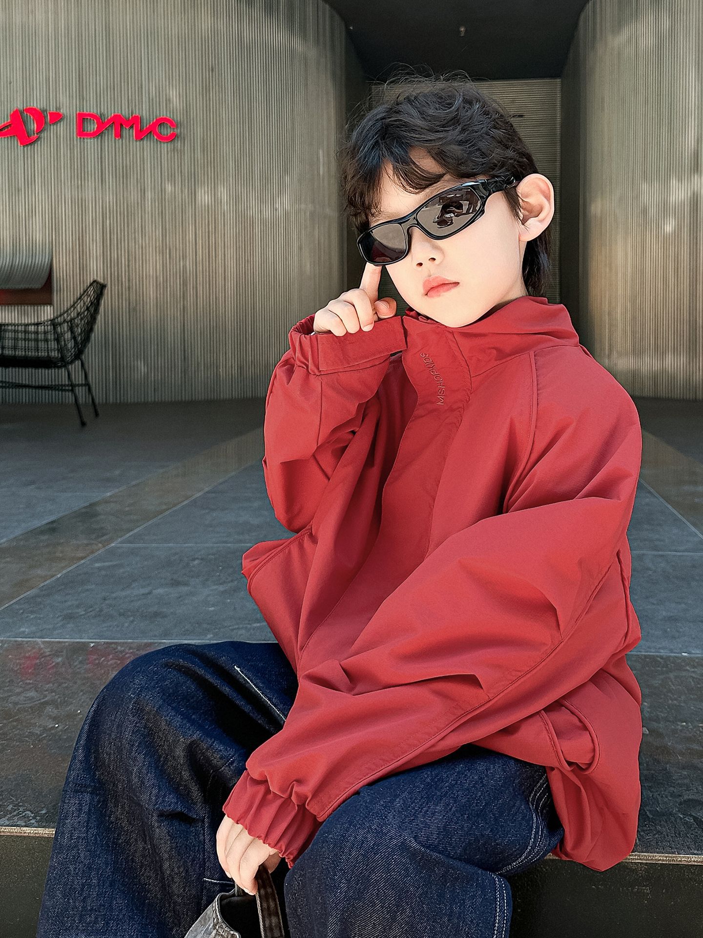 면 소재 아동용 가을 자켓, 한국 스타일 2025 신상 가을 아동복, 빨간색 자수 아기 스포츠 상의, 트렌디
