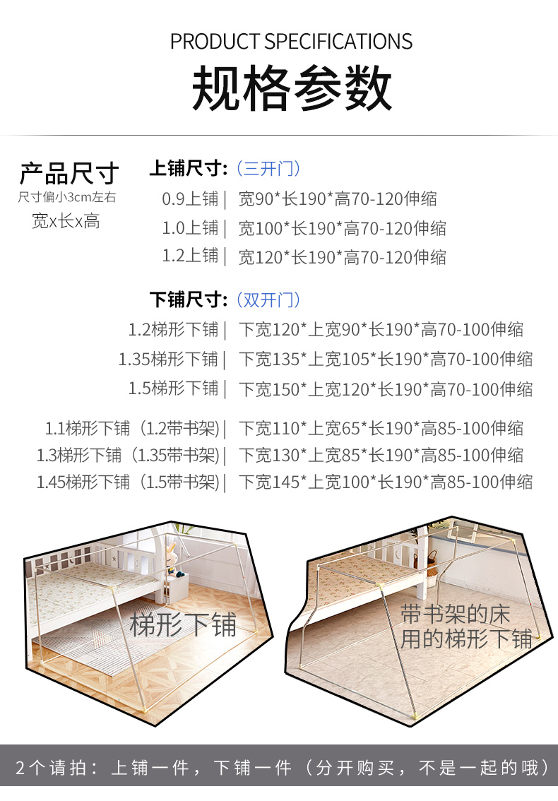 • 1.3 사다리꼴 하부 침대(1.35 책장 모델): 하부 길이 130, 높이 190, 텔레스코픽 85-100