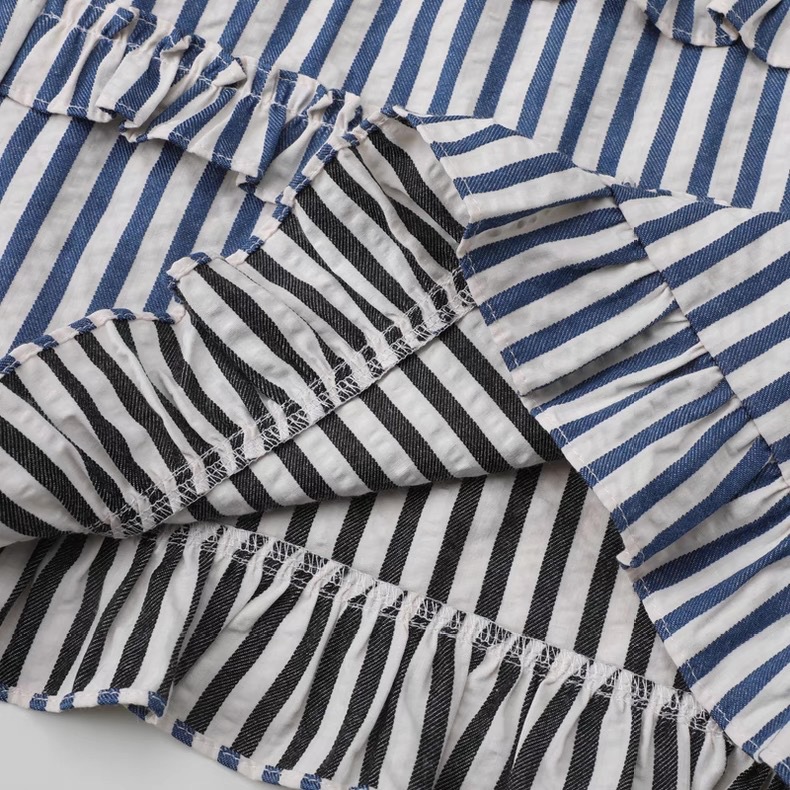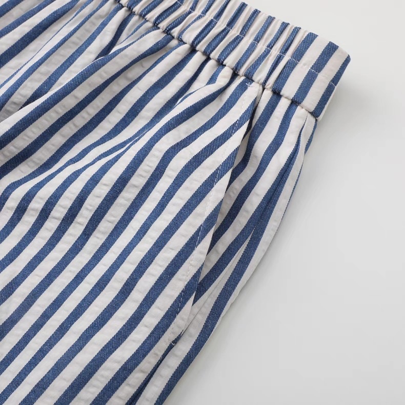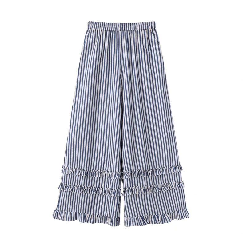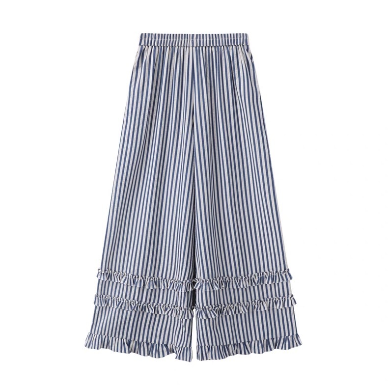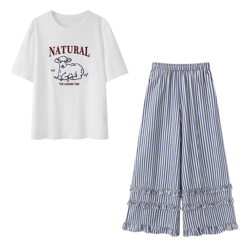 입체 양 프린트 레터링 반팔 티셔츠 + 블루 레이스 스트라이프 와이드 팬츠 투피스 세트 여성스러운 출퇴근룩