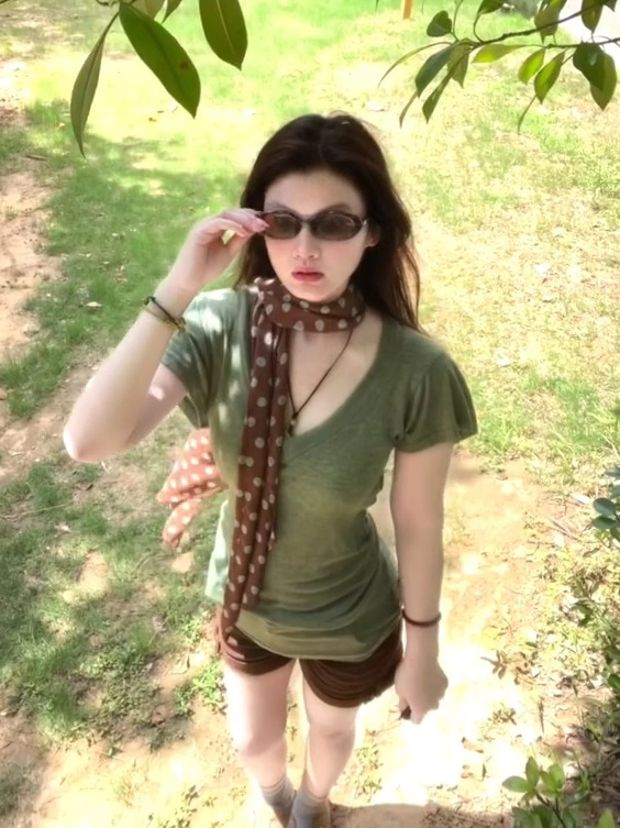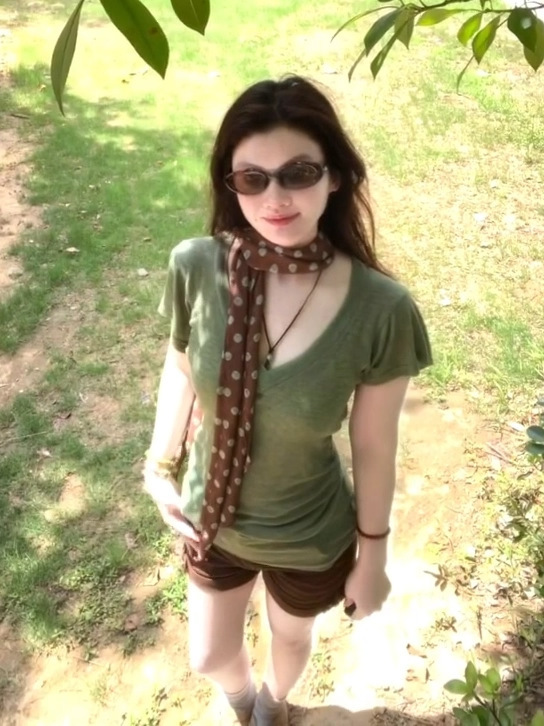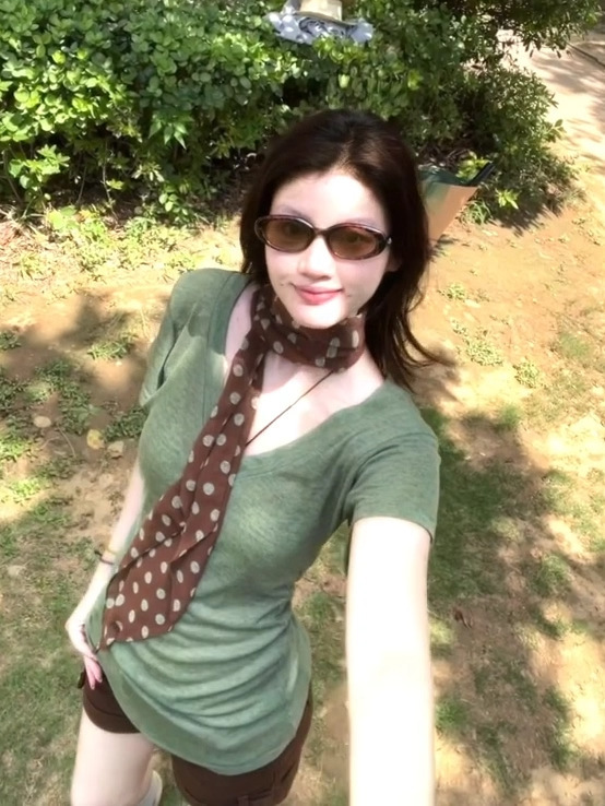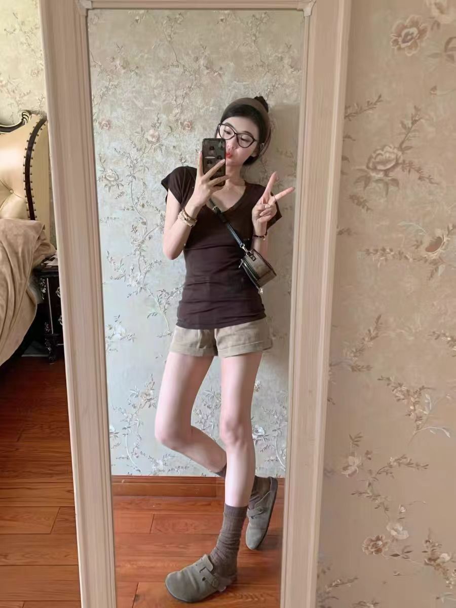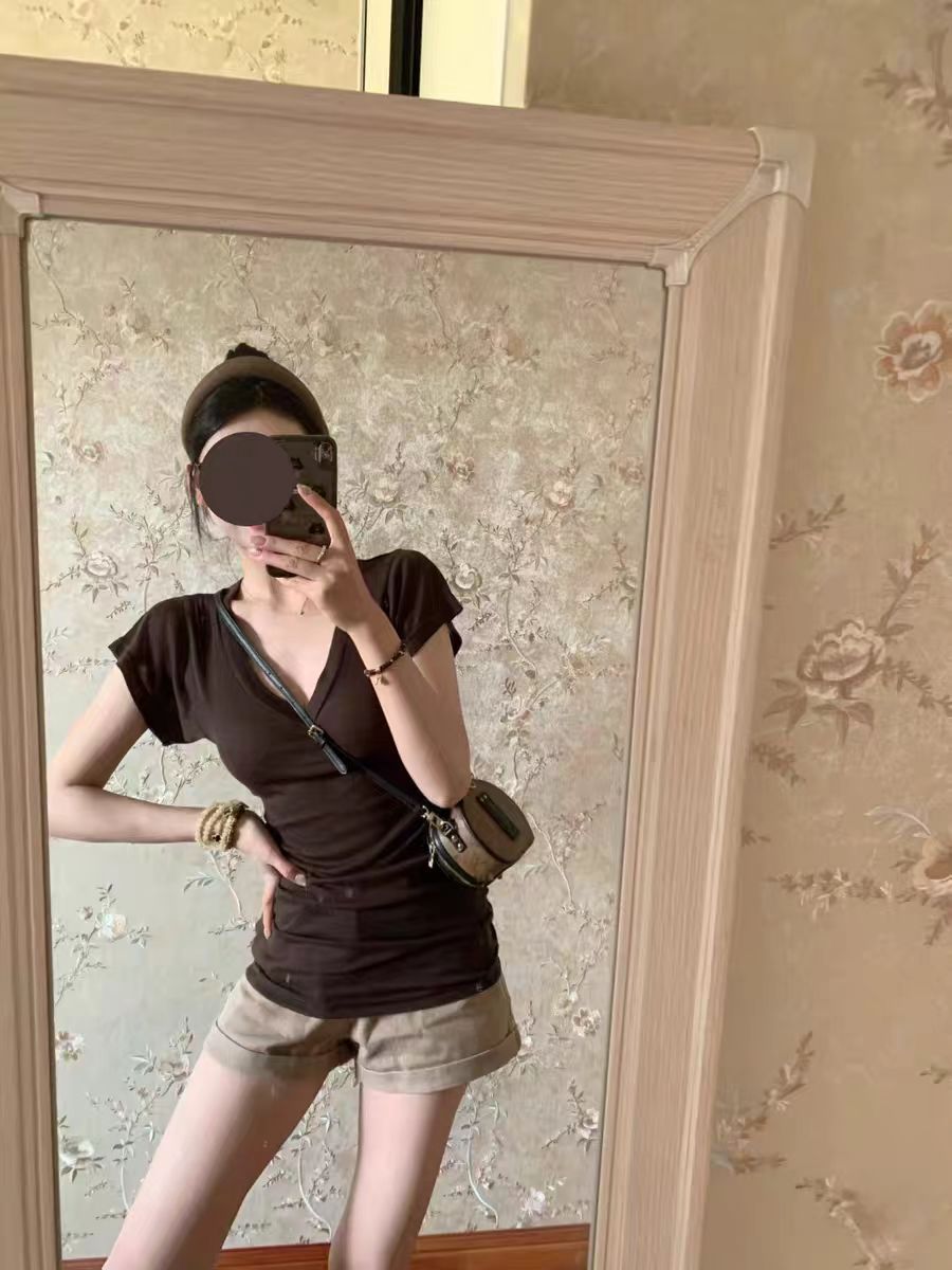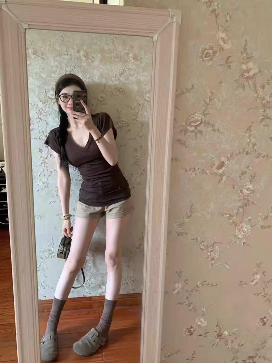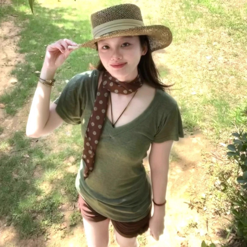 그린 V넥 숏 슬리브 티셔츠 여성용 여름 2026 신상 여름 아름다운 룩 독특한 슬림핏 베이스탑스토어 가기