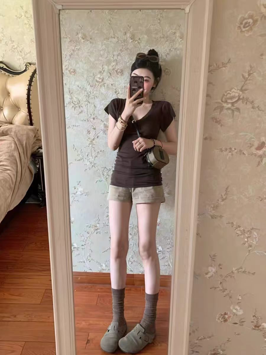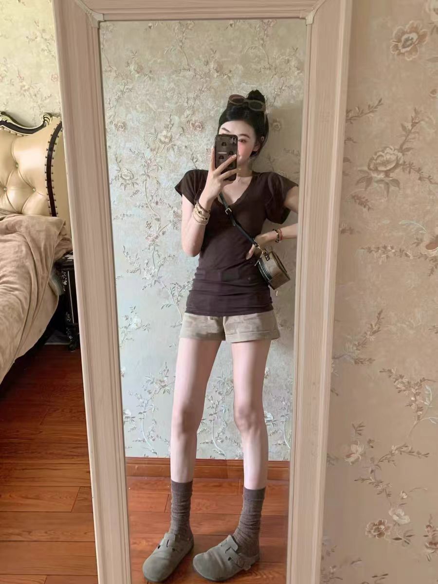 그린 V넥 숏 슬리브 티셔츠 여성용 여름 2026 신상 여름 아름다운 룩 독특한 슬림핏 베이스탑