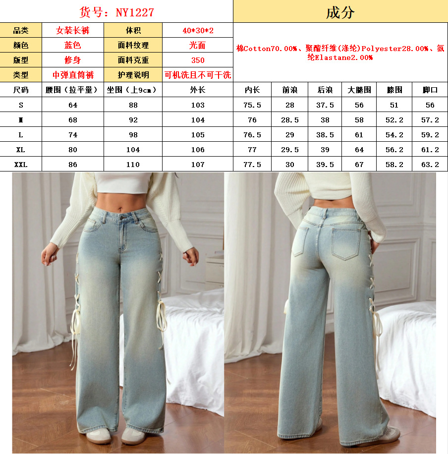 2025 새로운 캐주얼 와이드 레그 청바지 루즈핏 라벨 여성 패션 데님 사이드 허리 리본