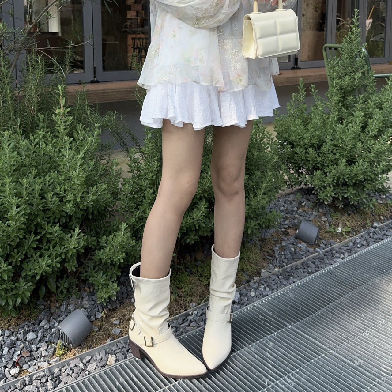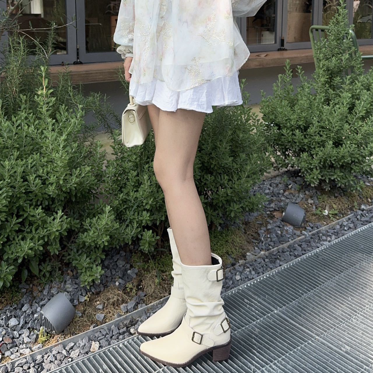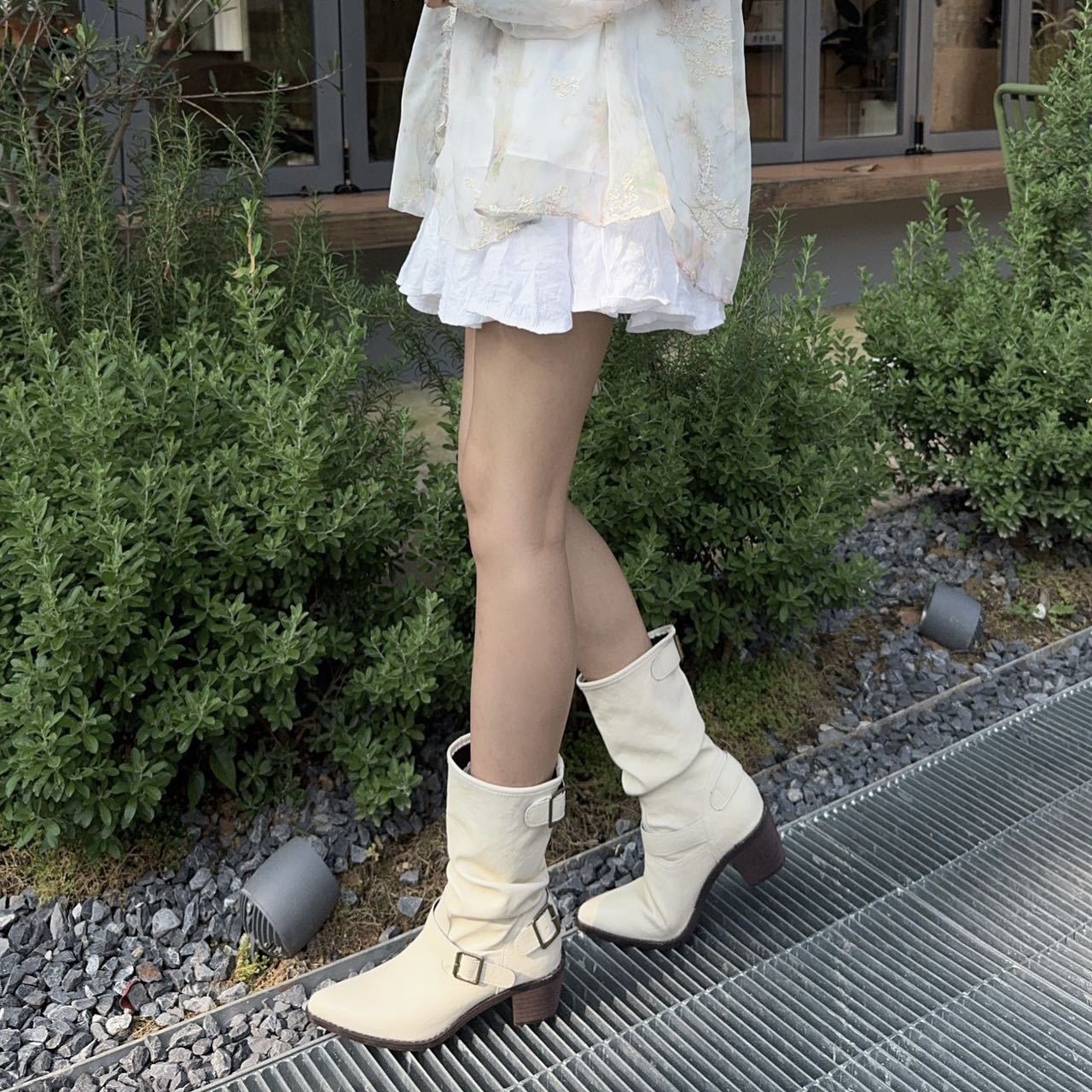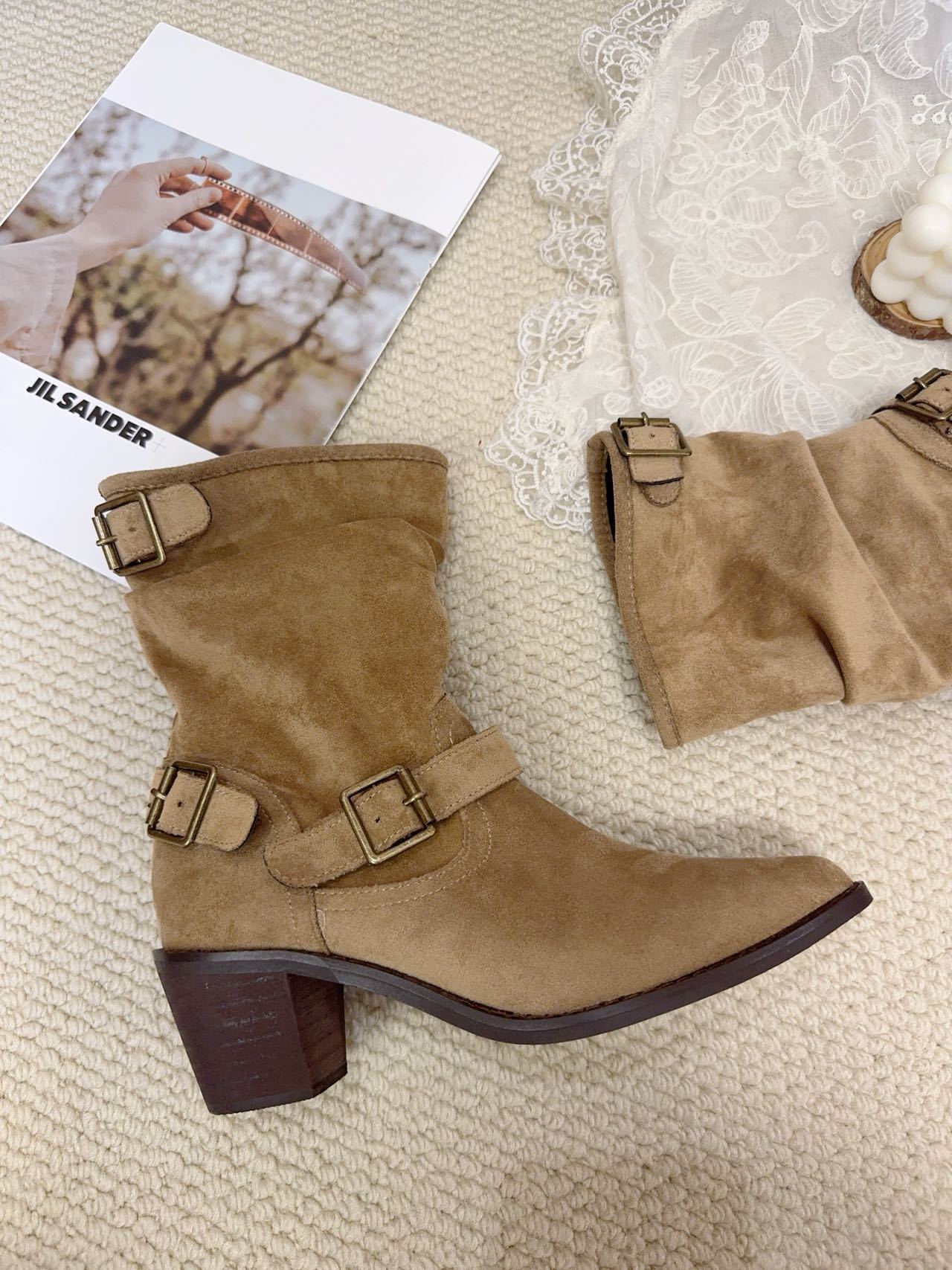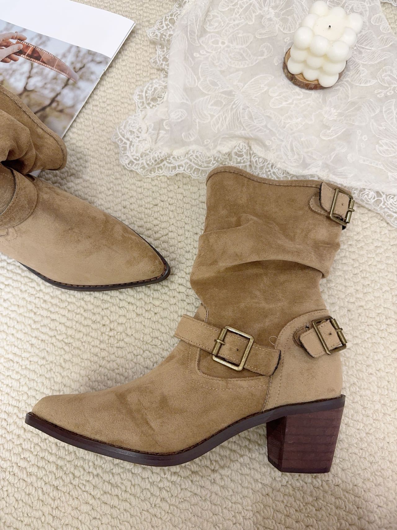 여성을위한 레트로 스웨이드 벨트 버클 두꺼운 굽 미드 튜브 부츠 2025 뉴 웨스턴 카우보이 다목적 슬리밍 핫 소녀 스택 부츠스토어 가기