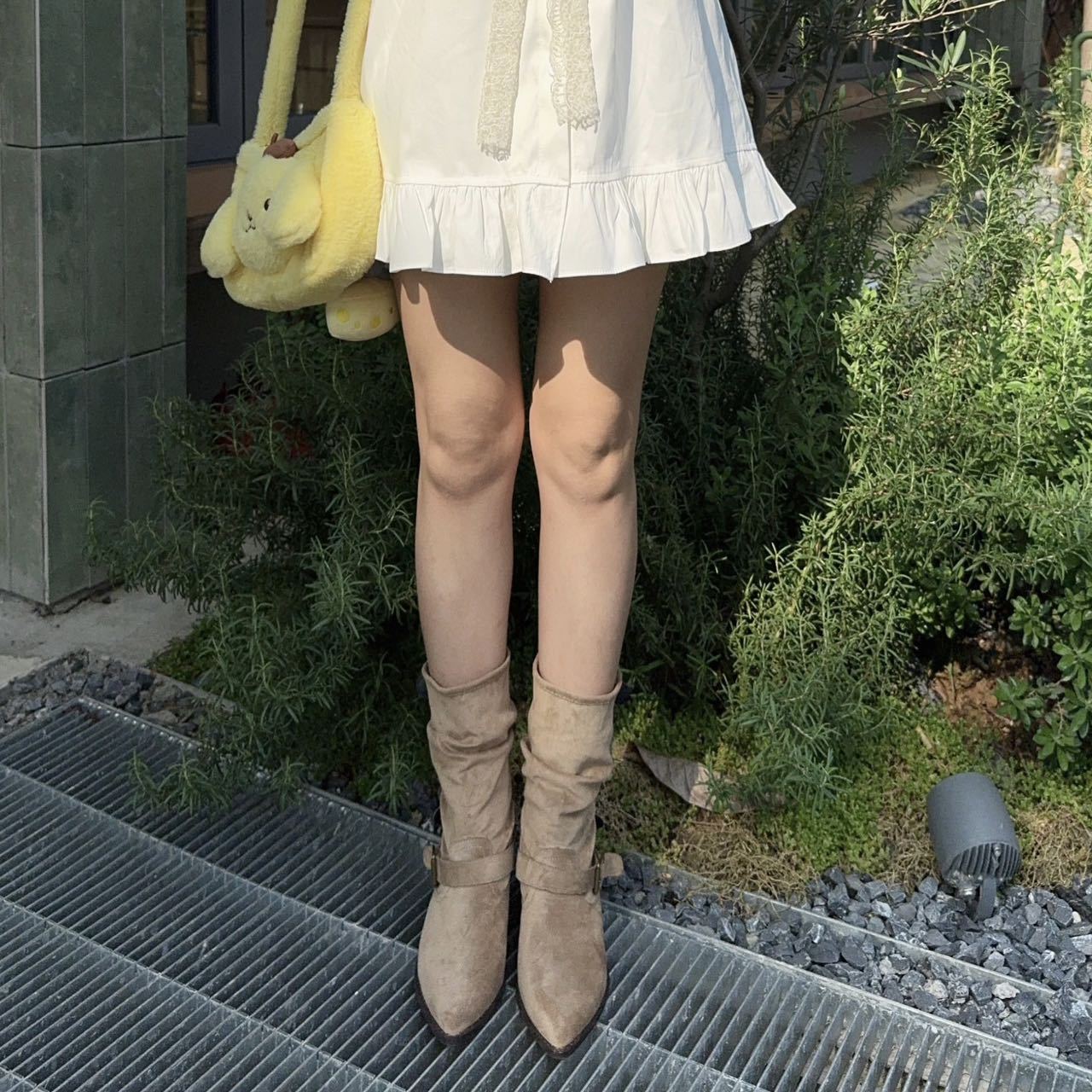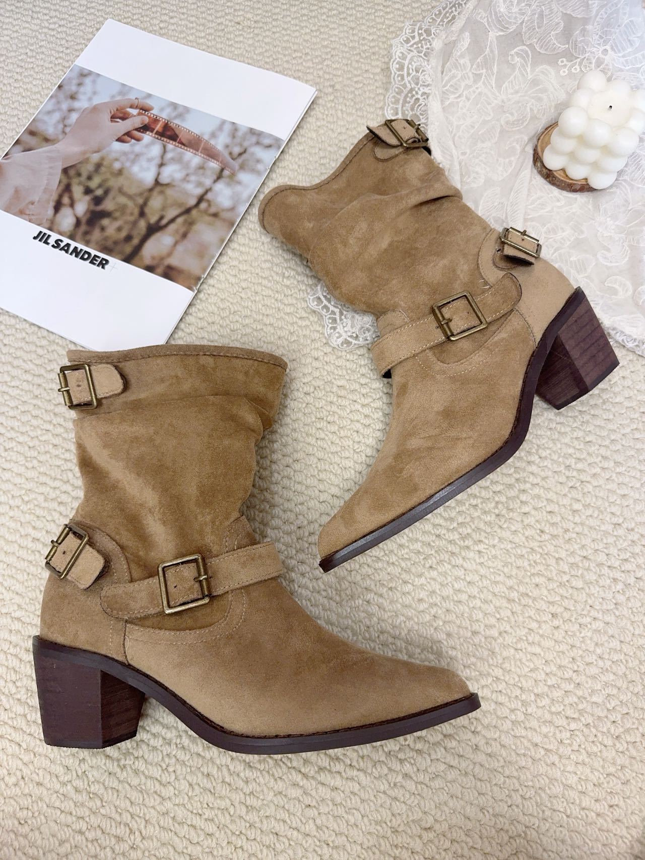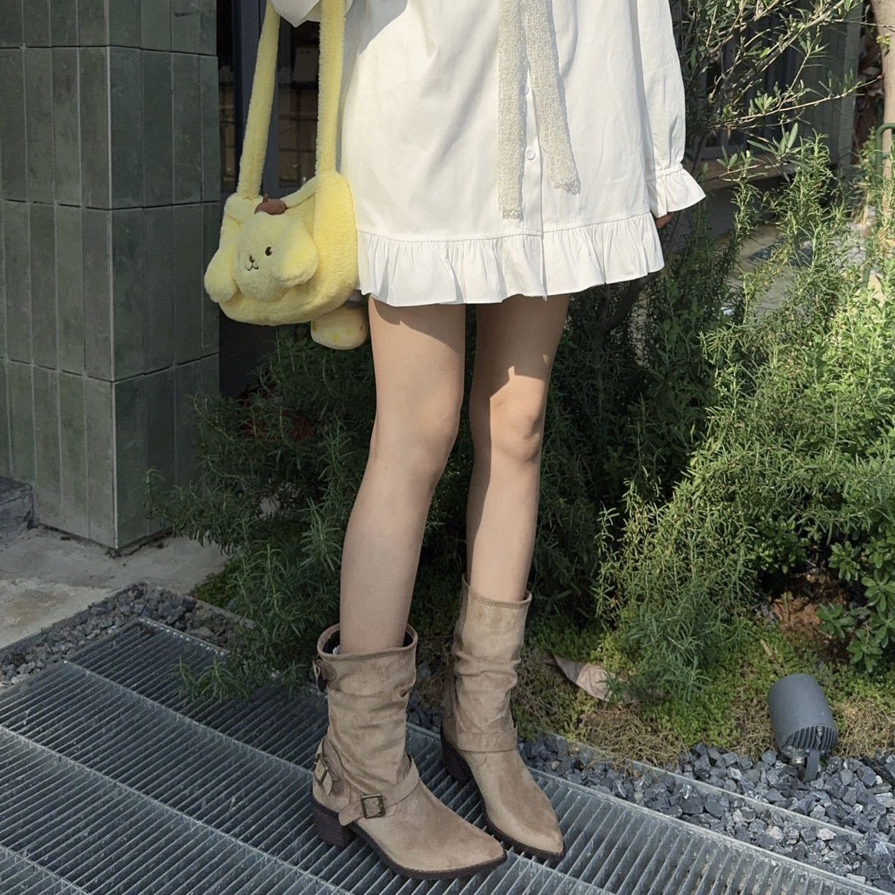 여성을위한 레트로 스웨이드 벨트 버클 두꺼운 굽 미드 튜브 부츠 2025 뉴 웨스턴 카우보이 다목적 슬리밍 핫 소녀 스택 부츠