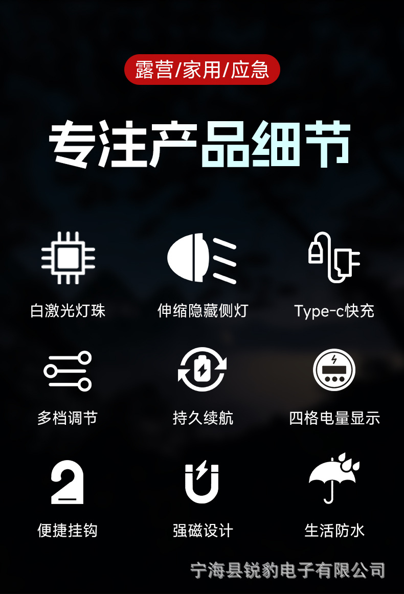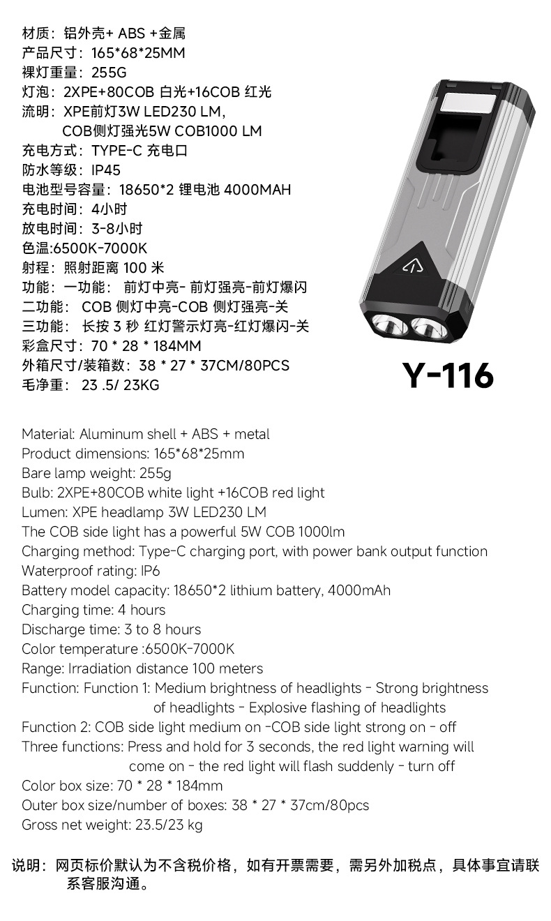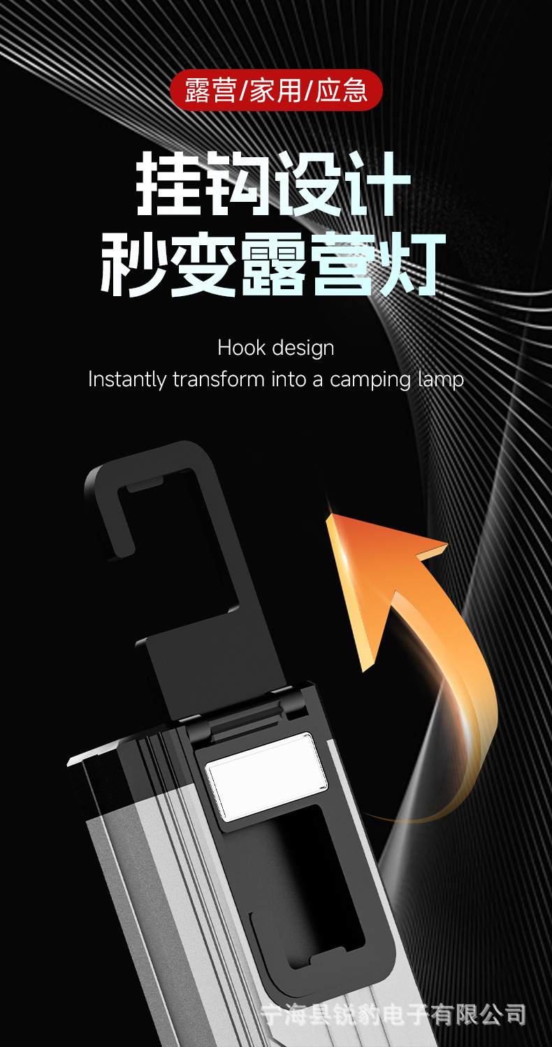 • Y-116 작업등 표준 모델(베어 램프 + 18650 리튬 배터리 2개 내장 + 데이터 케이블 + 컬러 박스) 강력한 자석 + 숨겨진 후크 + 무단계 디밍