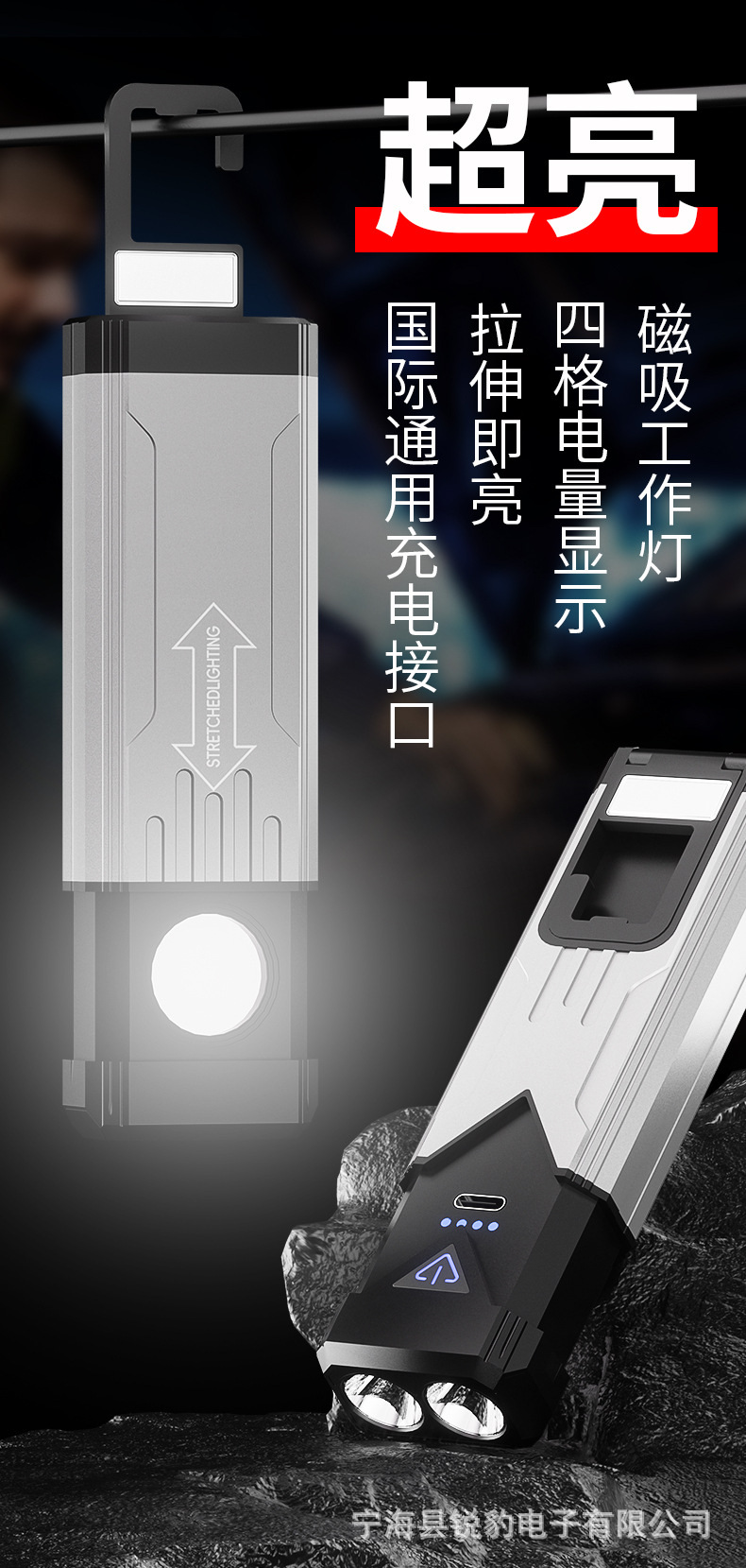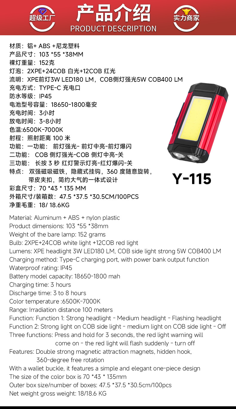 • Y-115 작업등 표준 모델(베어 램프 + 내장 18650 리튬 배터리 + 데이터 케이블 + 컬러 박스) 이중 강력 자석 + 숨겨진 후크
