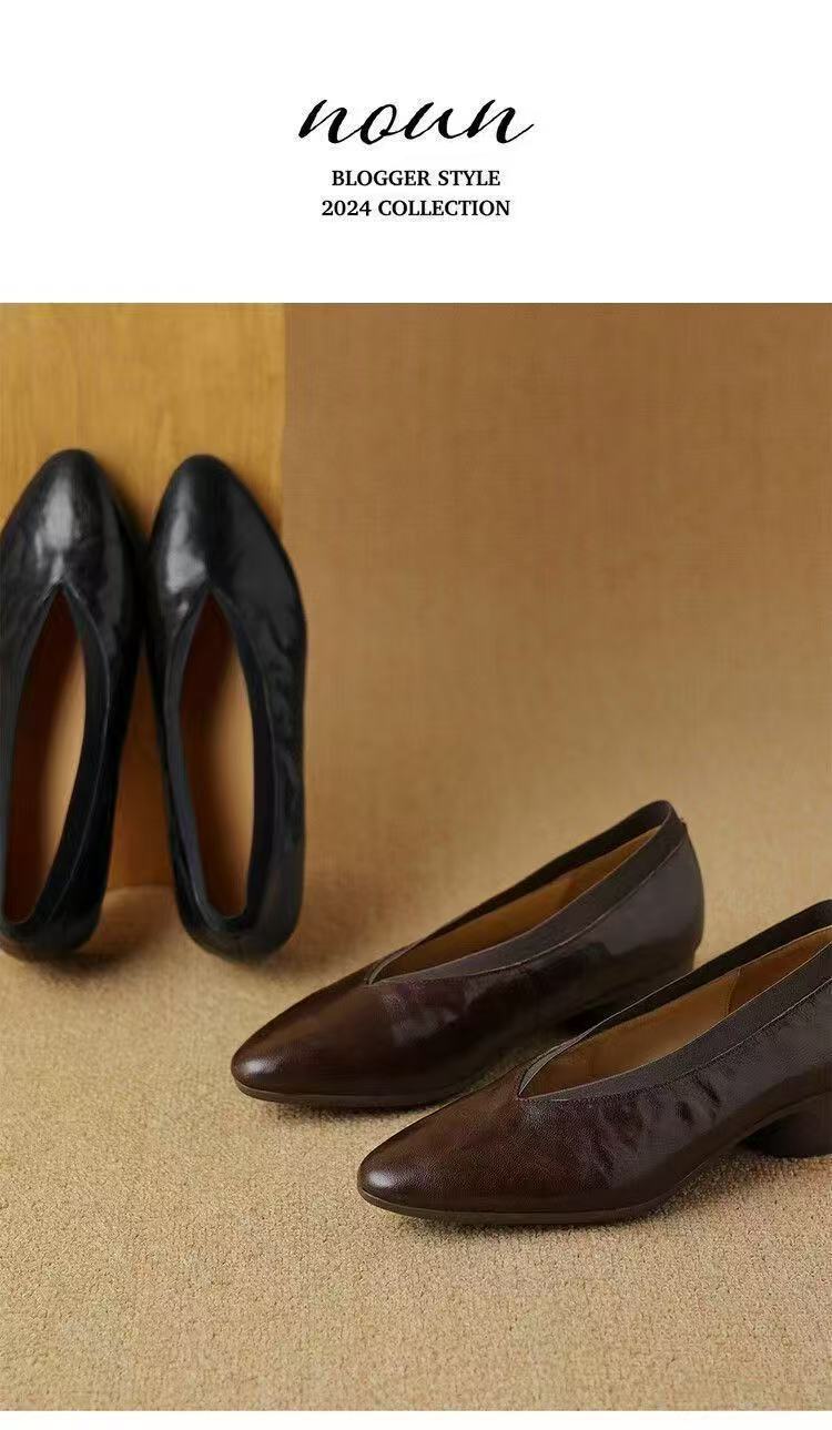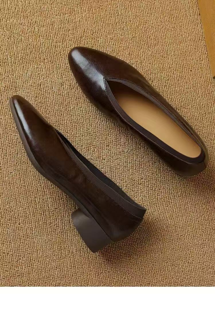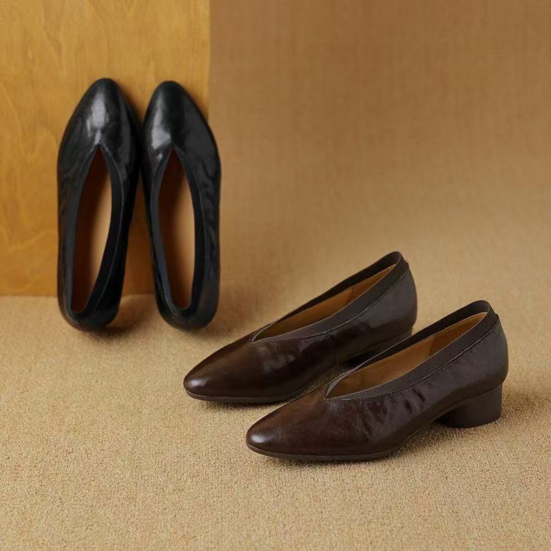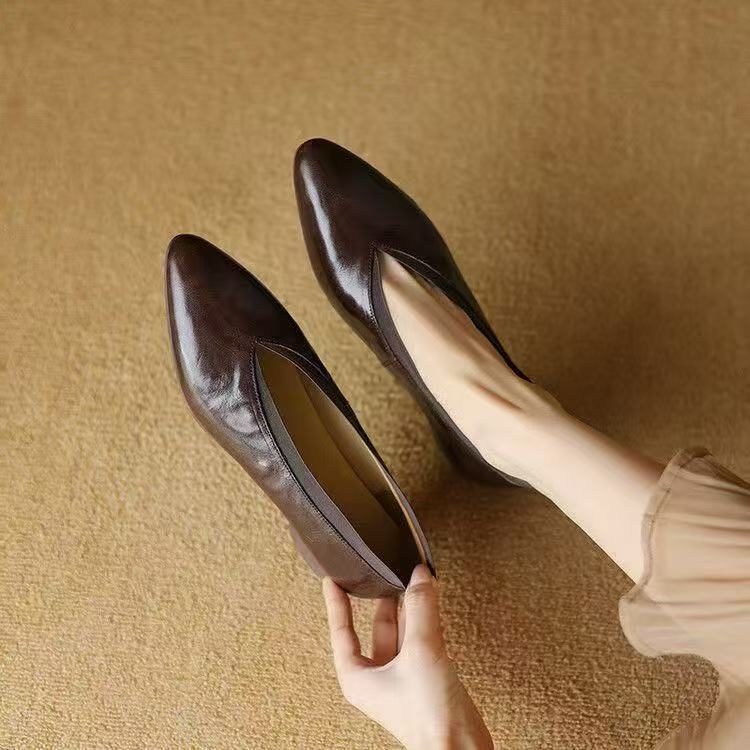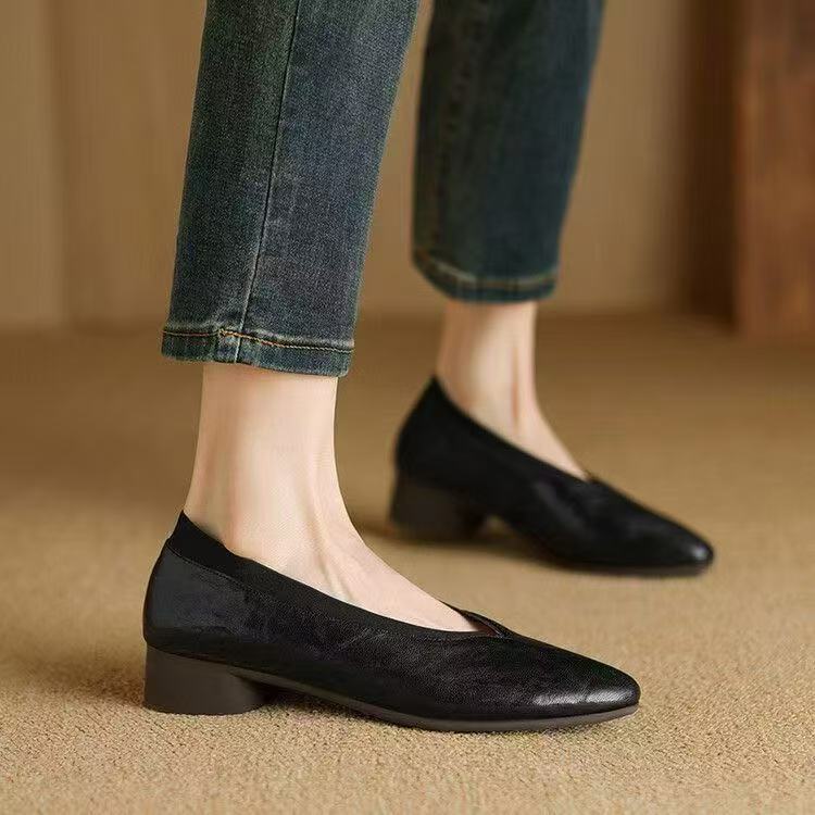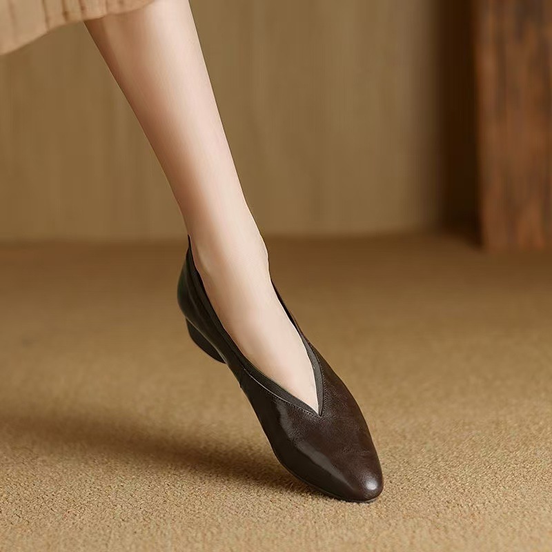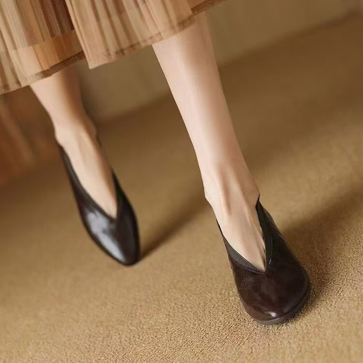 여성을위한 프랑스 스타일 복고풍 뾰족한 탄성 V 입 할머니 신발 2025 봄 새로운 스타일 진짜 부드러운 가죽 슬립 온 단순스토어 가기