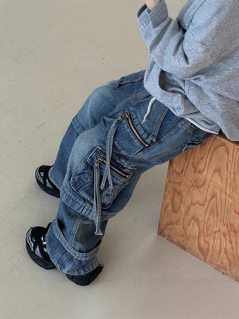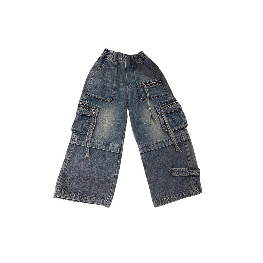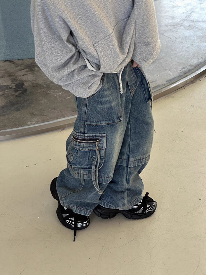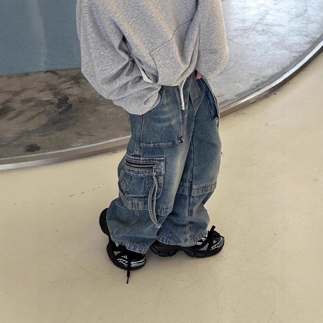 남아용 하이 스트리트 청바지 2025 봄, 가을 중공업 바지 어린이 기능성 바지는 다리 모양을 트렌디하게 보여줍니다.스토어 가기