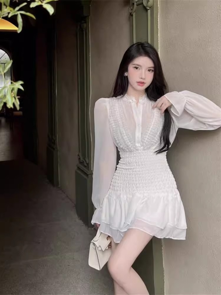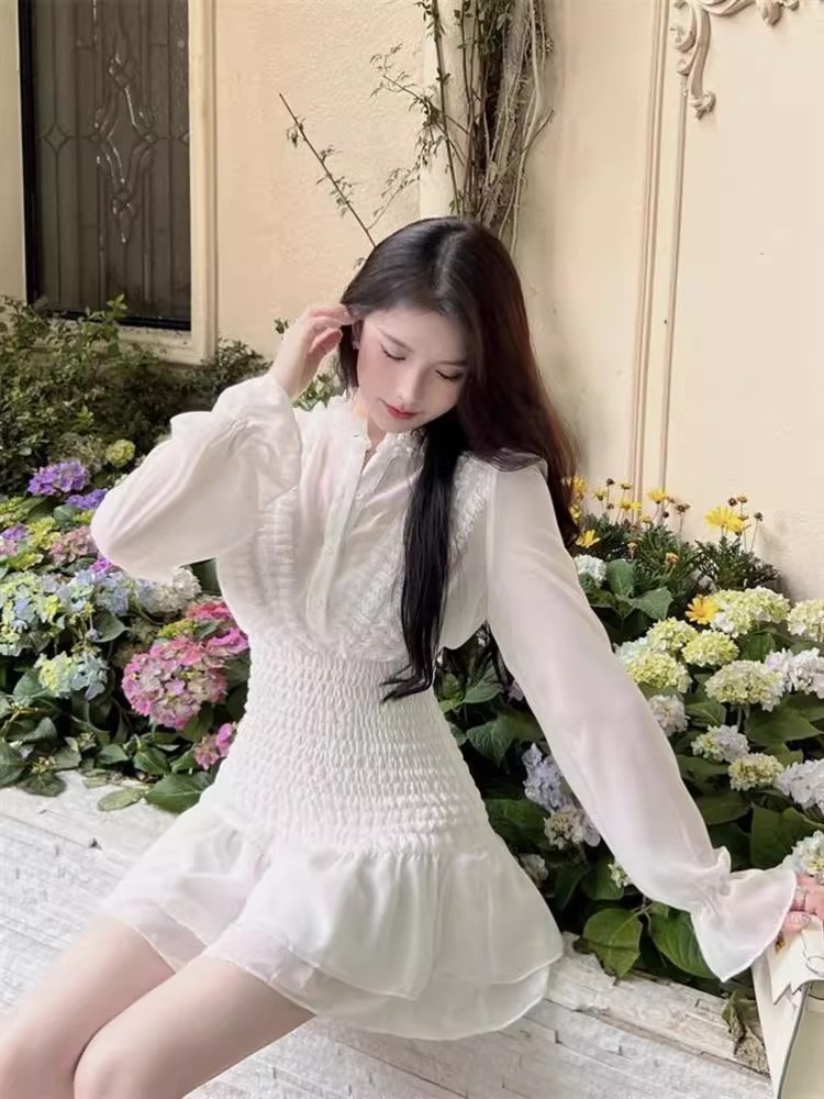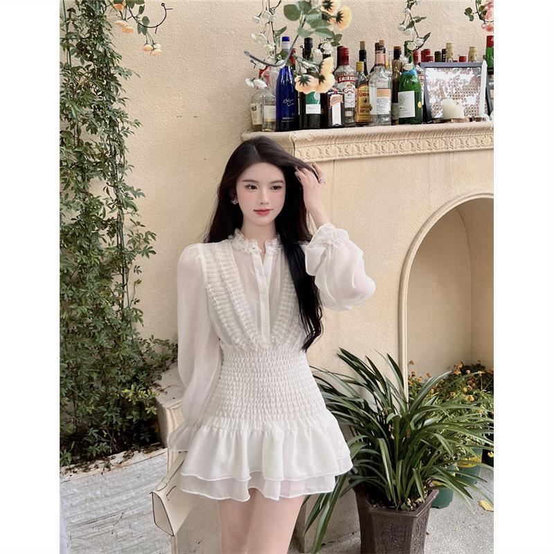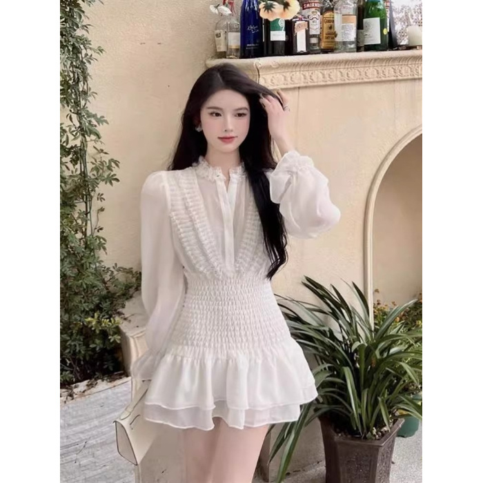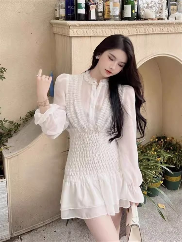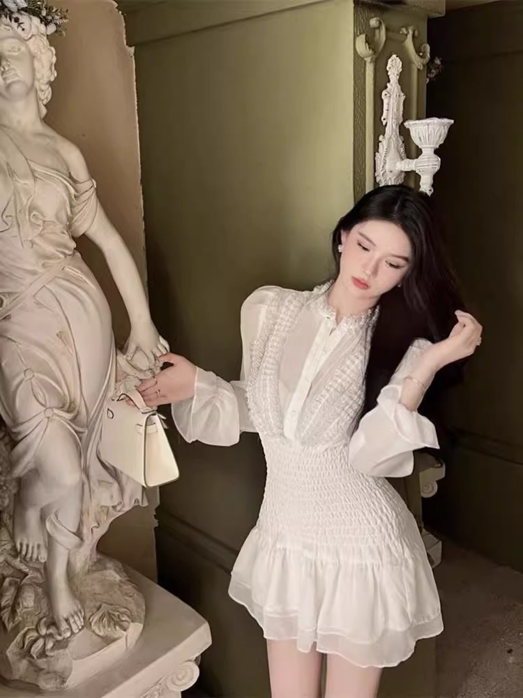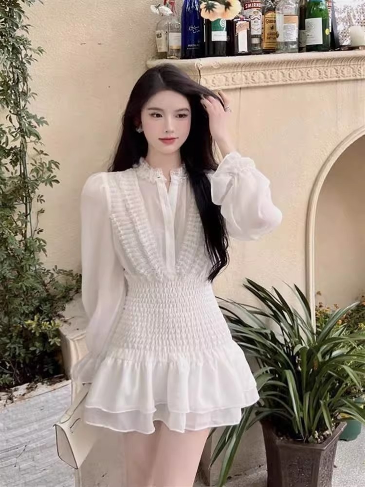 여성을 위한 프렌치 화이트 쉬폰 긴팔 드레스, 초봄, 작은 체형, 고급스러운 러플 허리 짧은 스커트스토어 가기